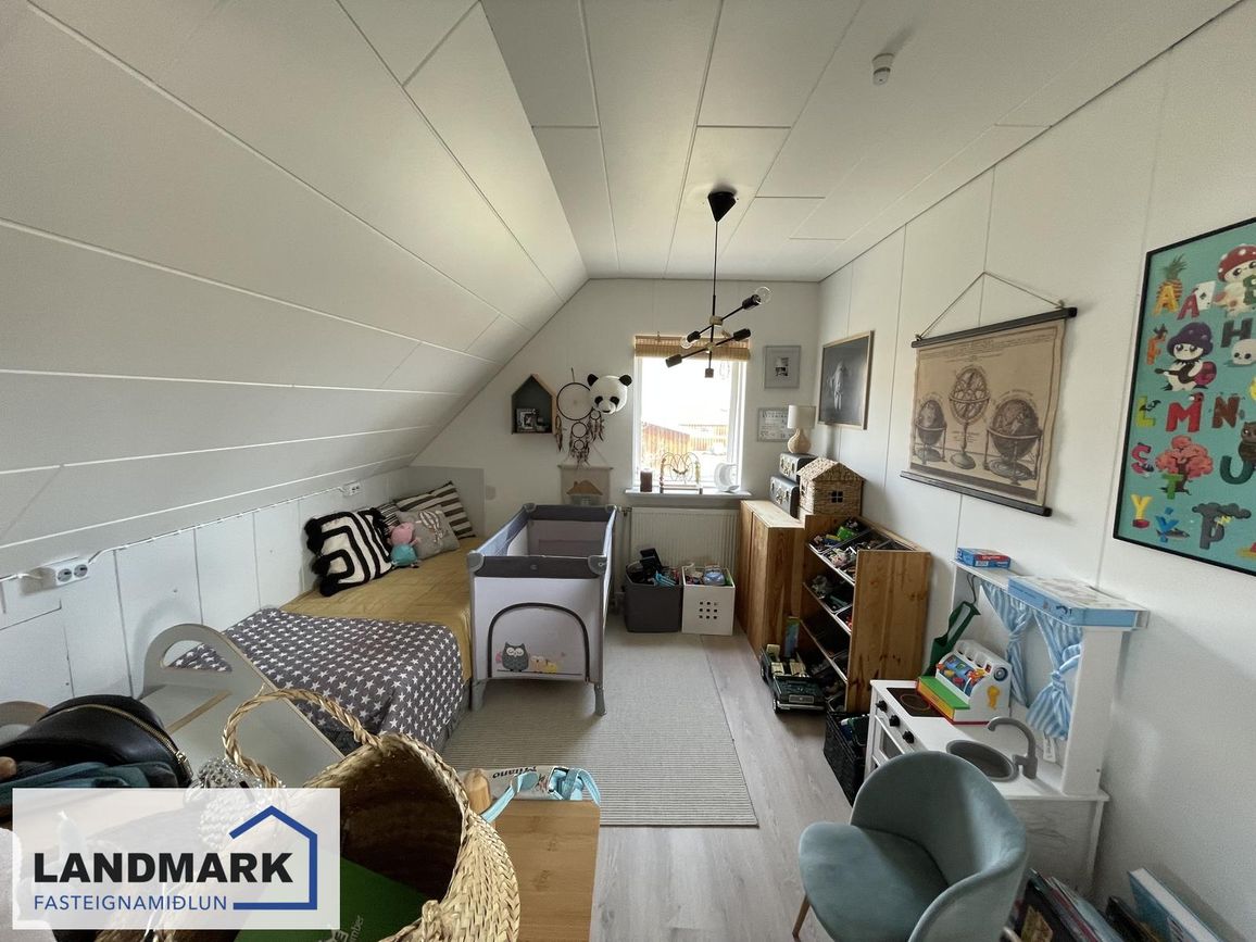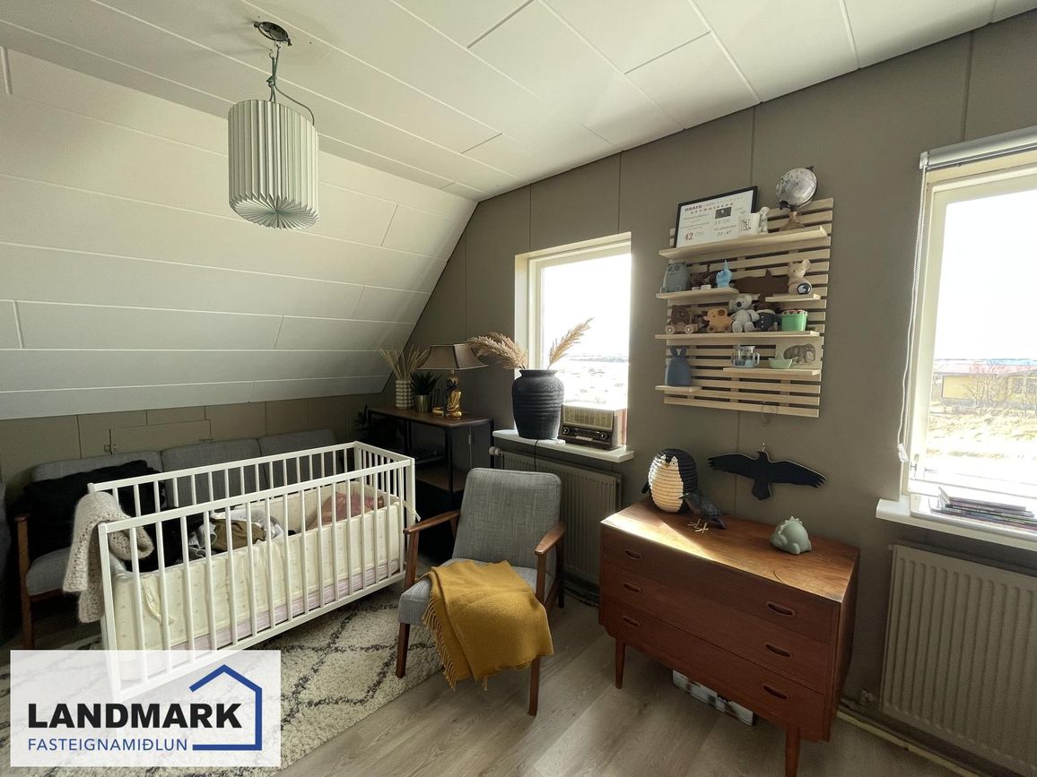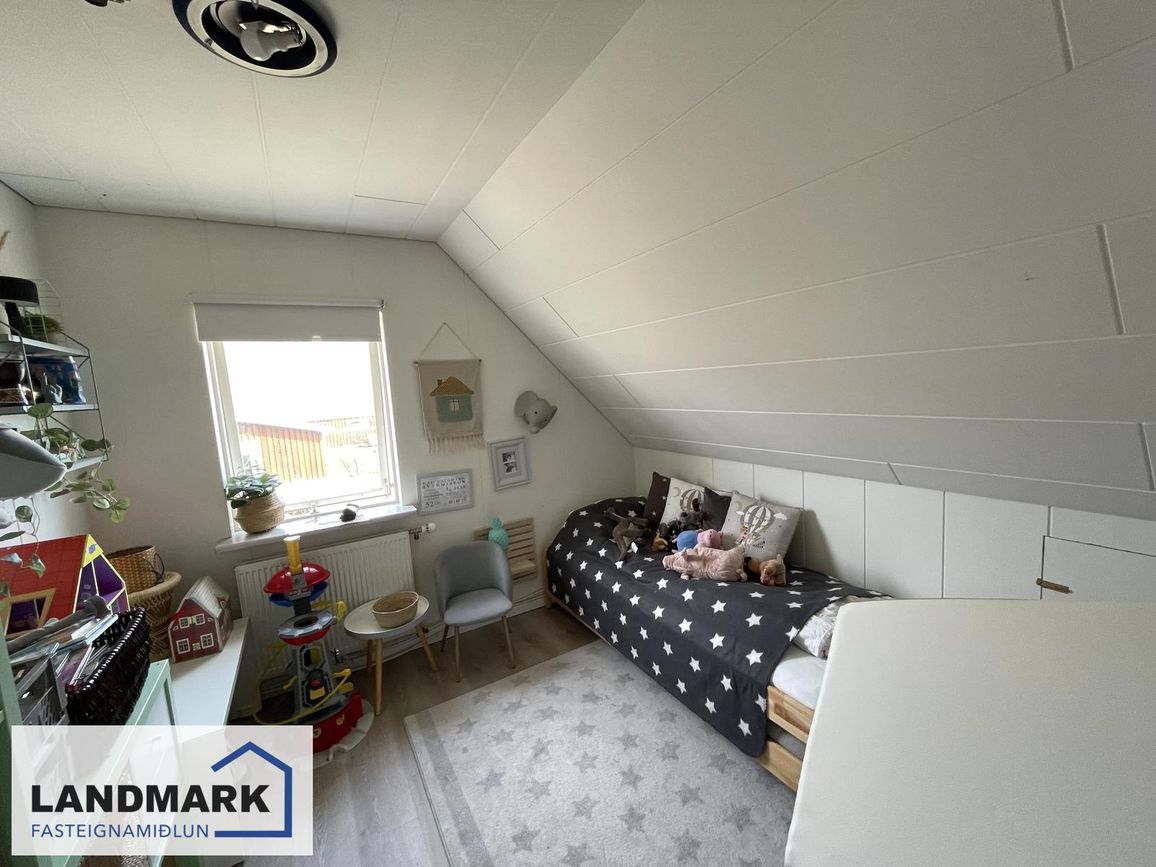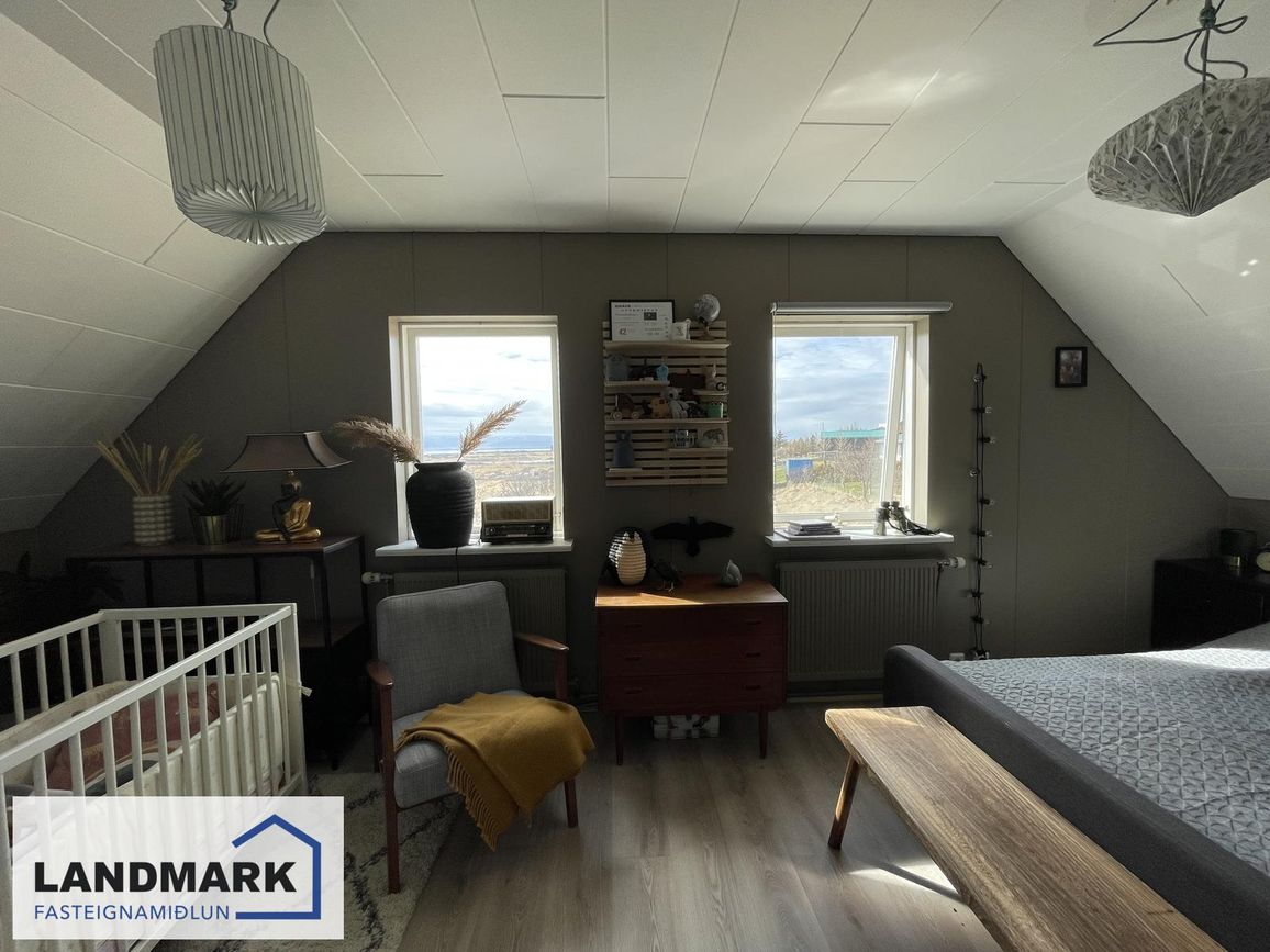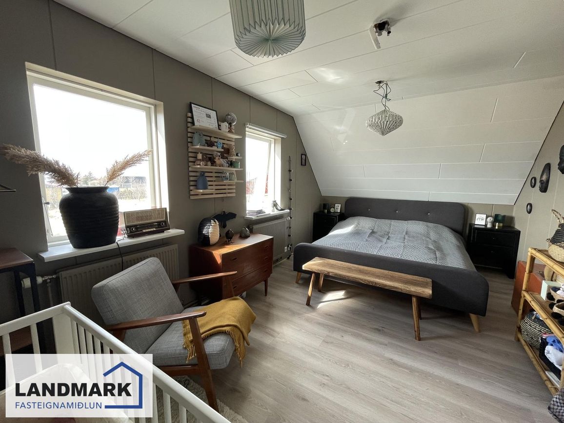 Aðalhæð: 2 svefnherbergi (annað með fataherbergi). Efri hæð: 3 svefnherbergi (eitt mjög stórt). Kjallari: 1 svefnherbergi.