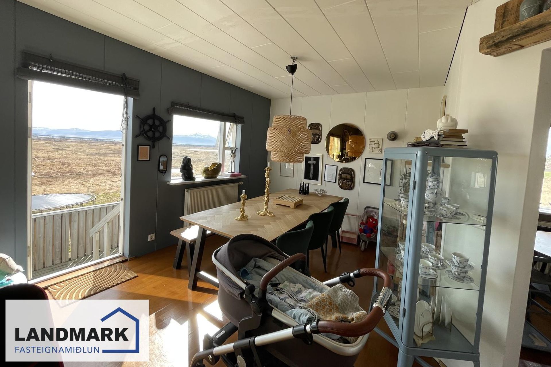 Opinn stofu- og borðstofusalur með parketgólfi og útgöngu á timburverönd.