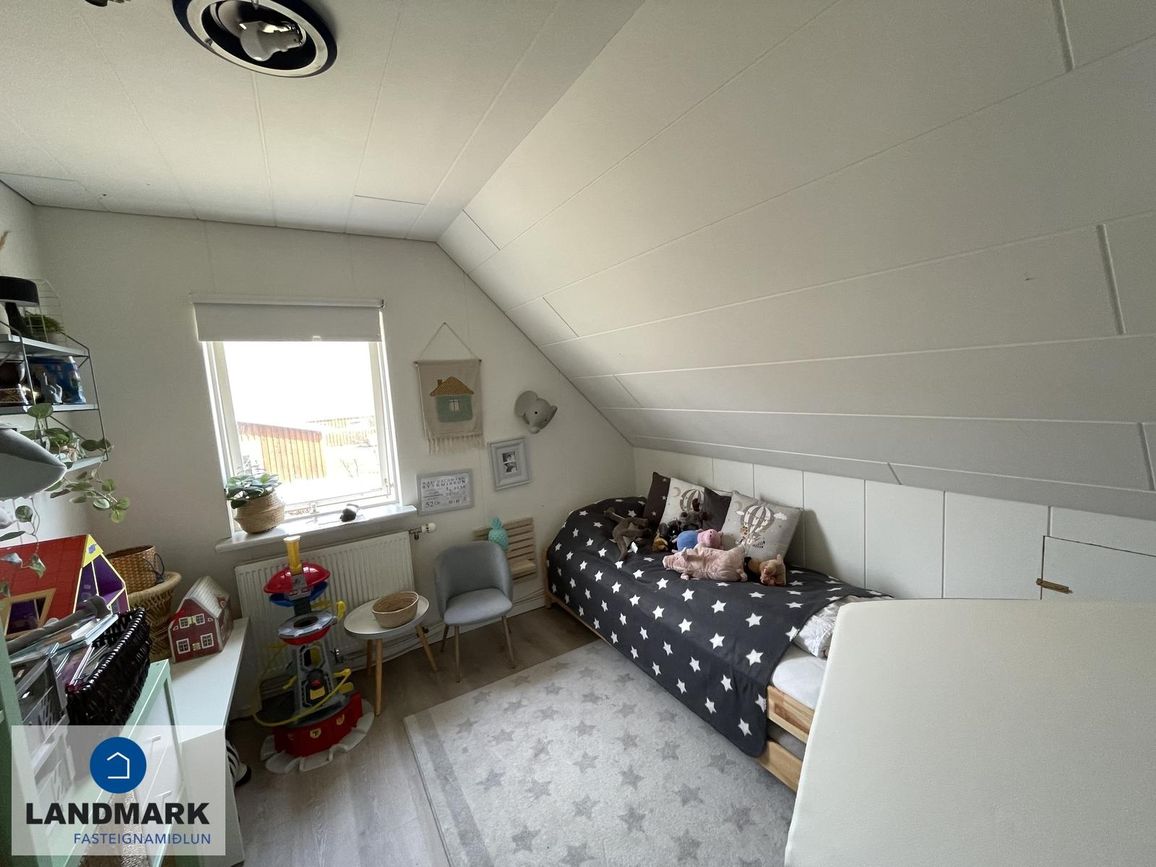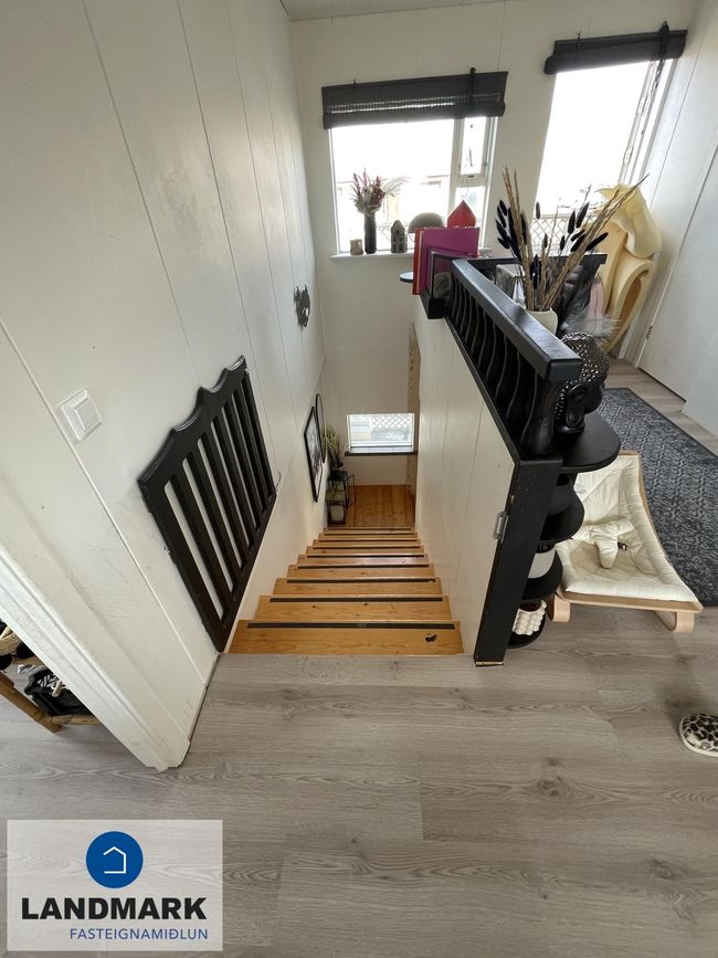 Efri hæð 96,8 fm: Timburstigi úr forstofu á aðalhæð upp á efri hæð hússins, nýlegt harðparket á efri hæð. Þrjú svefnherbergi, þar af er eitt herbergið mjög stór með fataskápum Baðherbergi með flísum á gólfi, sturtuklefa og opnanlegum glugga. Opið þvottahús með nýlegri innréttingu fyrir þvottavél og þurrkara, vaskur með skápum undir. Útgengt út á svalir.