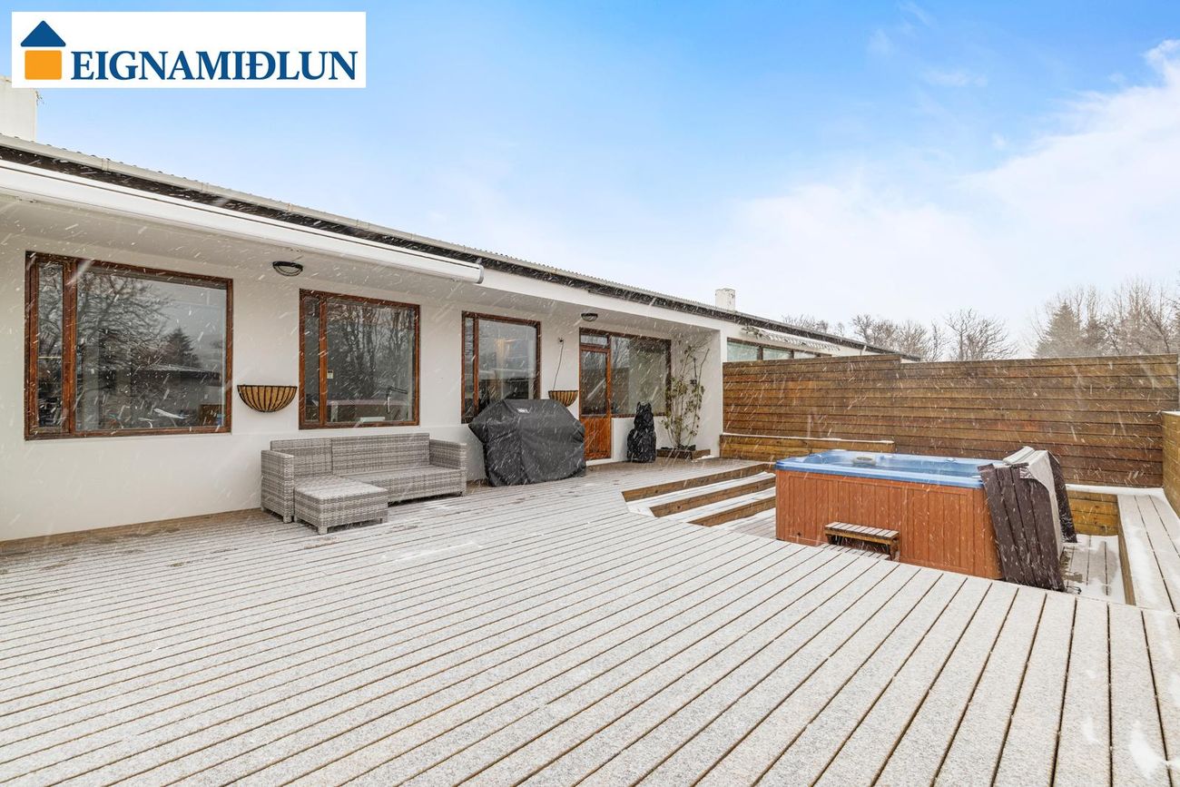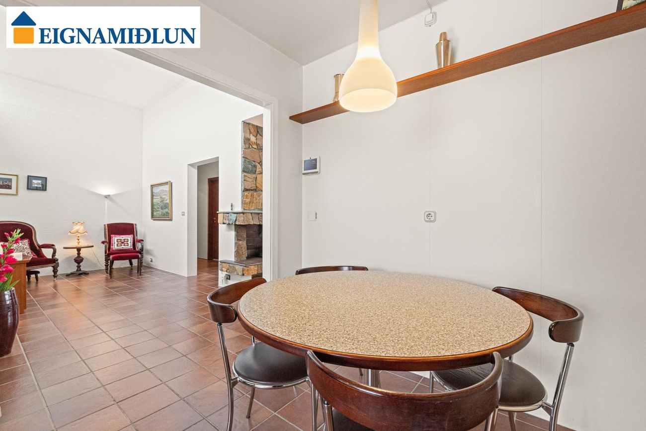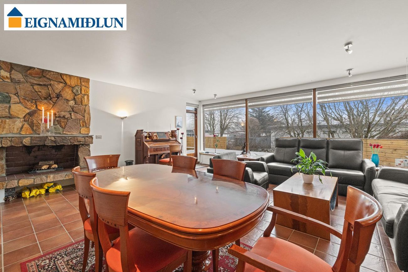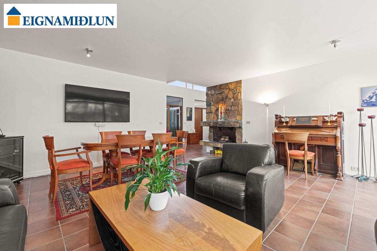 Stofa/borðstofa: Stórar og bjartar samliggjandi stofur til suðurs með stórum gluggum. Mjög fallegur arinn með drápuhlíðargrjóti er í stofum. Frá stofum er gengið út í garð til suðurs, þar er nýleg mjög stór timburverönd og heitur pottur. Geymsluskúr er í garði.
