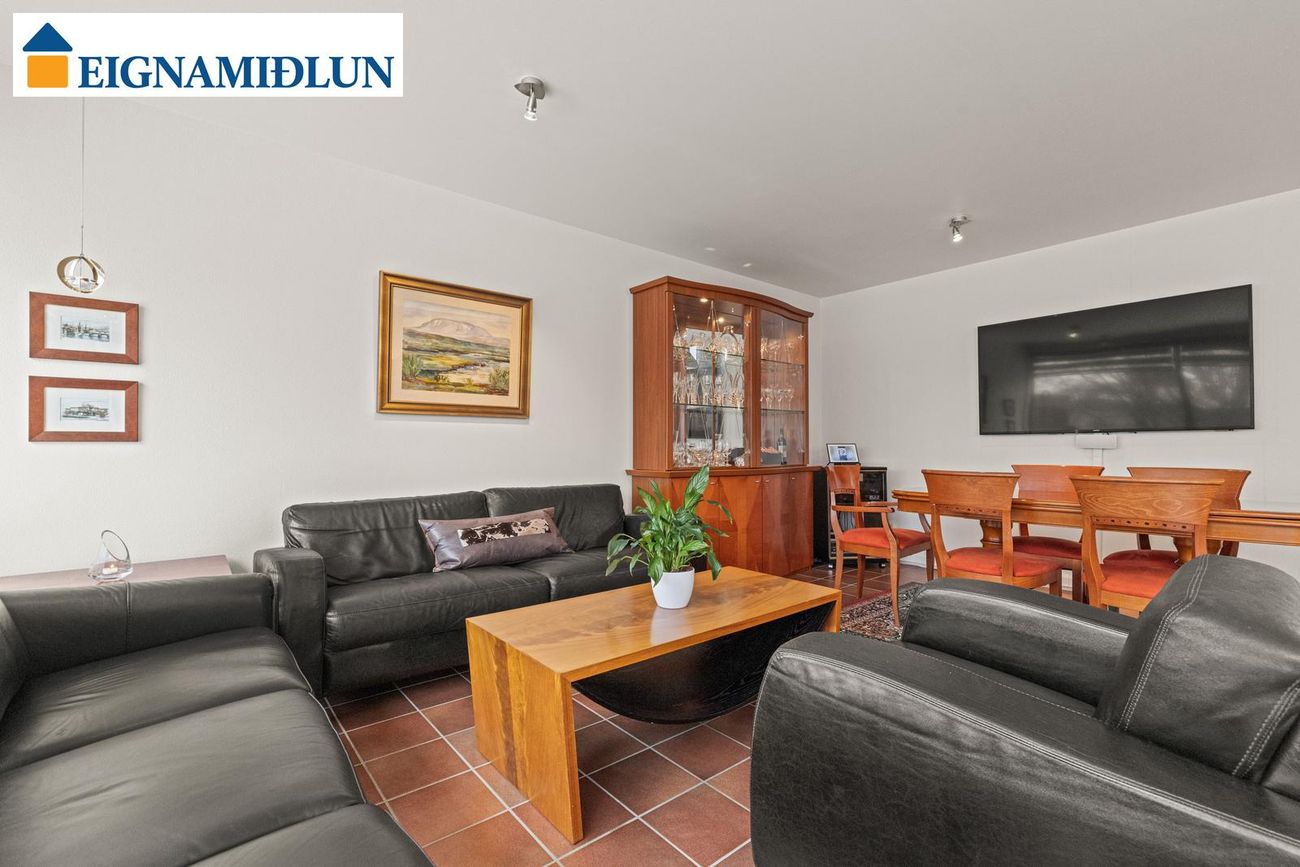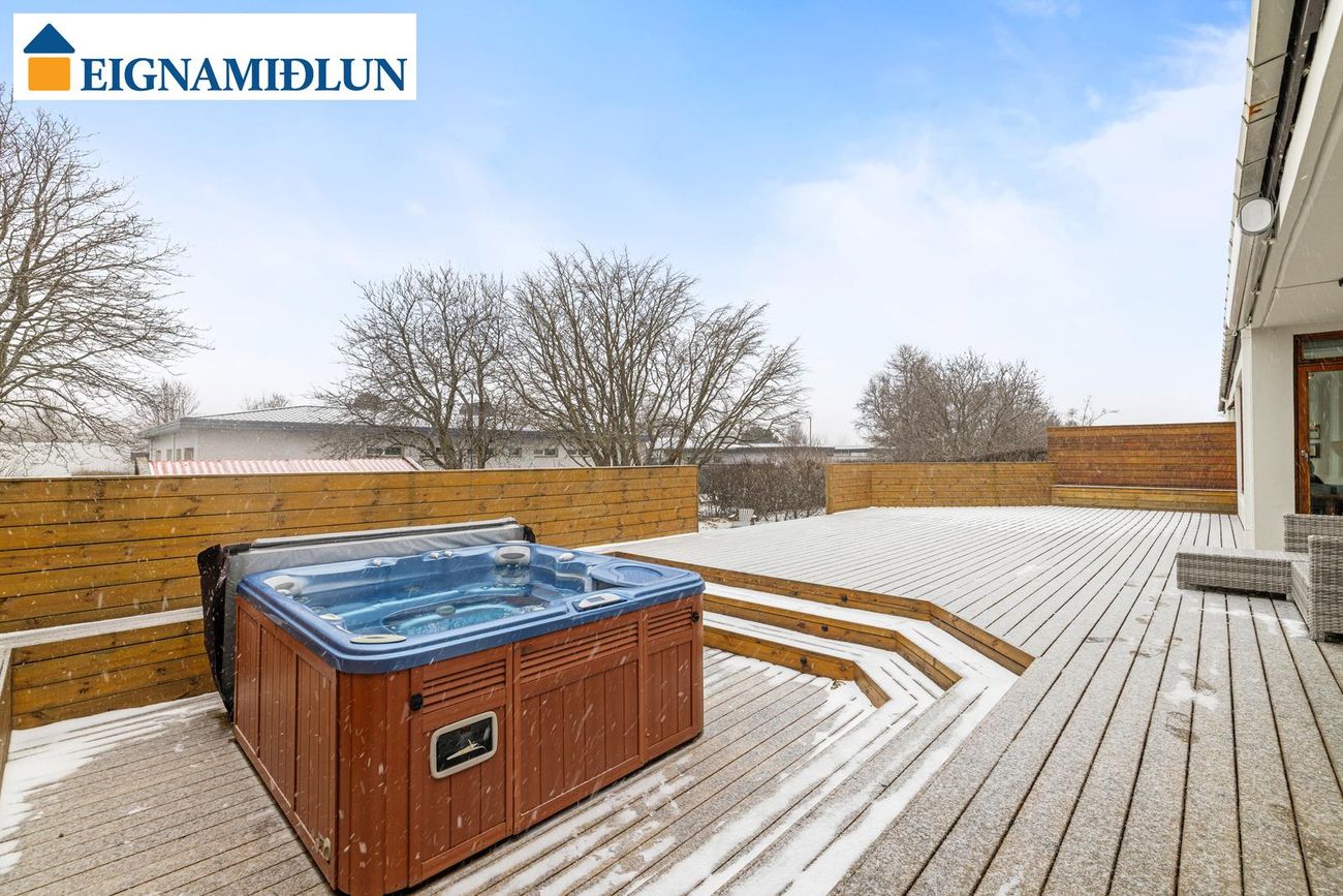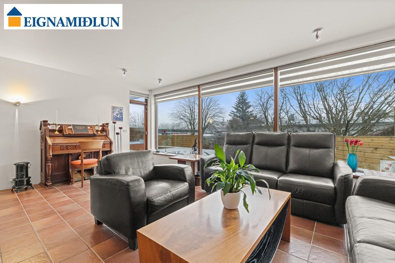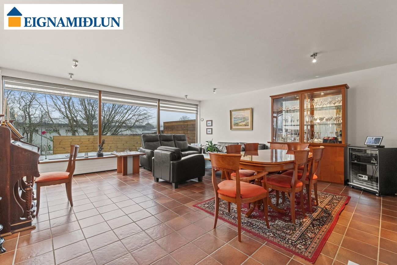 Stofa/borðstofa: Stórar og bjartar samliggjandi stofur til suðurs með stórum gluggum. Mjög fallegur arinn með drápuhlíðargrjóti er í stofum. Frá stofum er gengið út í garð til suðurs, þar er nýleg mjög stór timburverönd og heitur pottur. Geymsluskúr er í garði.
