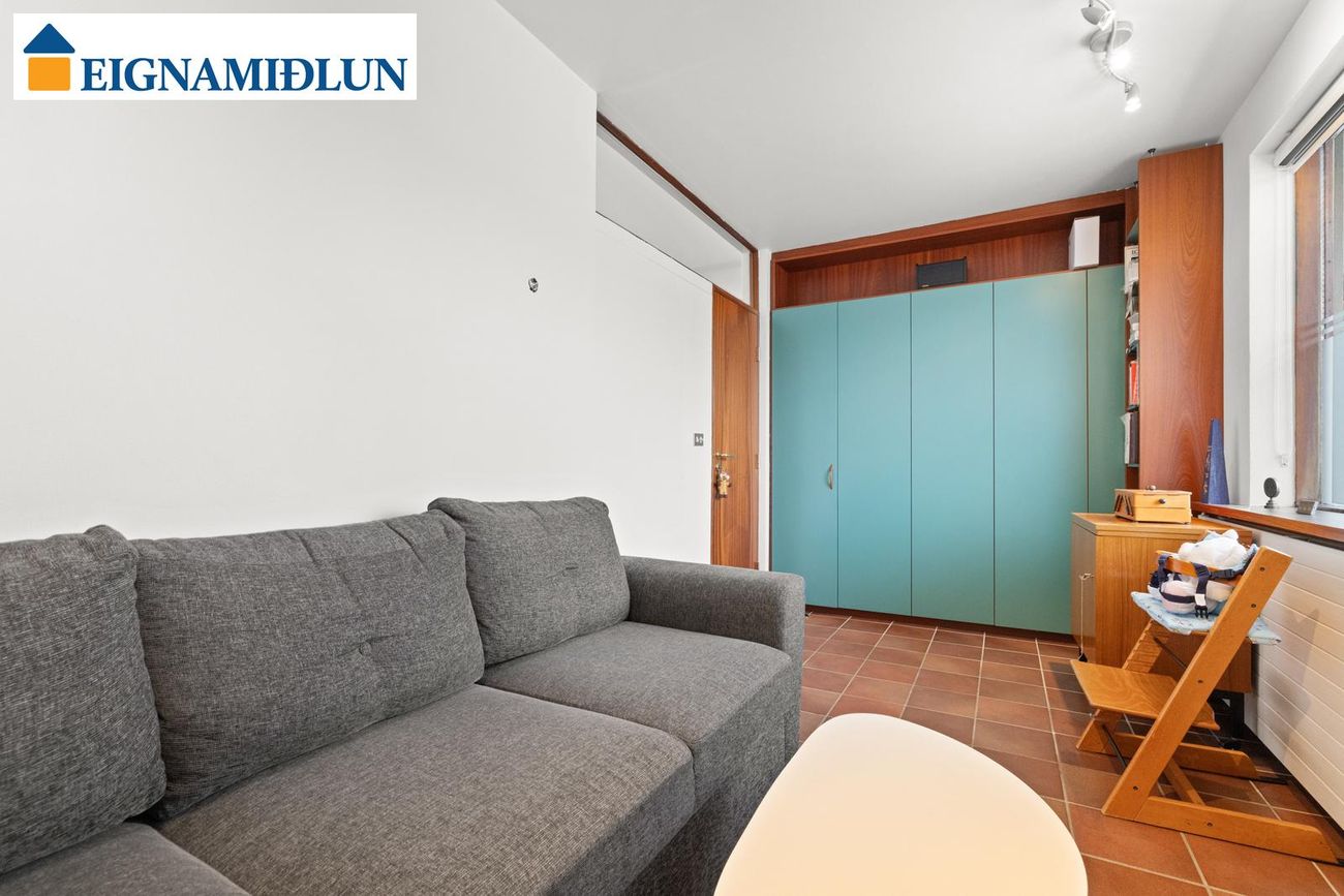Herbergi (2): Mjög rúmgott flísalagt herbergi (Eru tvö herbergi samkvæmt teikningu væri auðvelt að breyta aftur).