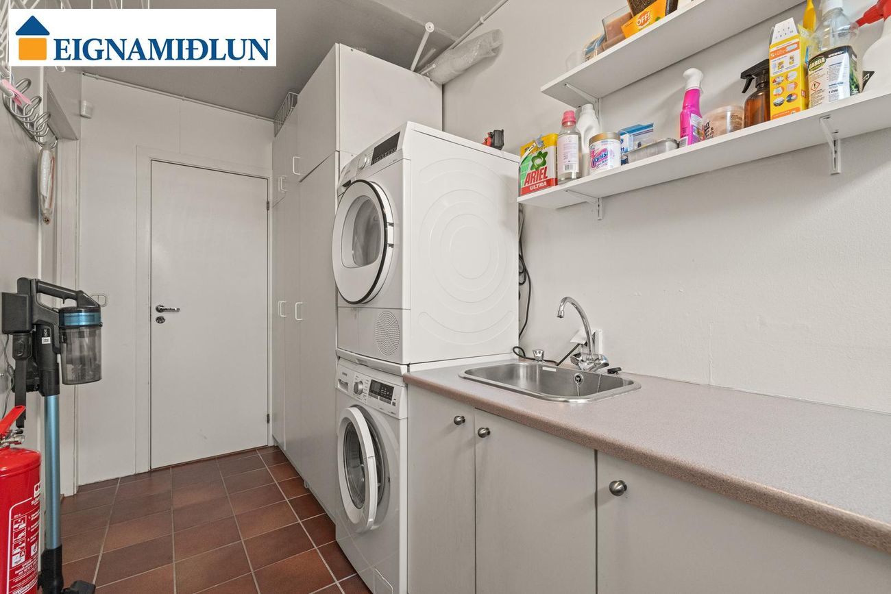 Þvottahús: Góð innrétting er í þvottahúsi með plássi fyrir þvottavél og þurrkara. Gólf er flísalagt. Bakinngangur er í þvottahúsi.