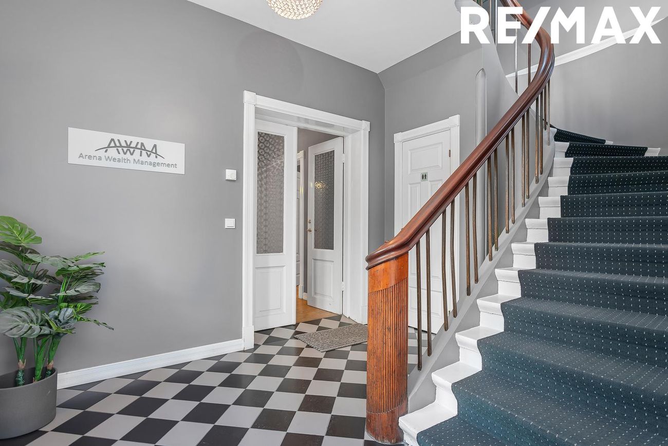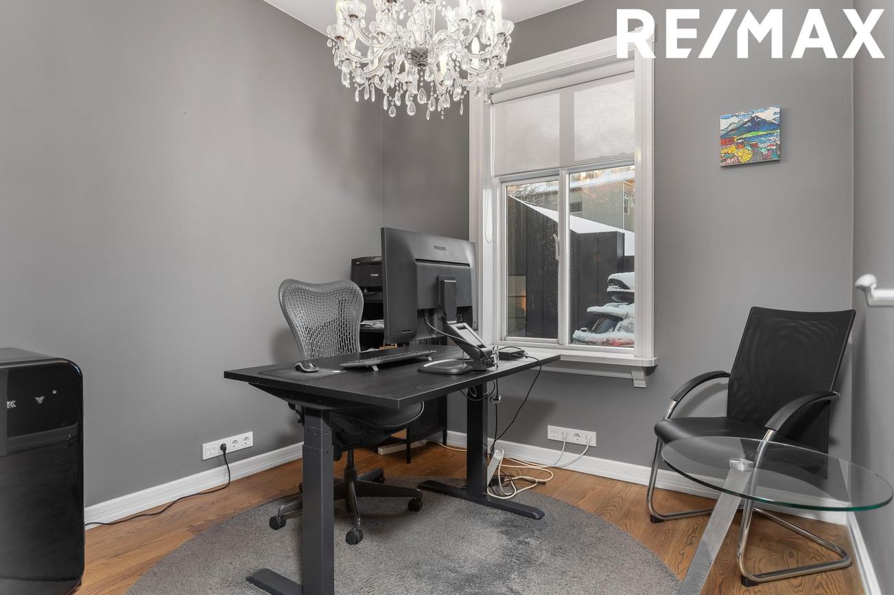 Um er að ræða 120,2 fm. efri hæð með sameiginlegum inngangi. Flísalögð forstofa með gestasalerni og flottum stiga upp á efri hæð í móttöku/biðstofu. Skrifstofurýmið skiptist svo niður í þrjár lokaðar skrifstofur, opið vinnurými ( tvær stofur) og fundarherbergi. Fullbúið eldhús er með vandaðri innréttingu og granít á borðum. Baðherbergi er með sturtu. Auk þess er 26,3 fm stigagangur og 30,7 fm geymsla.