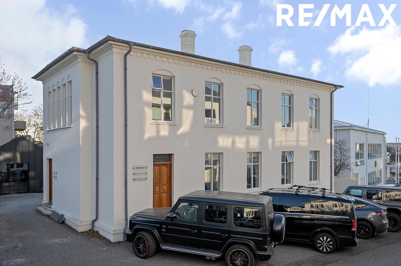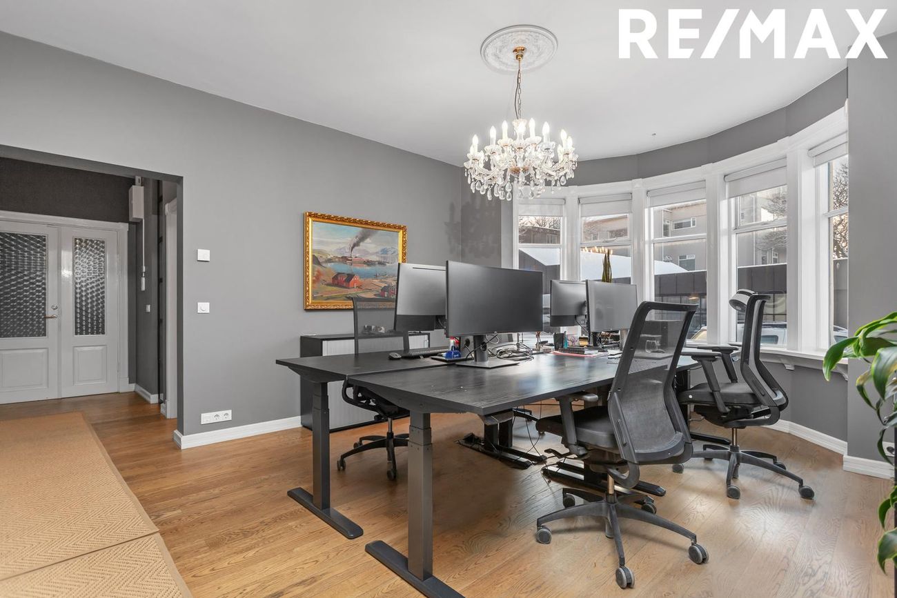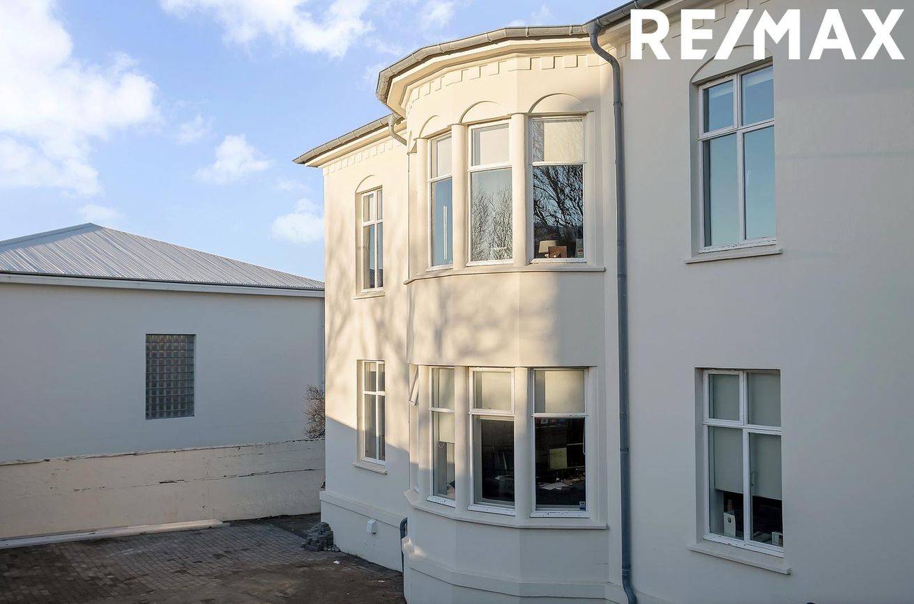 Glæsilegt atvinnu/ skrifstofu húsnæði með tveimur sérhæðum ásamt nýlega byggðu skrifstofuhúsi á einni hæð sem staðsett á baklóð bak við hvíta húsið.