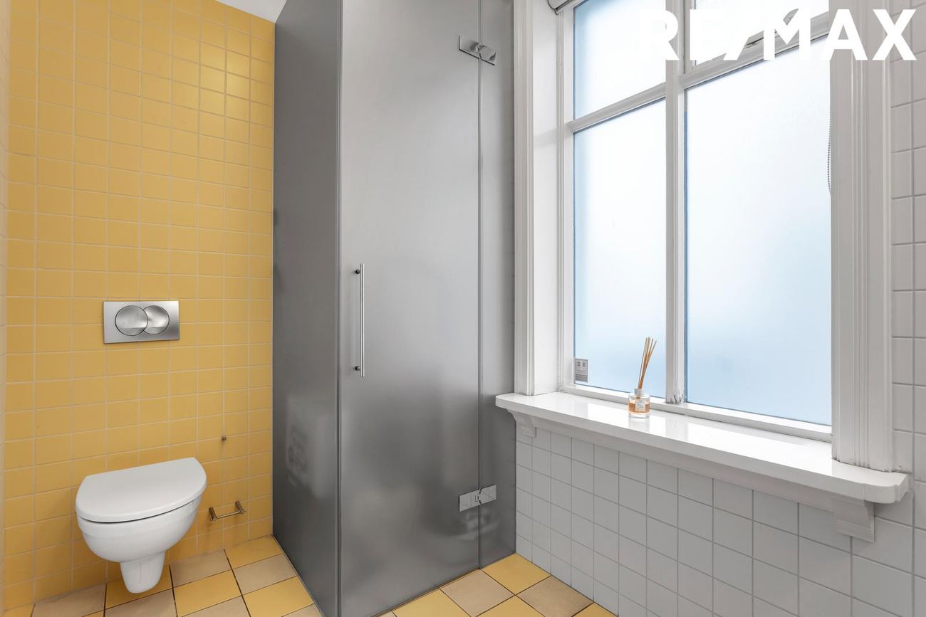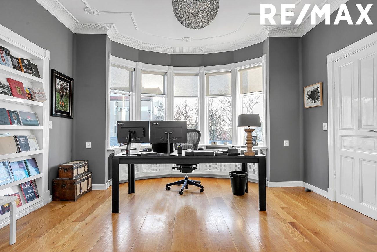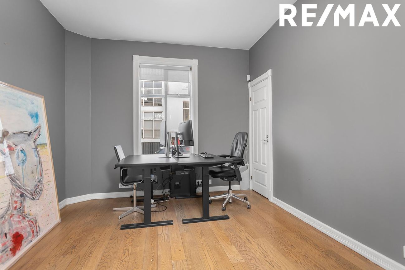 Hvítt hús á tveimur hæðum með kjallara.- Neðri hæð ( Atvinnu/ skrifstofu húsnæði)