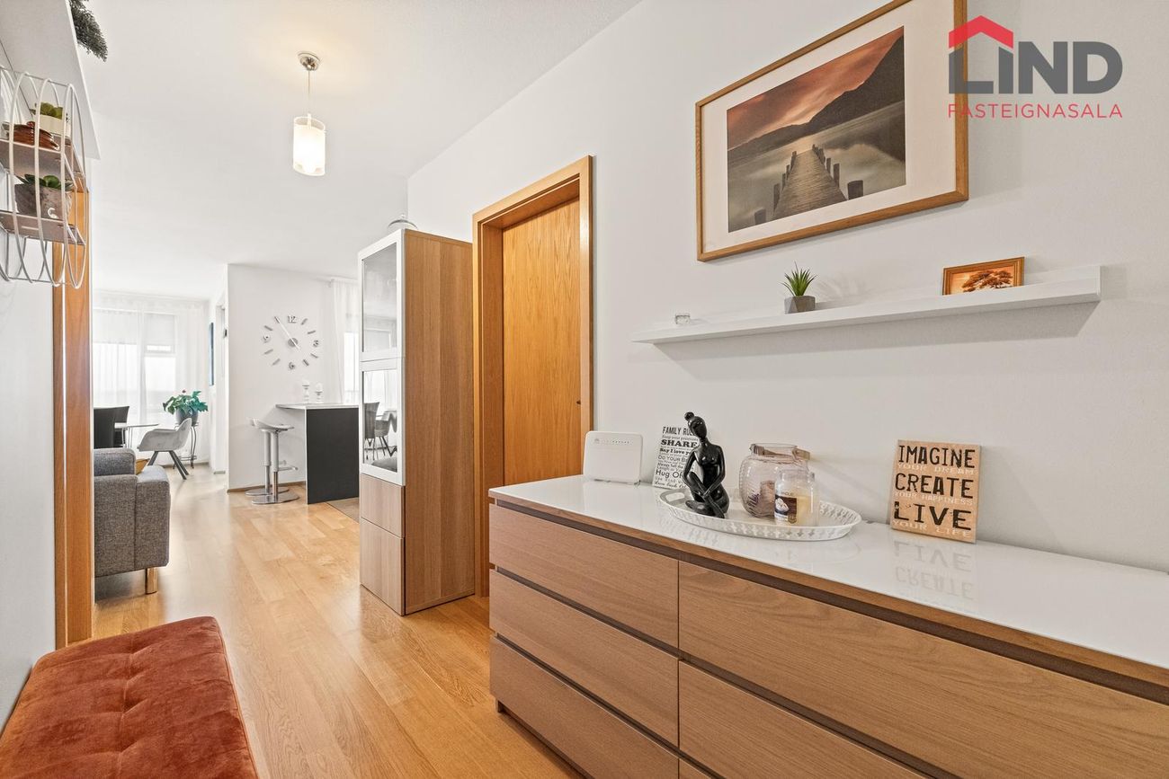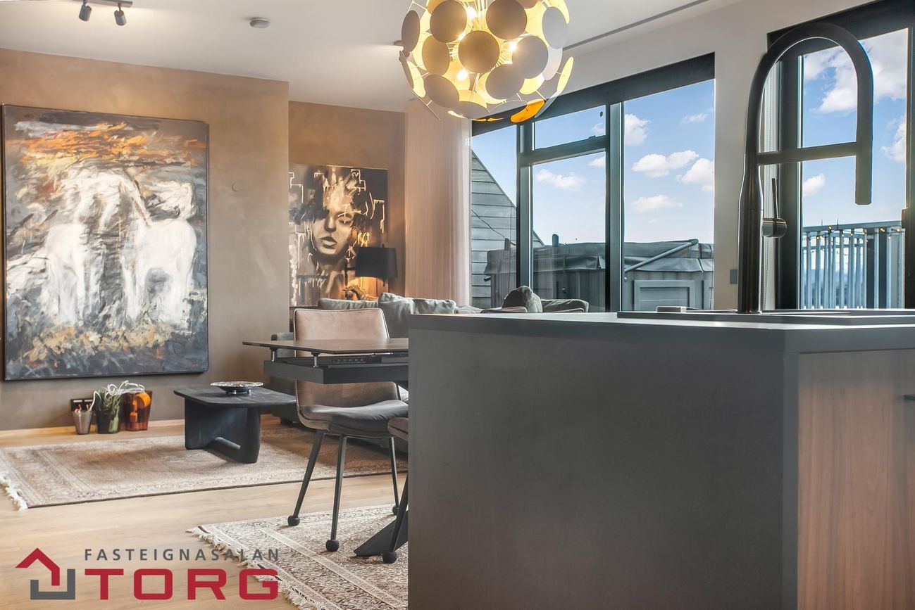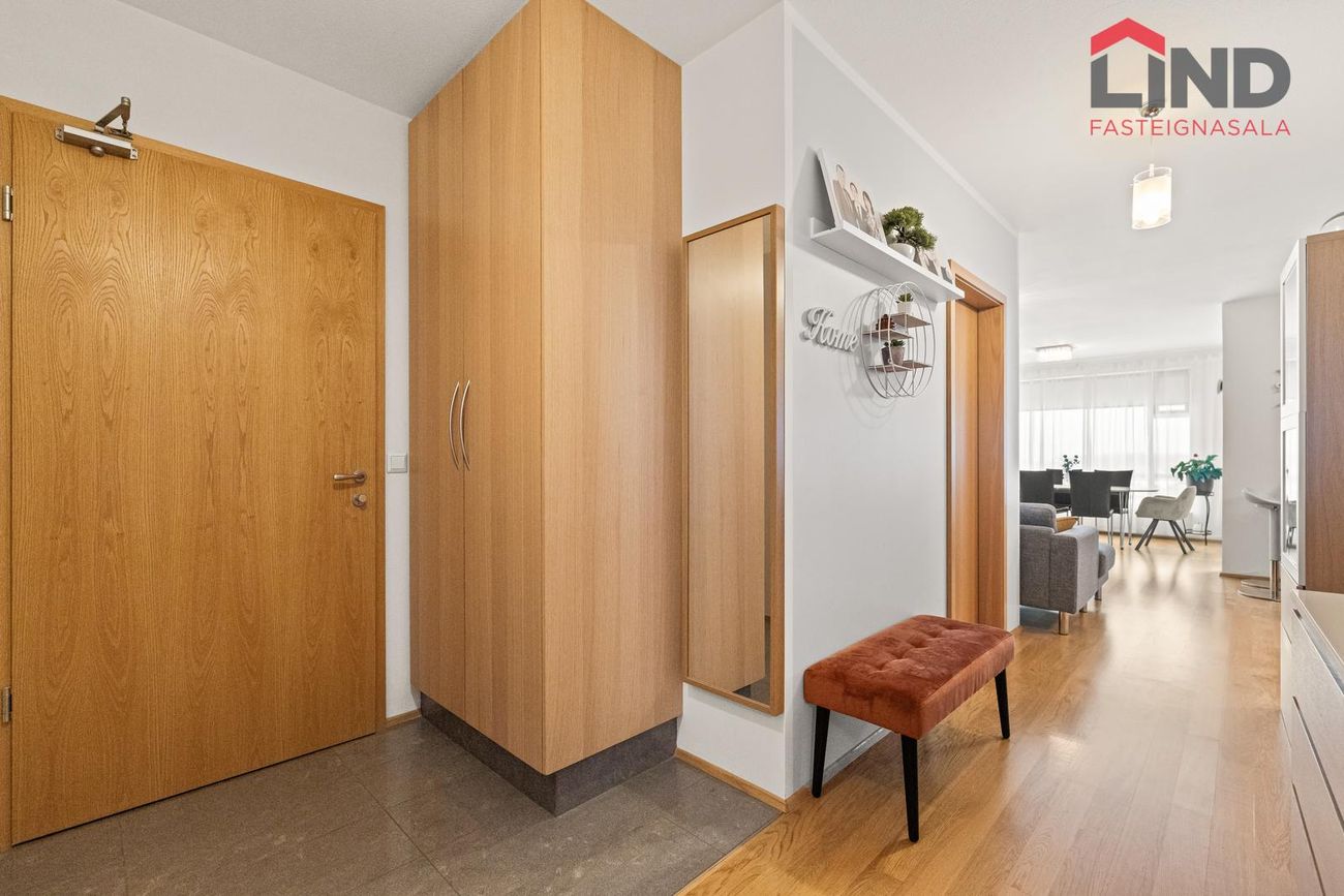 Íbúðin skiptist í rúmgott alrými sem samanstendur af stofu, borðstofu og eldhúsi. Útgengi er þaðan á rúmgóðar yfirbyggðar svalir til suðvesturs með miklu útsýni. Tvö svefnherbergi sem er bæði með skápum. Rúmgott baðherbergi og sér þvottaherbergi innan íbúðar. Sérmerkt bílastæði í bílakjallara sem er með þvottastæði fyrir íbúa. Sérgeymsla í kjallara er 6,8 fermetrar að stærð.