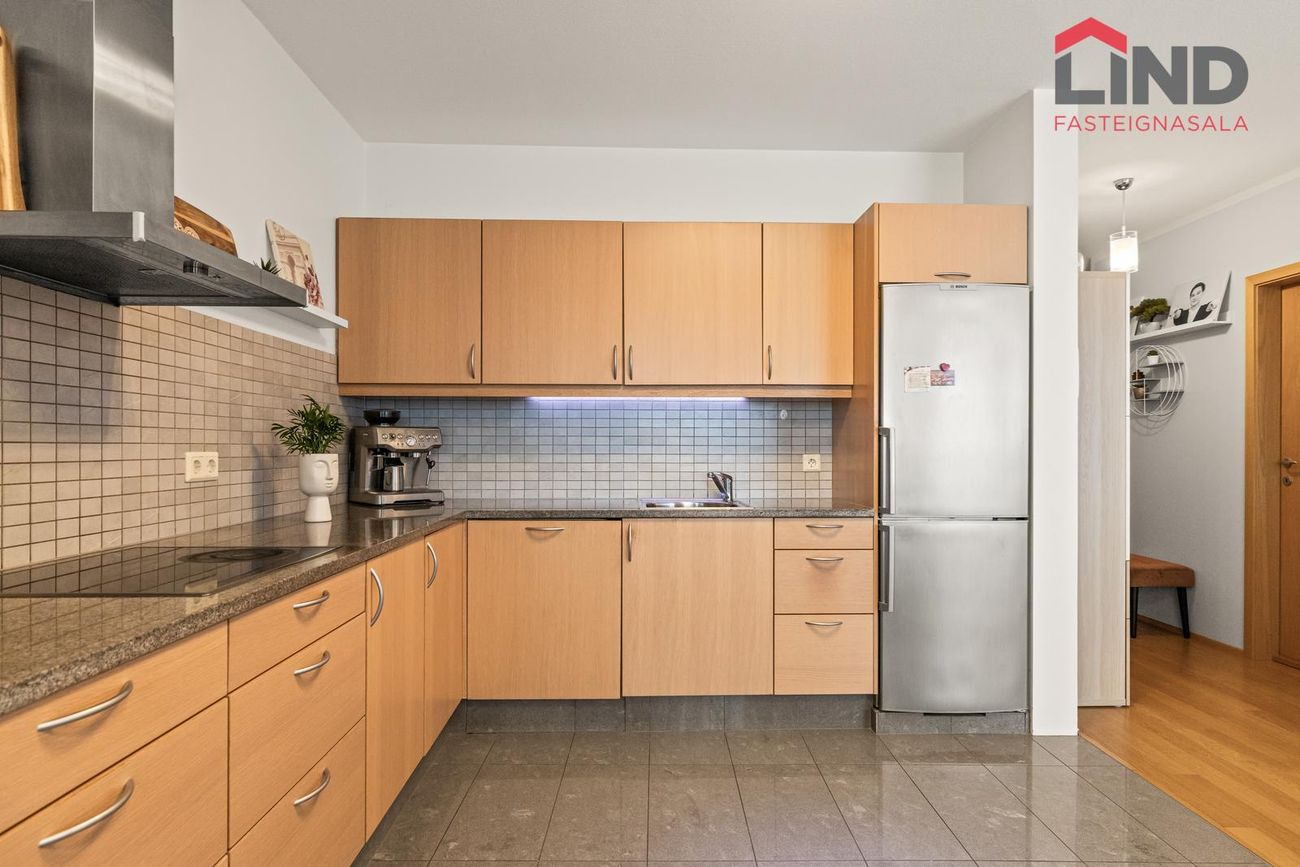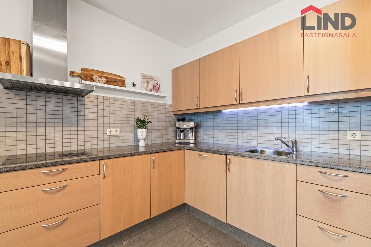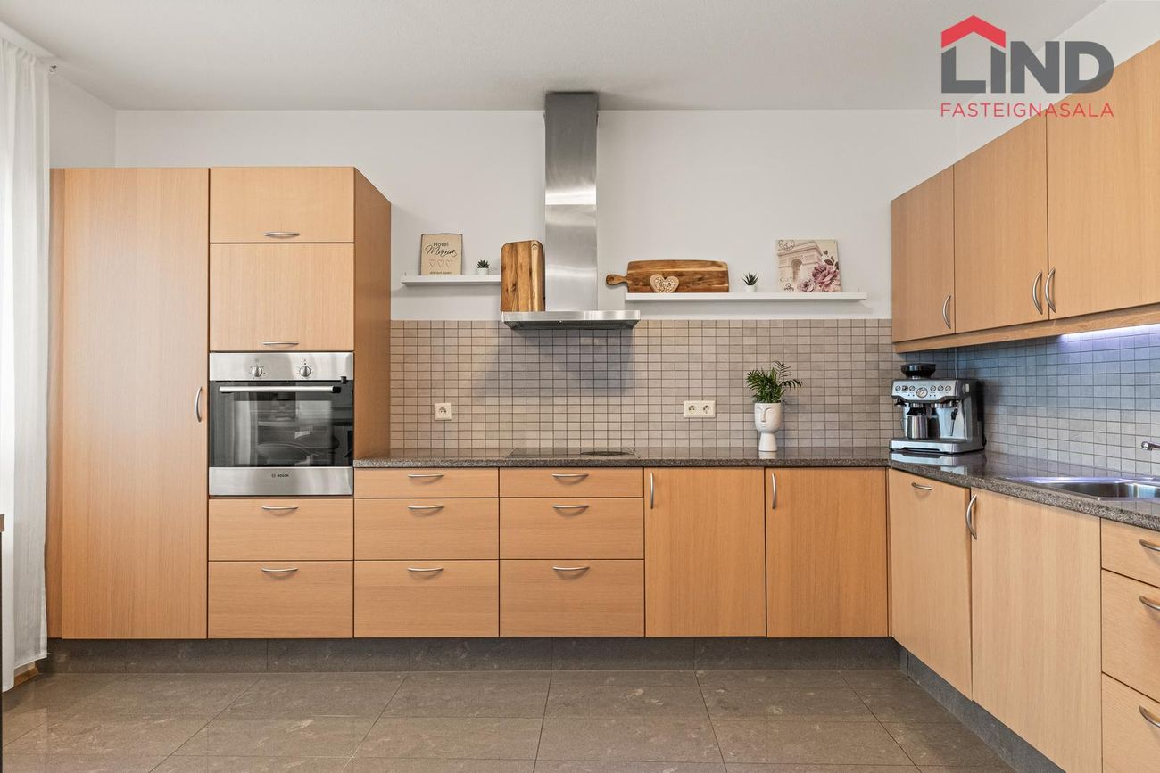 Eldhús: Er rúmgott með flísum á gólfi og fallegri eldhúsinnréttingu með miklu skápaplássi og granít steini á borðum. Stál Bosch bakaraofn, helluborð, háfur og innbyggð uppþvottavél. Eldhús er opið við stofu með gluggum til suðvesturs.