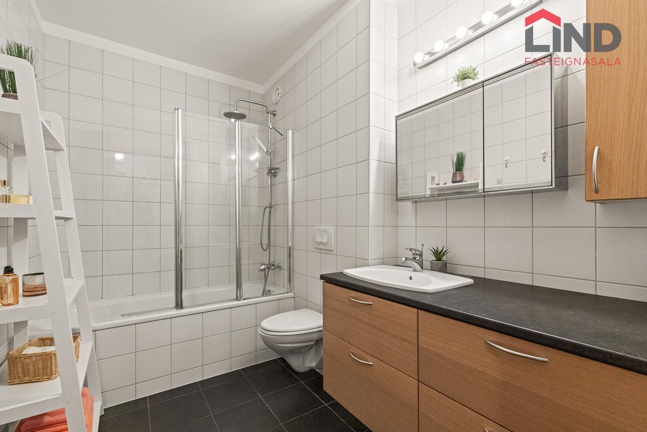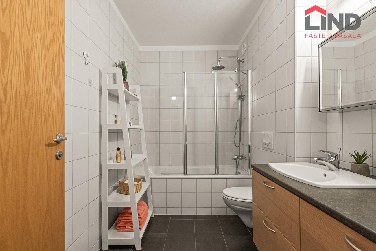 Baðherbergi: Með flísum á gólfi og veggjum. Baðkar með sturtutækjum og glerþili. Falleg innrétting við vask með speglaskáp fyrir ofan. Upphengt salerni og útloftun.