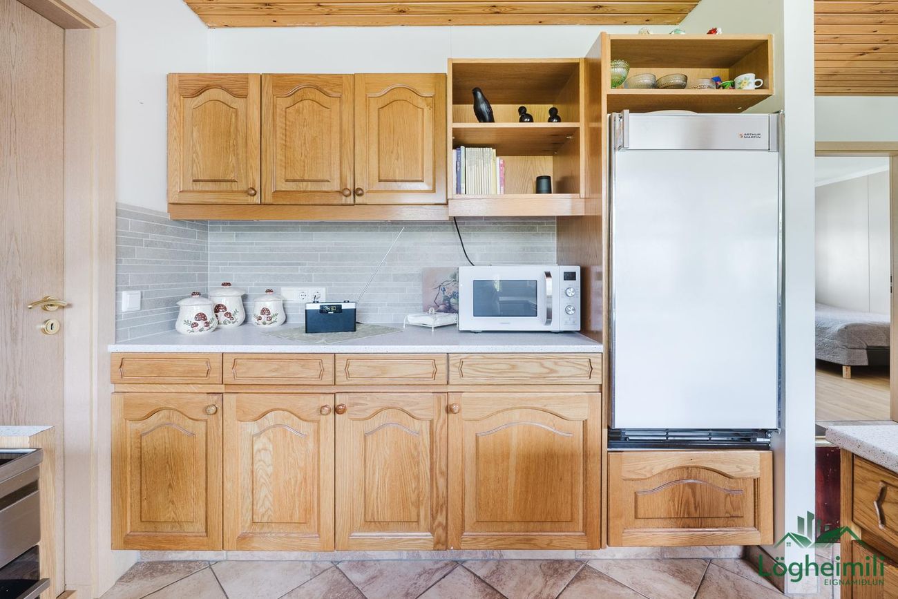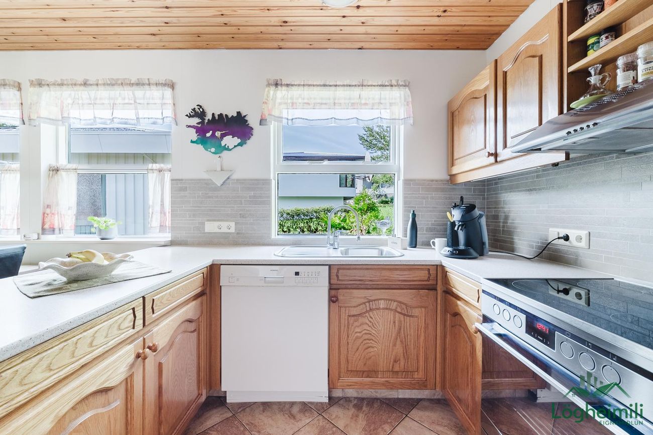Innrétting með viðaráferð, eldavél með viftu, tengi fyrir uppþvottavél og innangengt í þvottaherbergi.