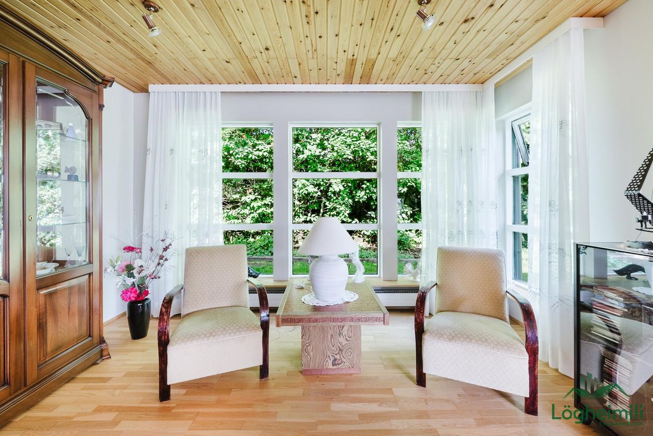 Parket á stofu og borðstofu, plastparket á herbergjum, flísar á forstofu, eldhúsi, gangi, baðherbergi og þvottaherbergi. Byggt úr timbri.