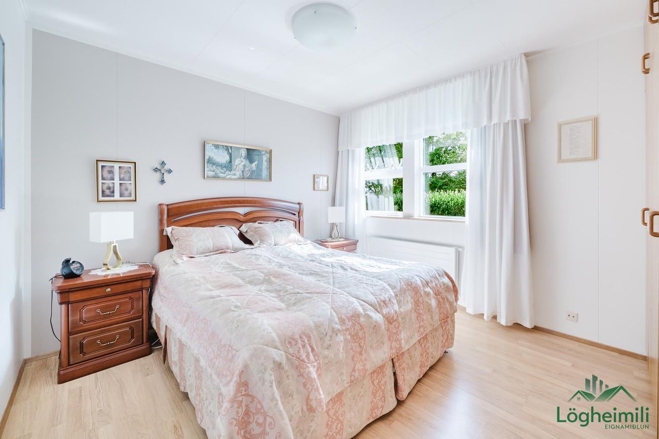 Fjögur rúmgóð herbergi: hjónaherbergi með fataskáp og þrjú barnaherbergi (eitt með fataskáp).