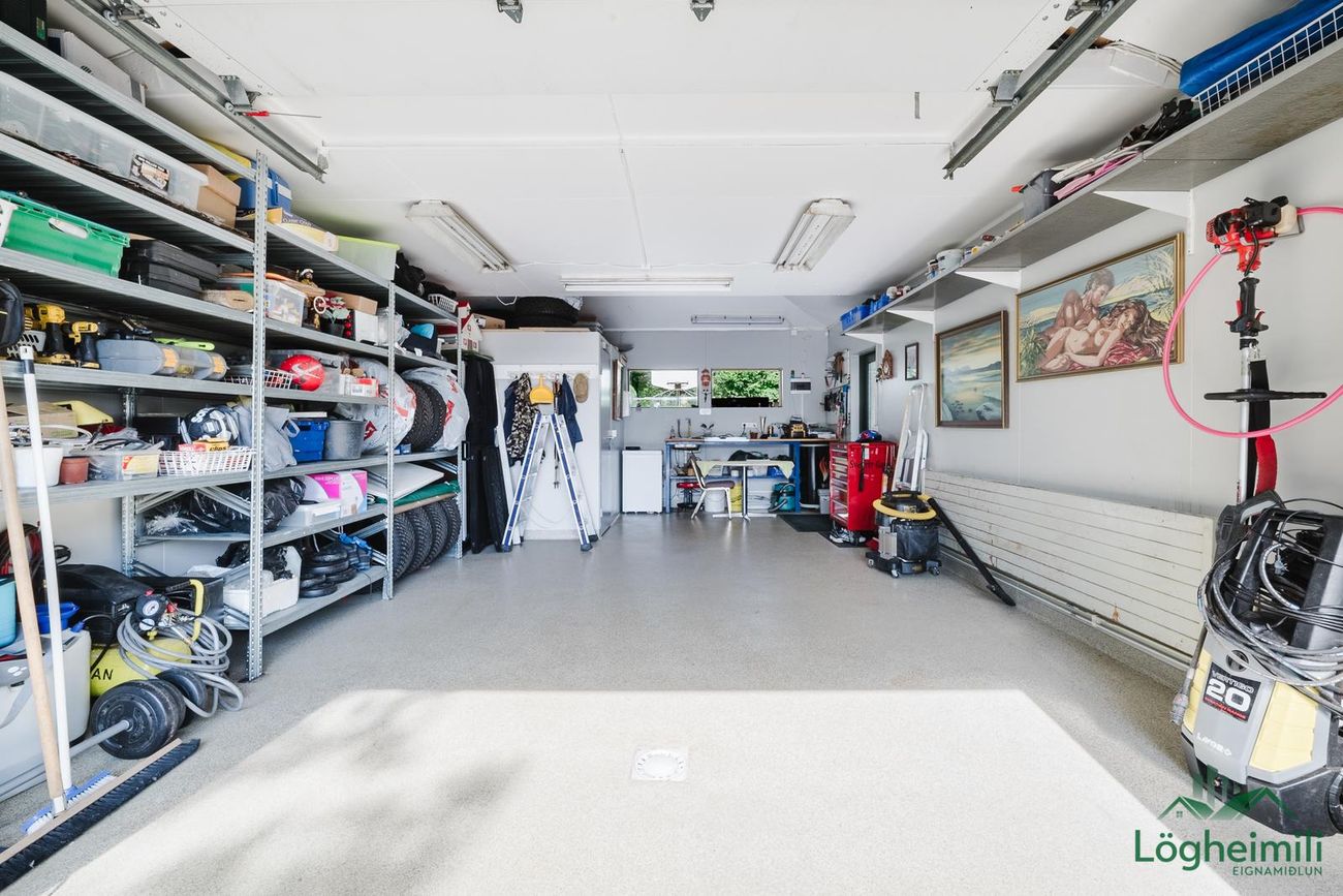 Bílskúr með geymslulofti, geymslu og hillum. Epoxy á gólfi og áföst kald útigeymsla.