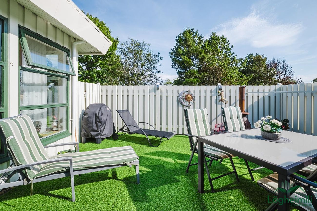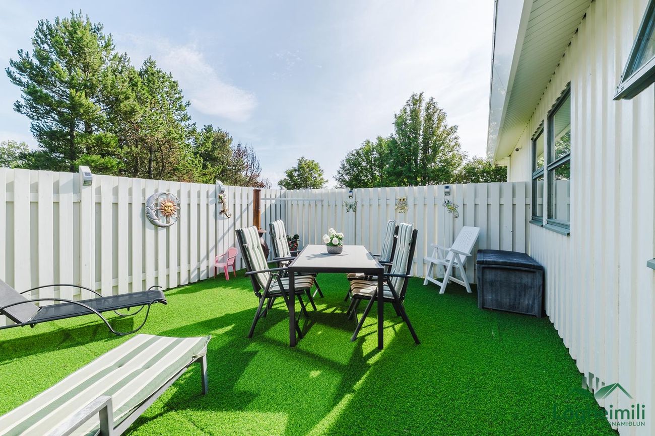 Stór lóð með afgirtri verönd, hellum og grasteppi. Útgengt úr stofu og þvottaherbergi.