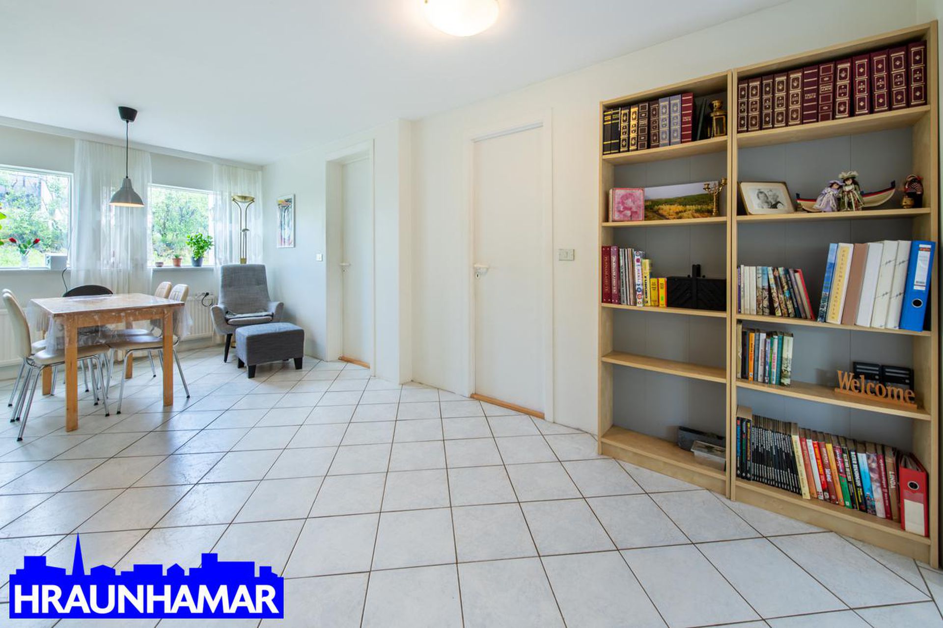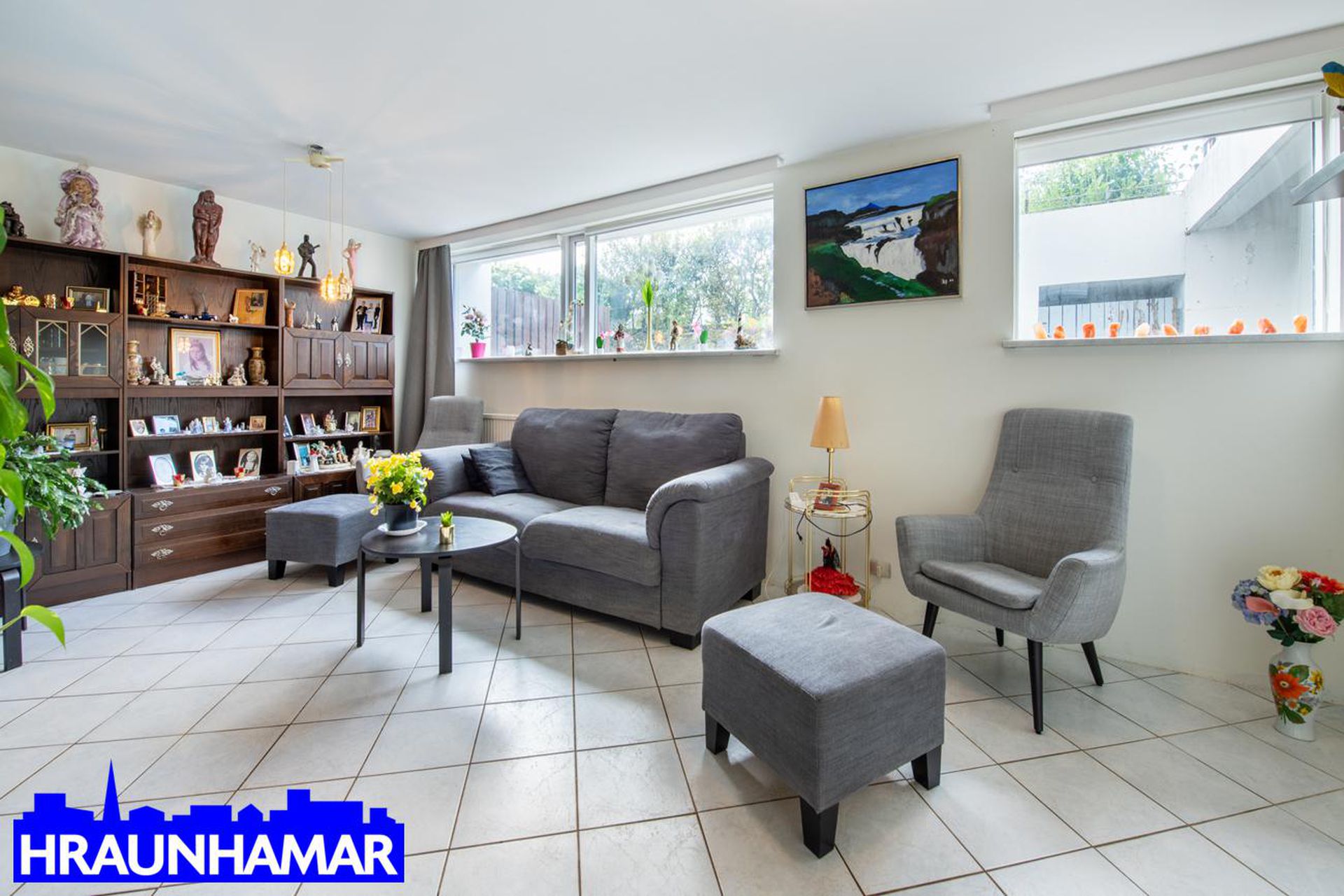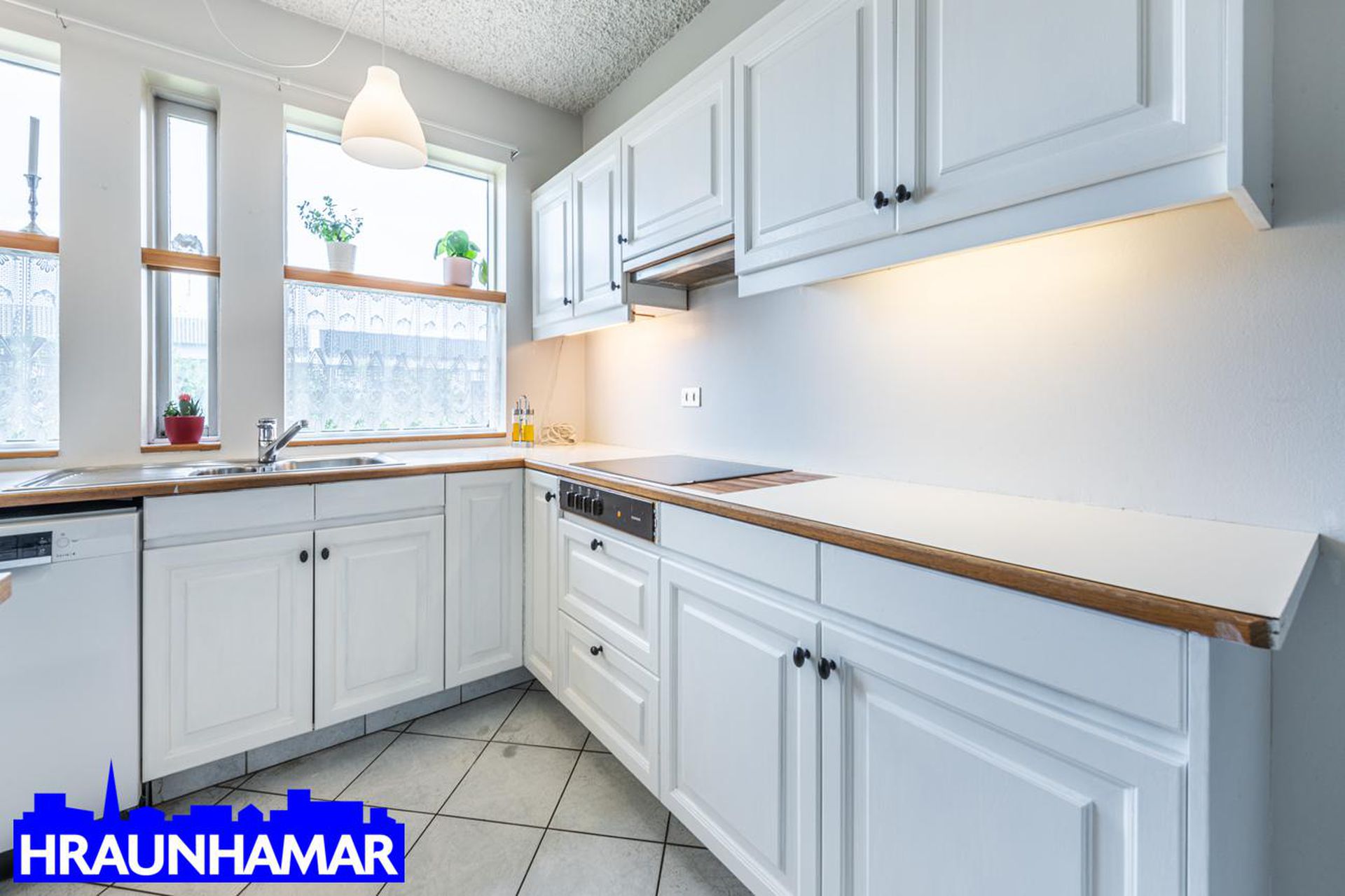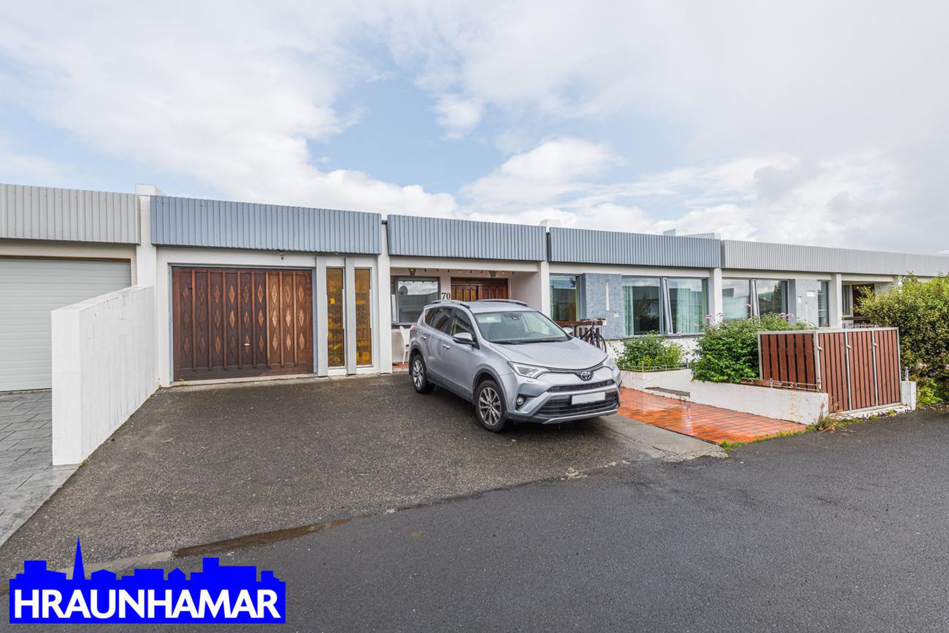 Stórt raðhús með innbyggðum bílskúr, 4 herbergjum á neðri hæð, nýlegar endurbætur og jarðvarmahitun.