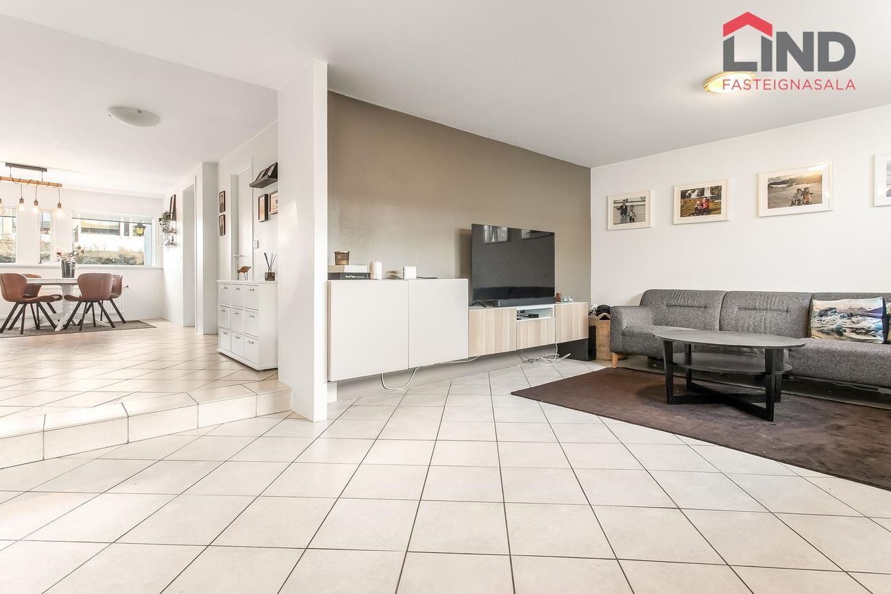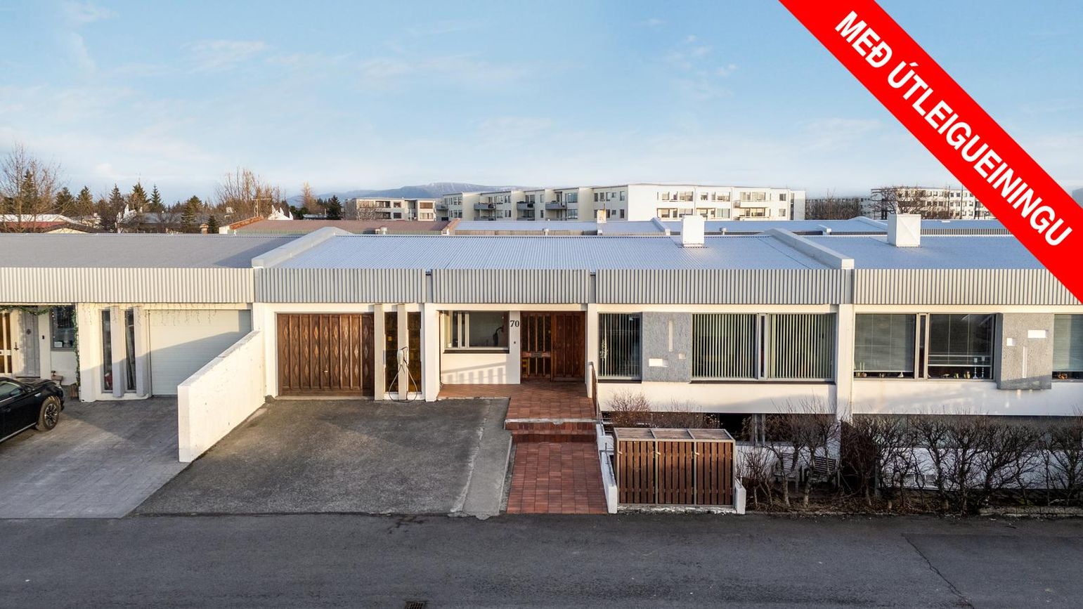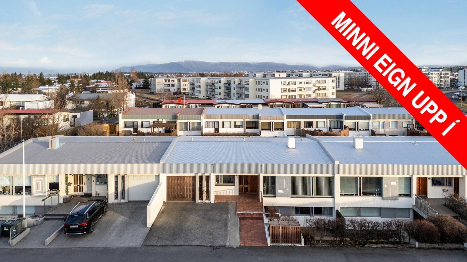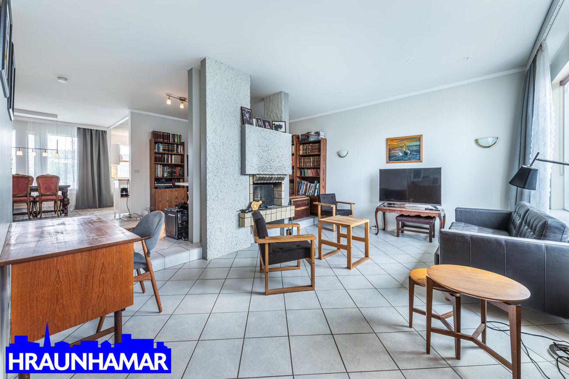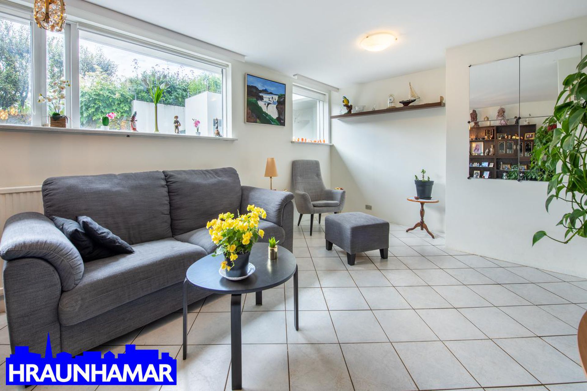 Stórt raðhús með innbyggðum bílskúr, 4 herbergjum á neðri hæð, nýlegar endurbætur og jarðvarmahitun.