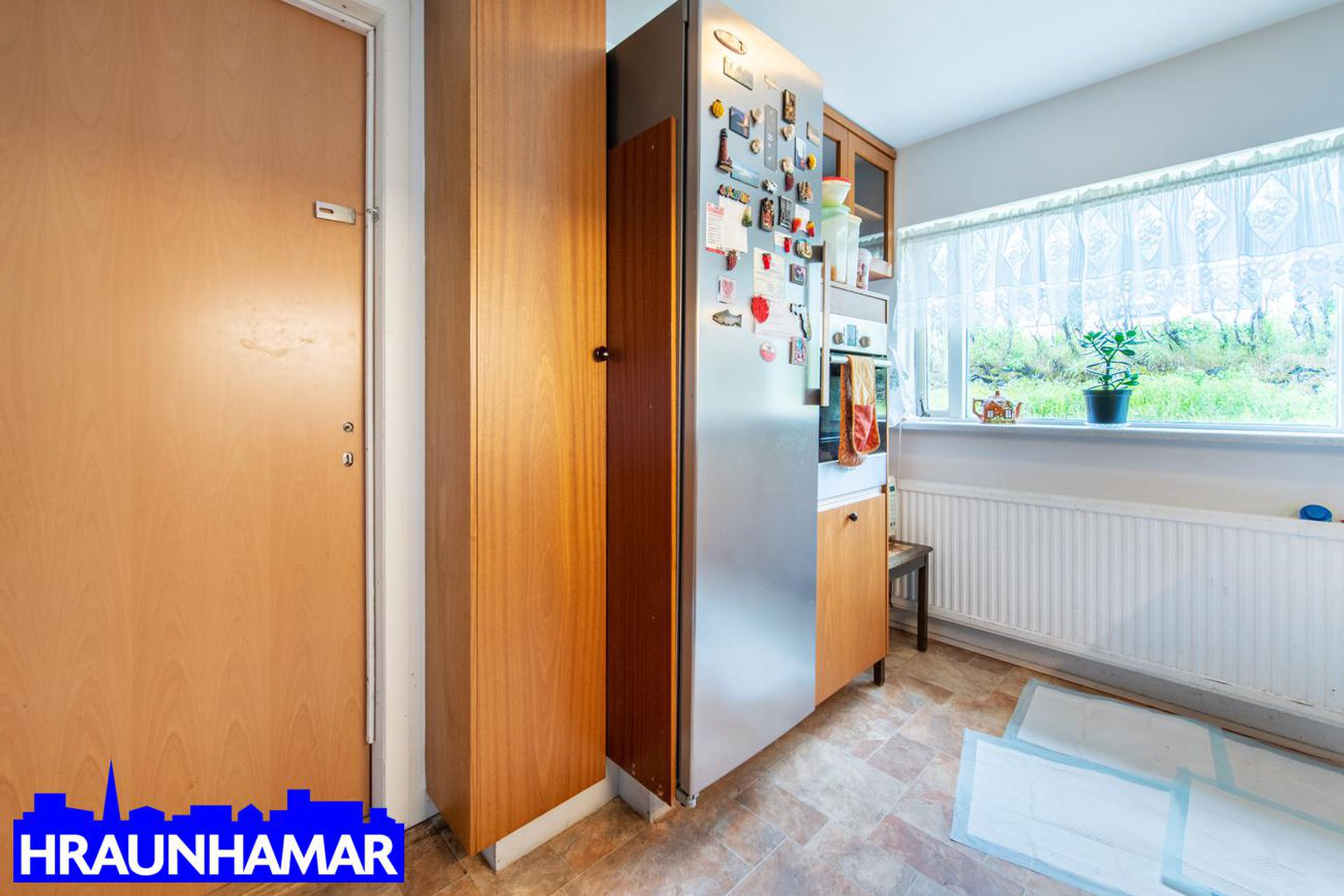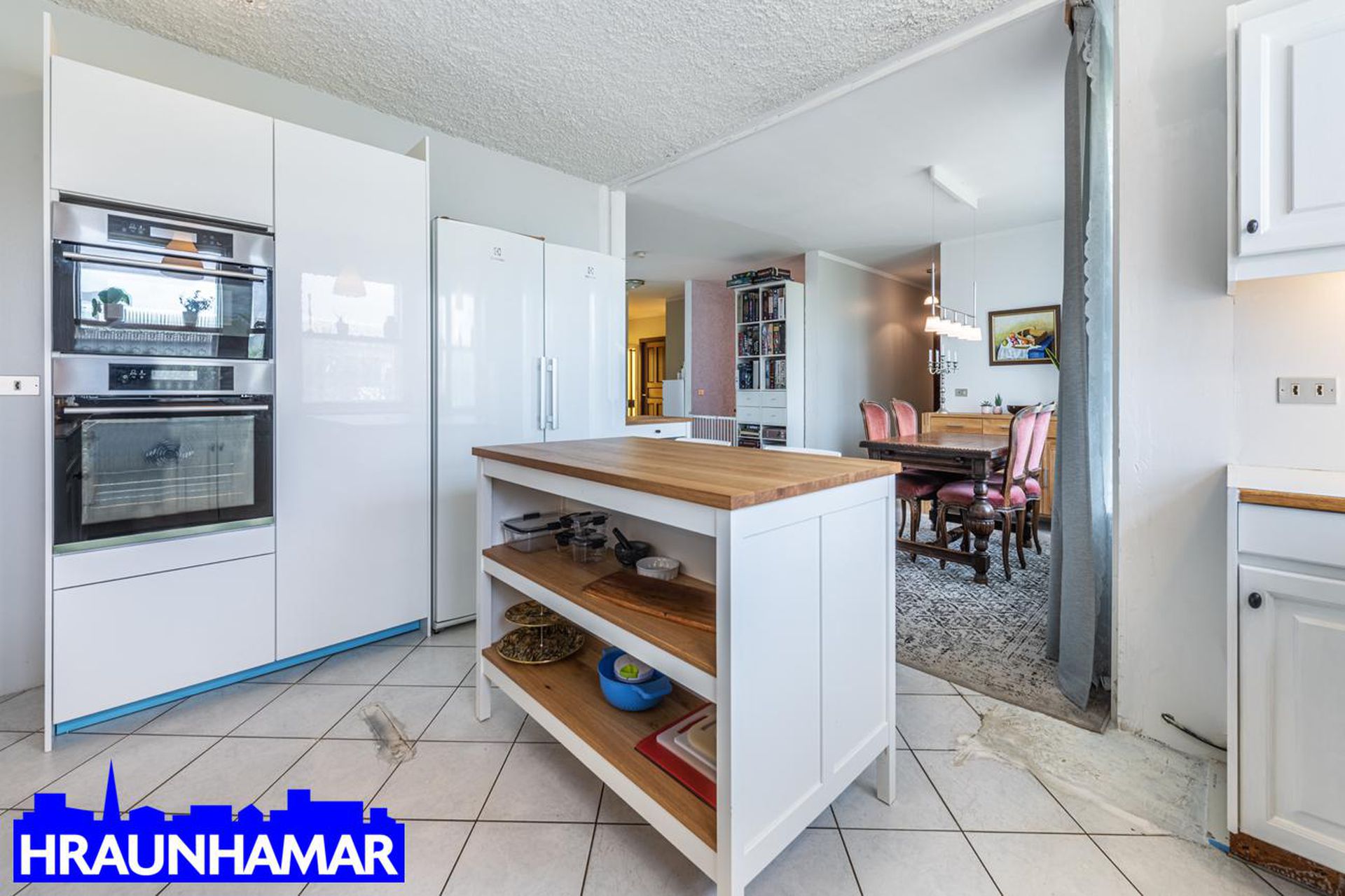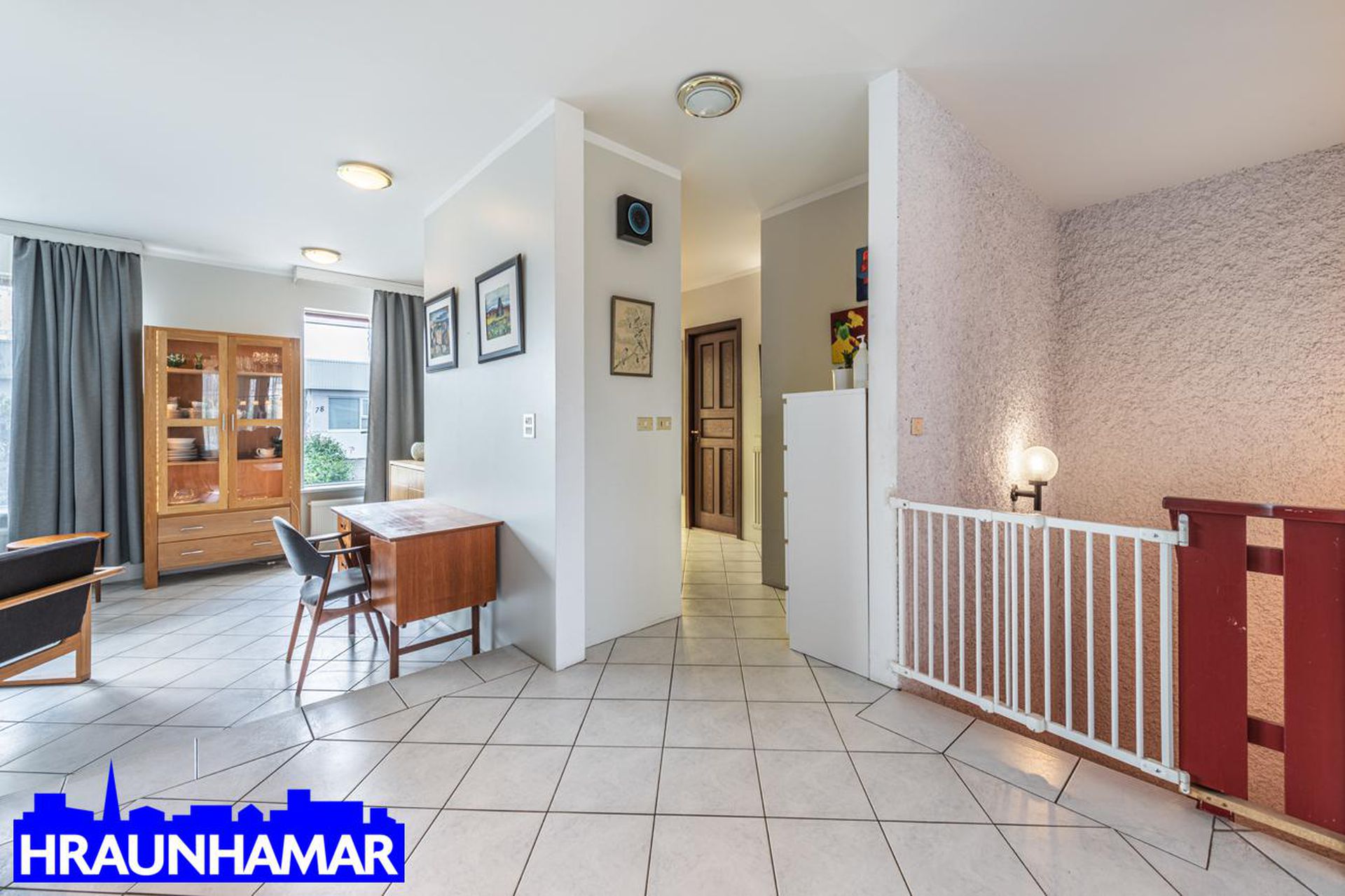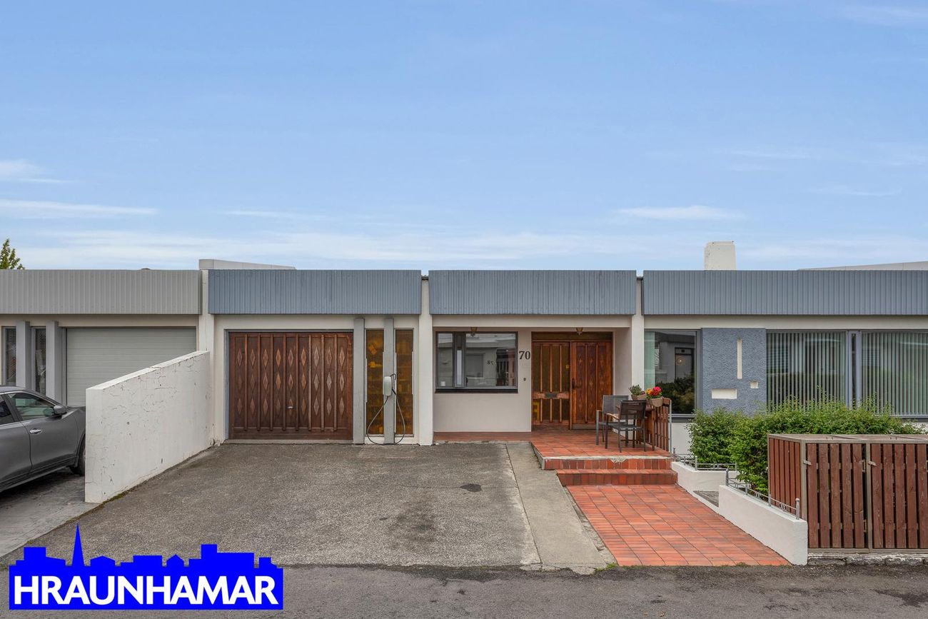 Stórt raðhús með innbyggðum bílskúr, 4 herbergjum á neðri hæð, nýlegar endurbætur og jarðvarmahitun.