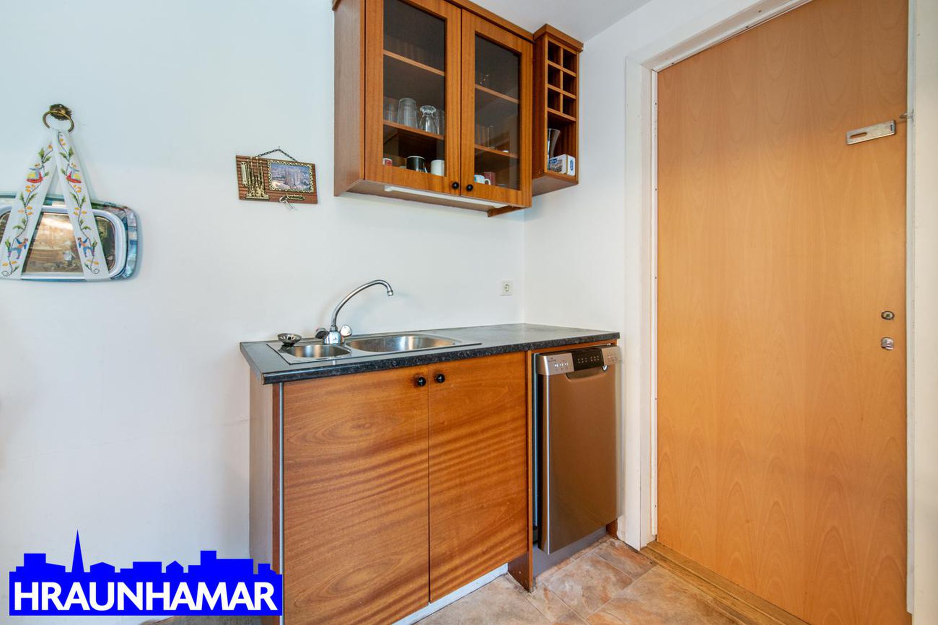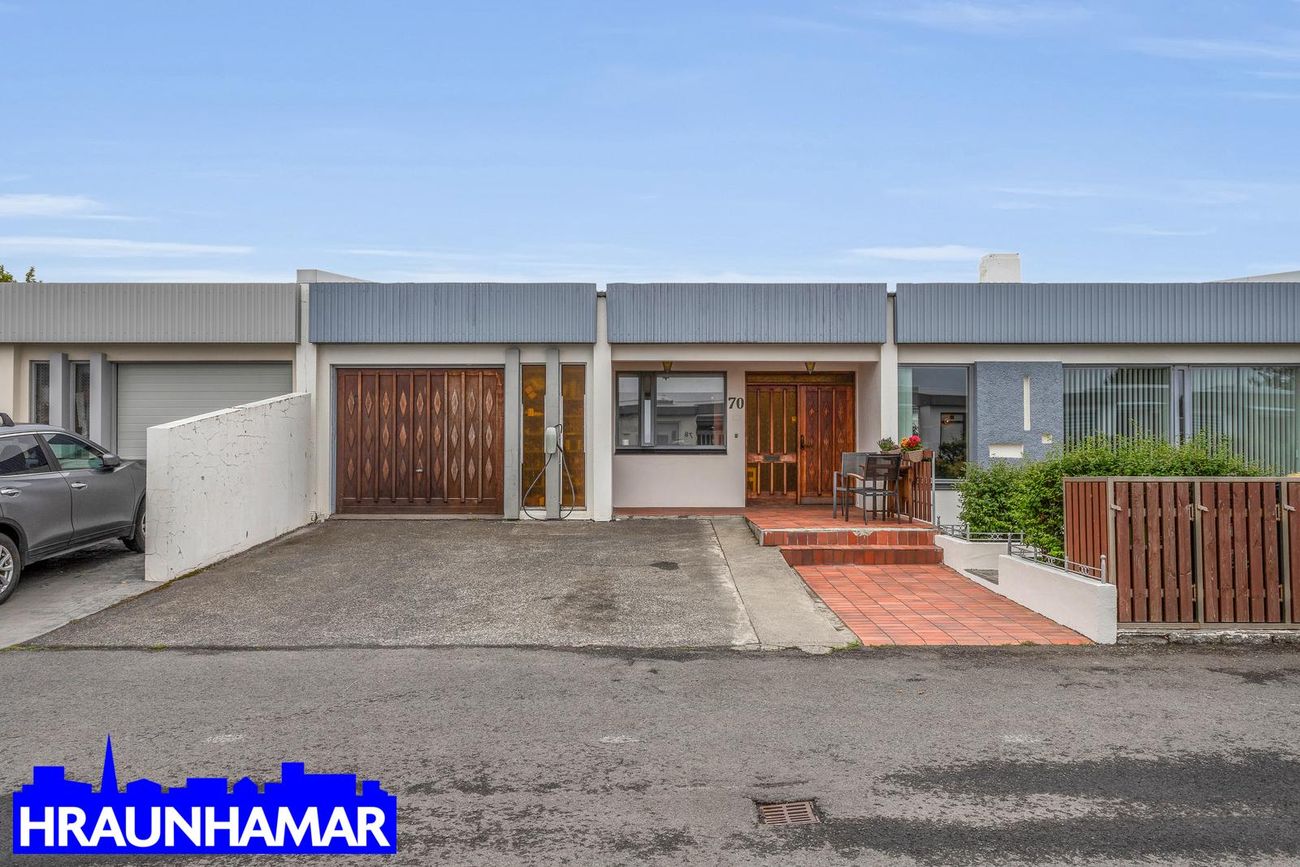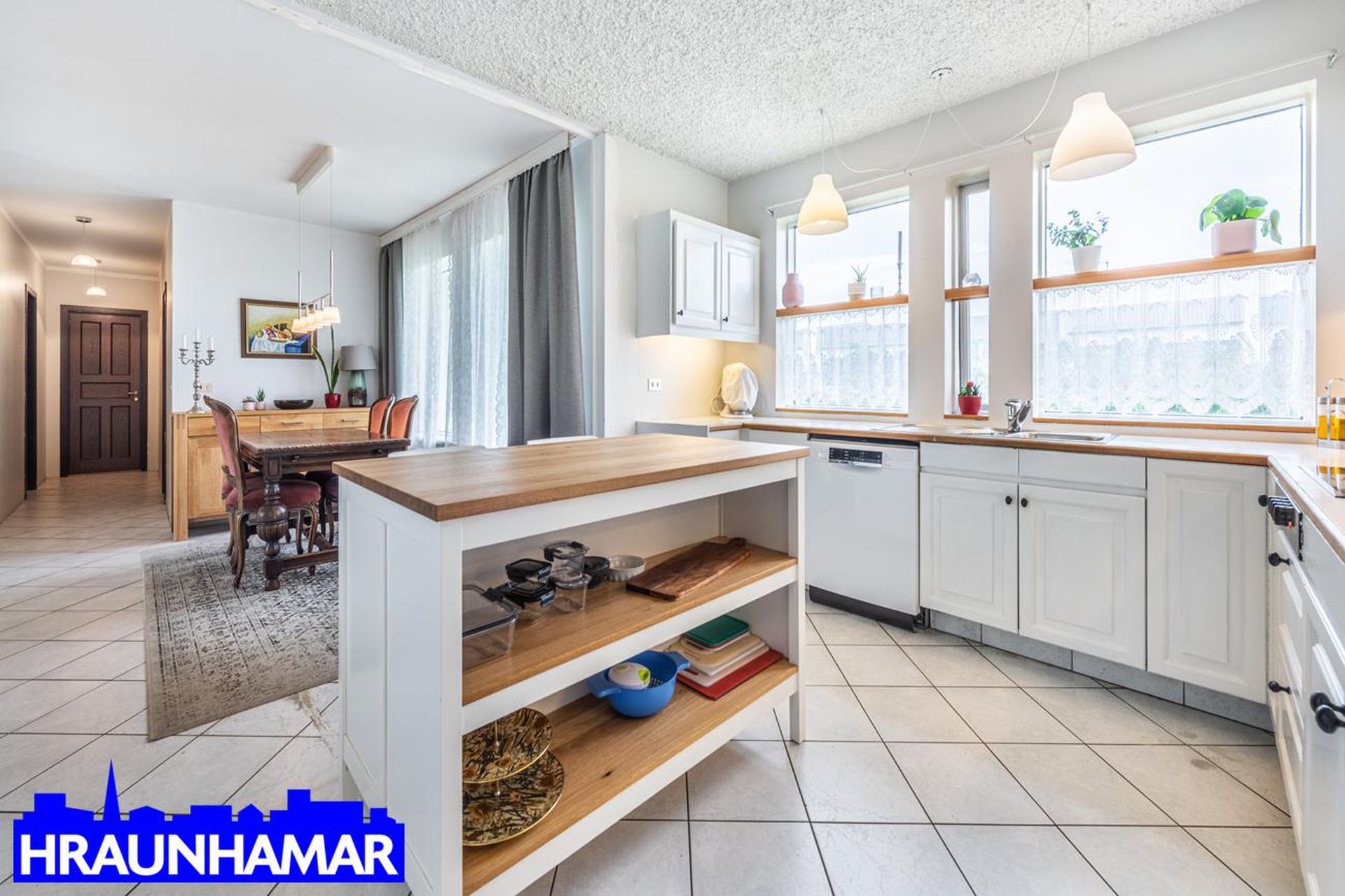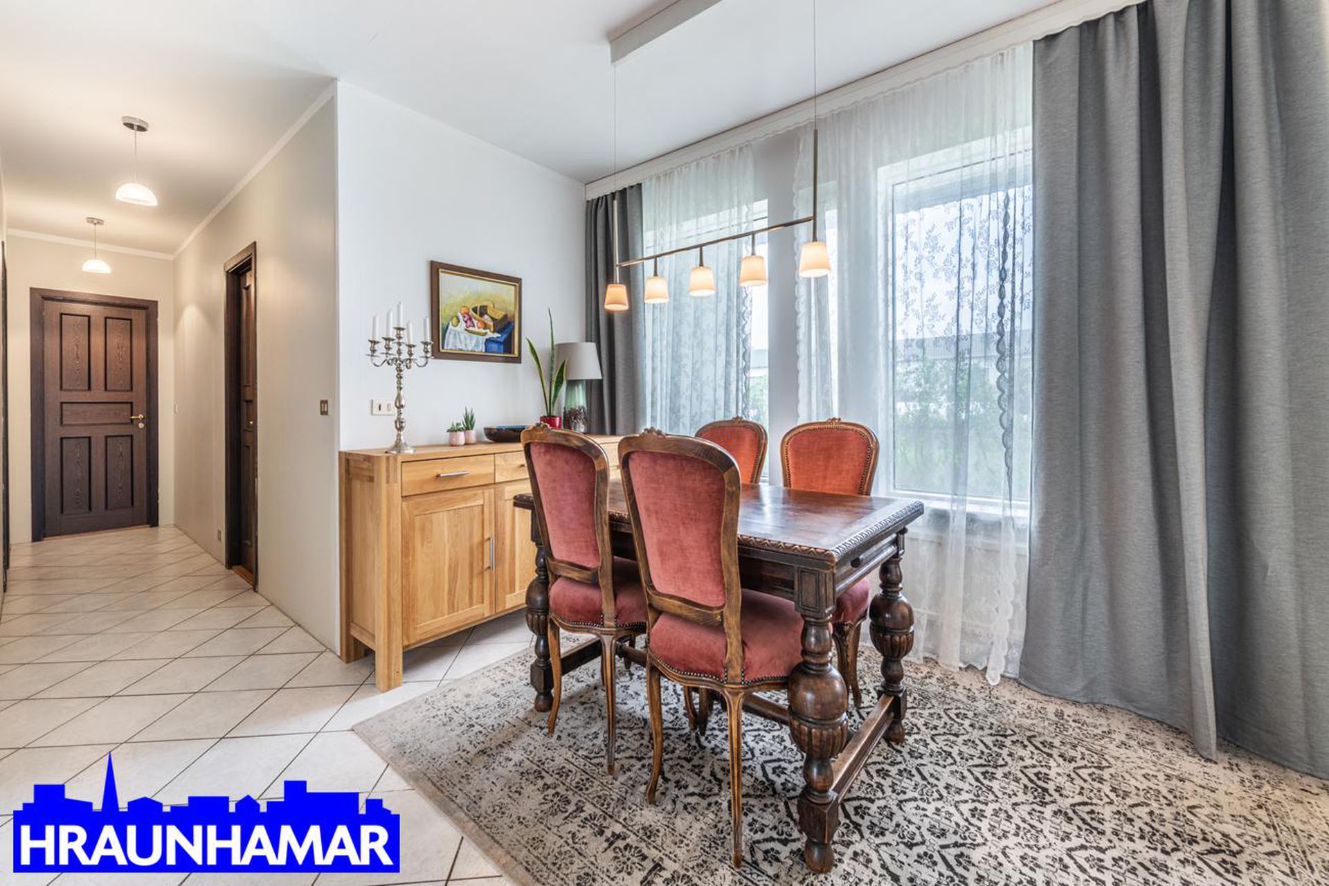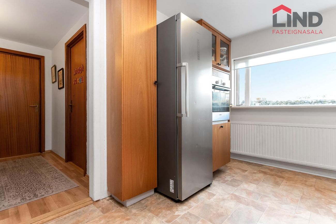 Stórt raðhús með innbyggðum bílskúr, 4 herbergjum á neðri hæð, nýlegar endurbætur og jarðvarmahitun.