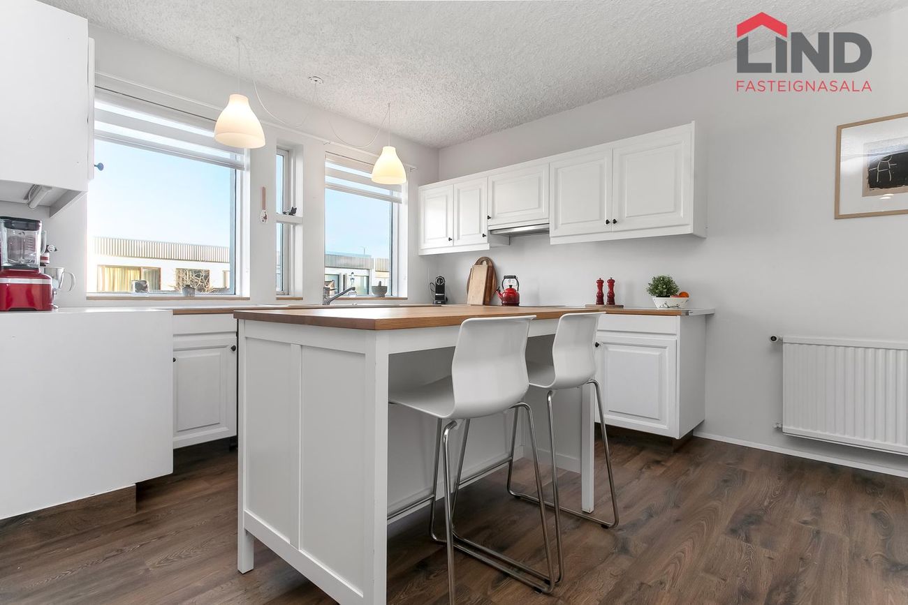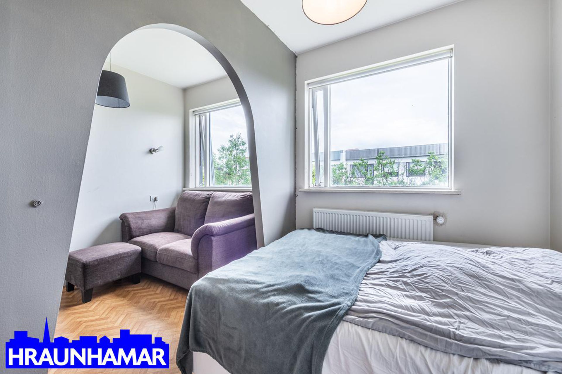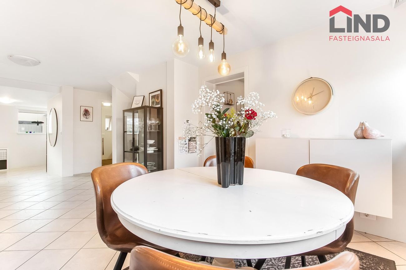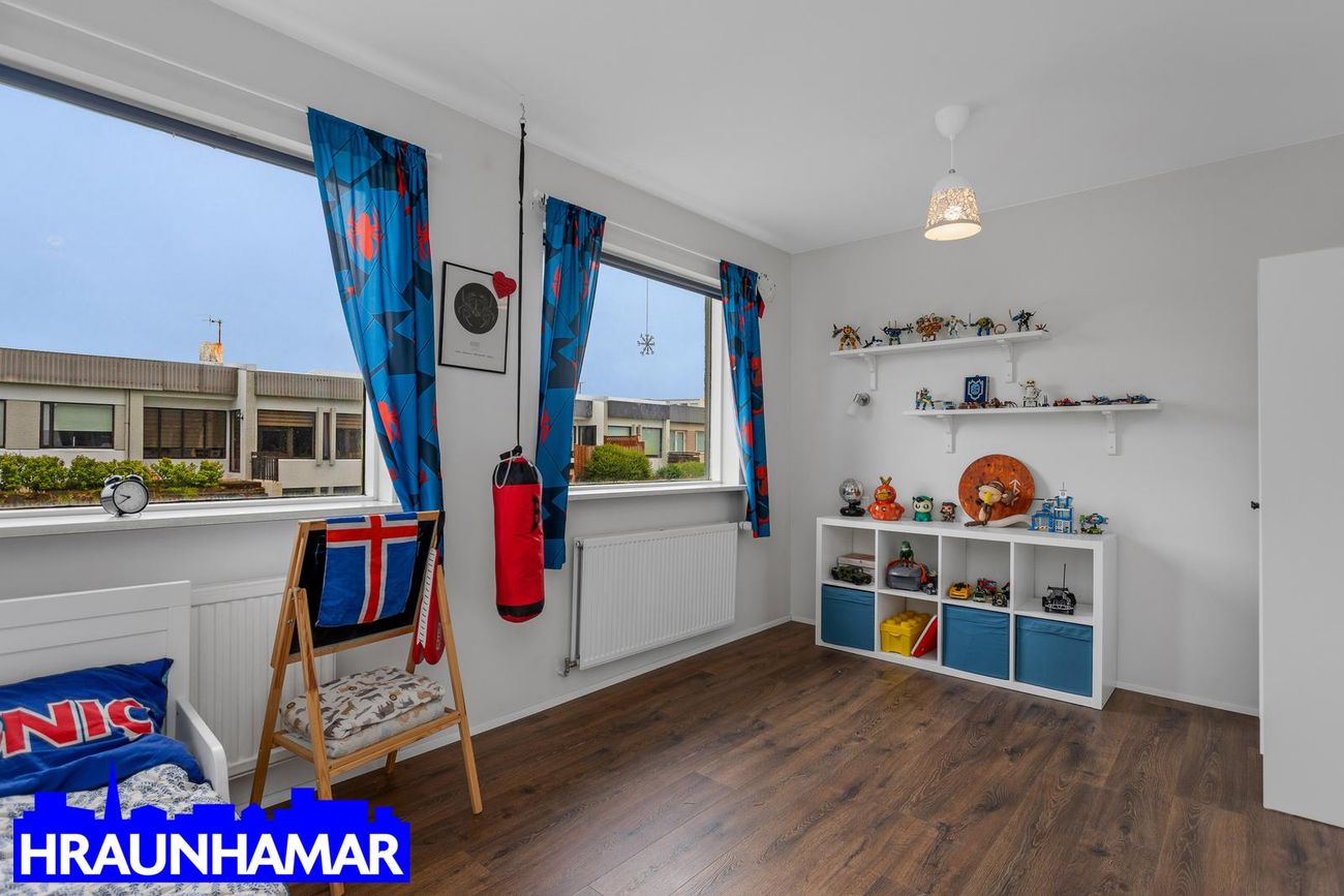 Raðhús skipt í tvær hæðir með 6 herbergjum, 2 baðherbergjum, gestasnyrtingu og 2 stofum. Hægt að auka herbergjafjölda með veggjaskiptingu.