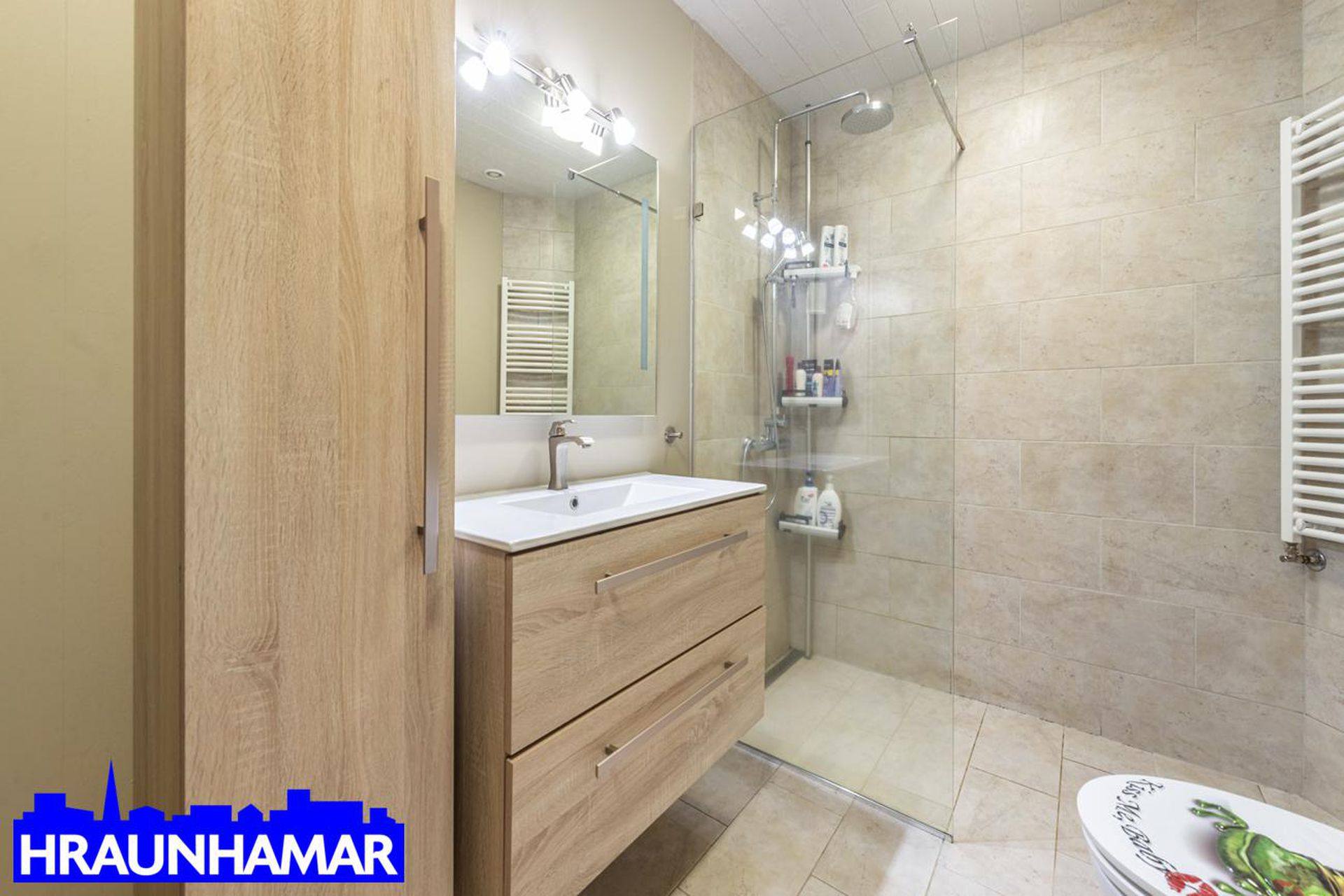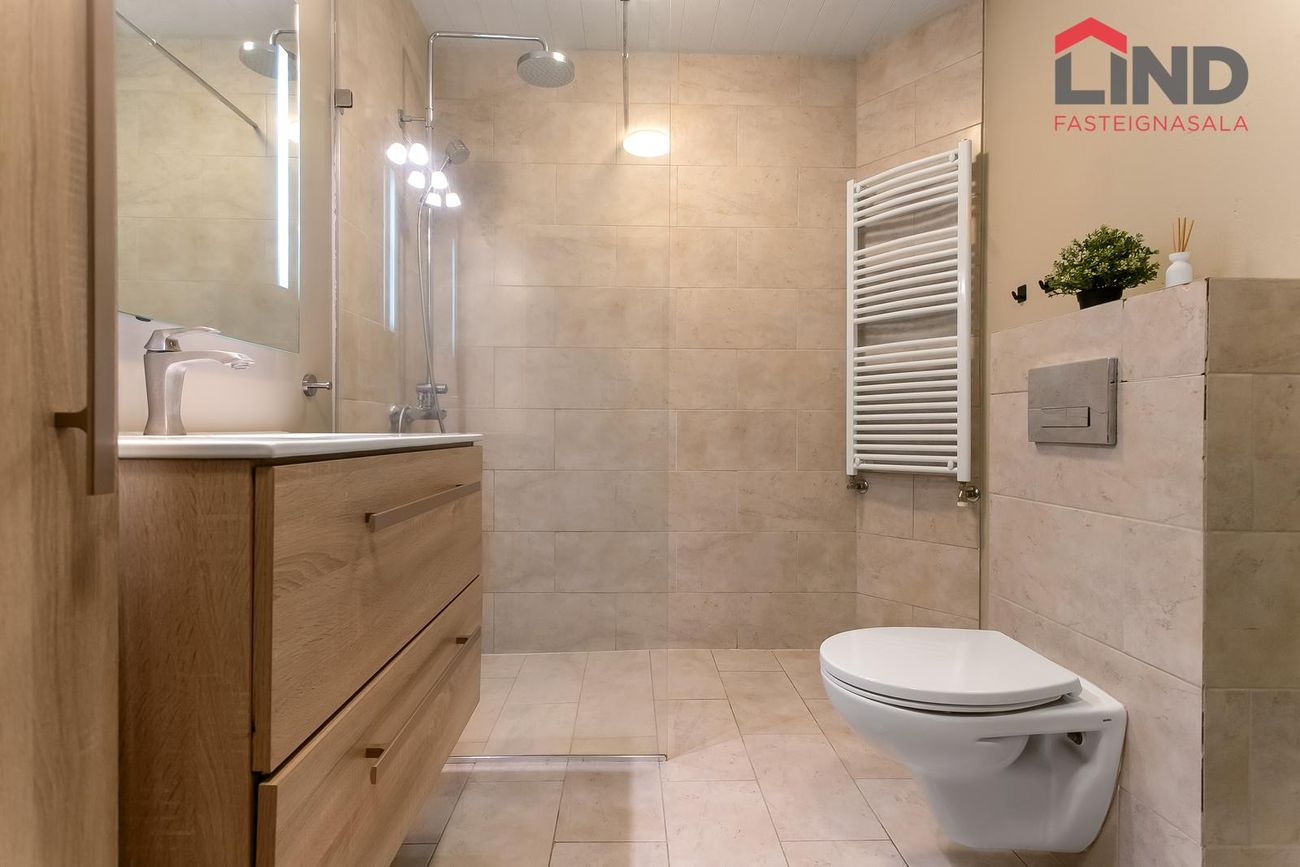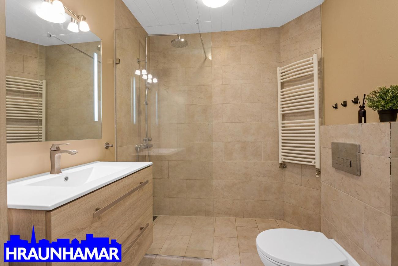 Baðherbergi á efri hæð með sturtu, gólfhita, þvottavélar- og þurrkaraaðstöðu. Baðherbergi á neðri hæð.