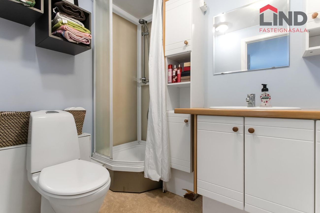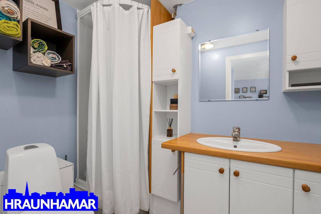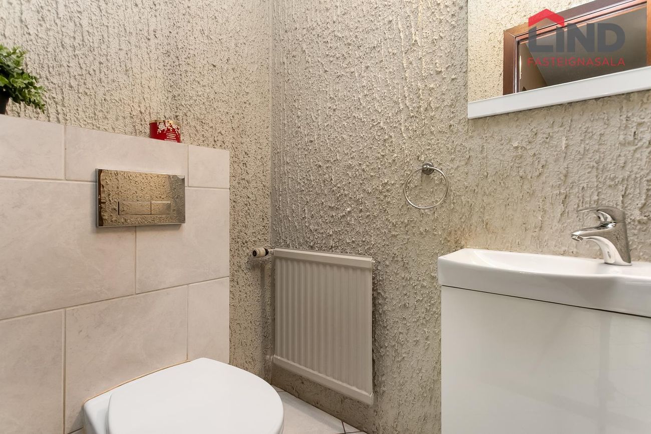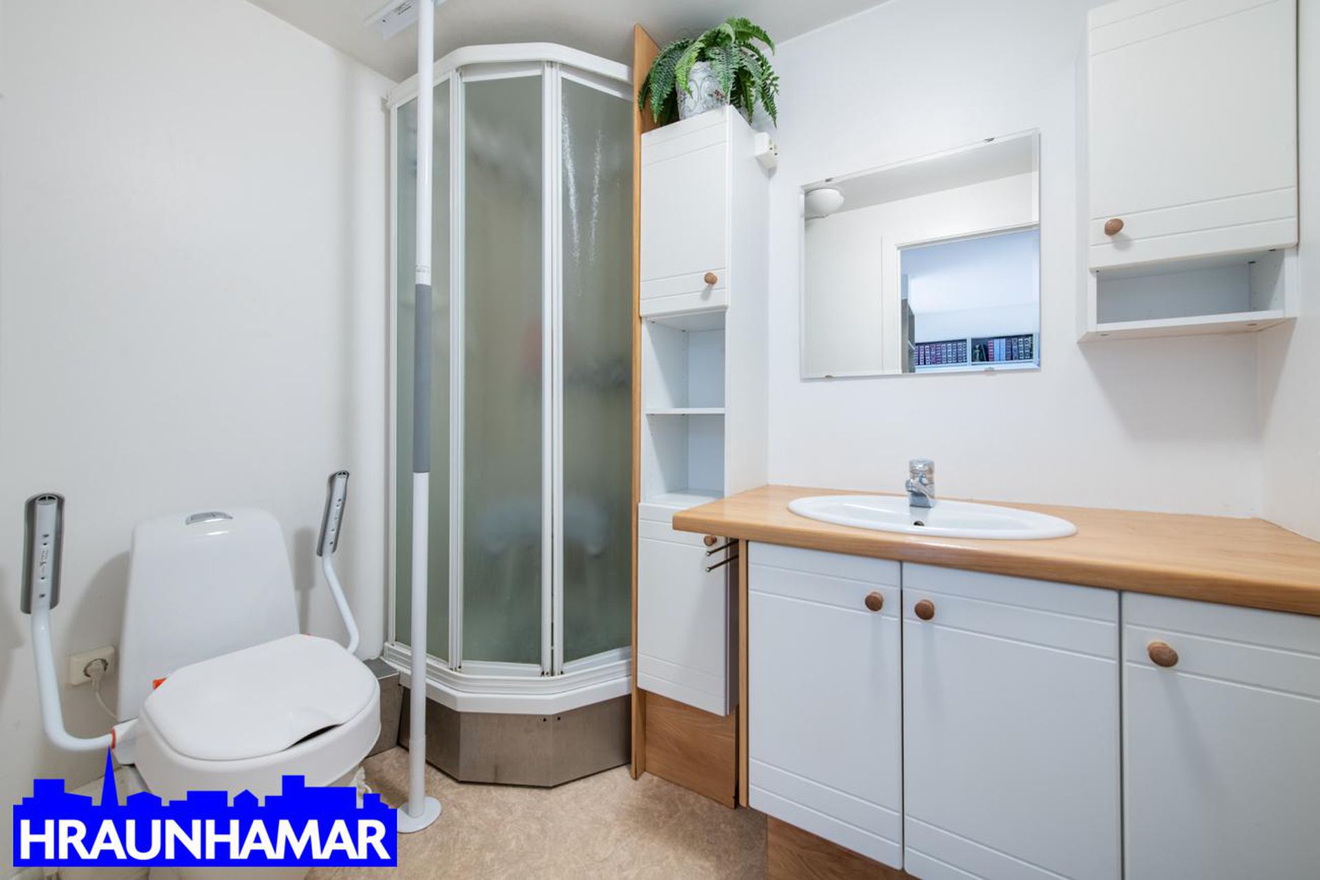 Baðherbergi á efri hæð með sturtu, gólfhita, þvottavélar- og þurrkaraaðstöðu. Baðherbergi á neðri hæð.