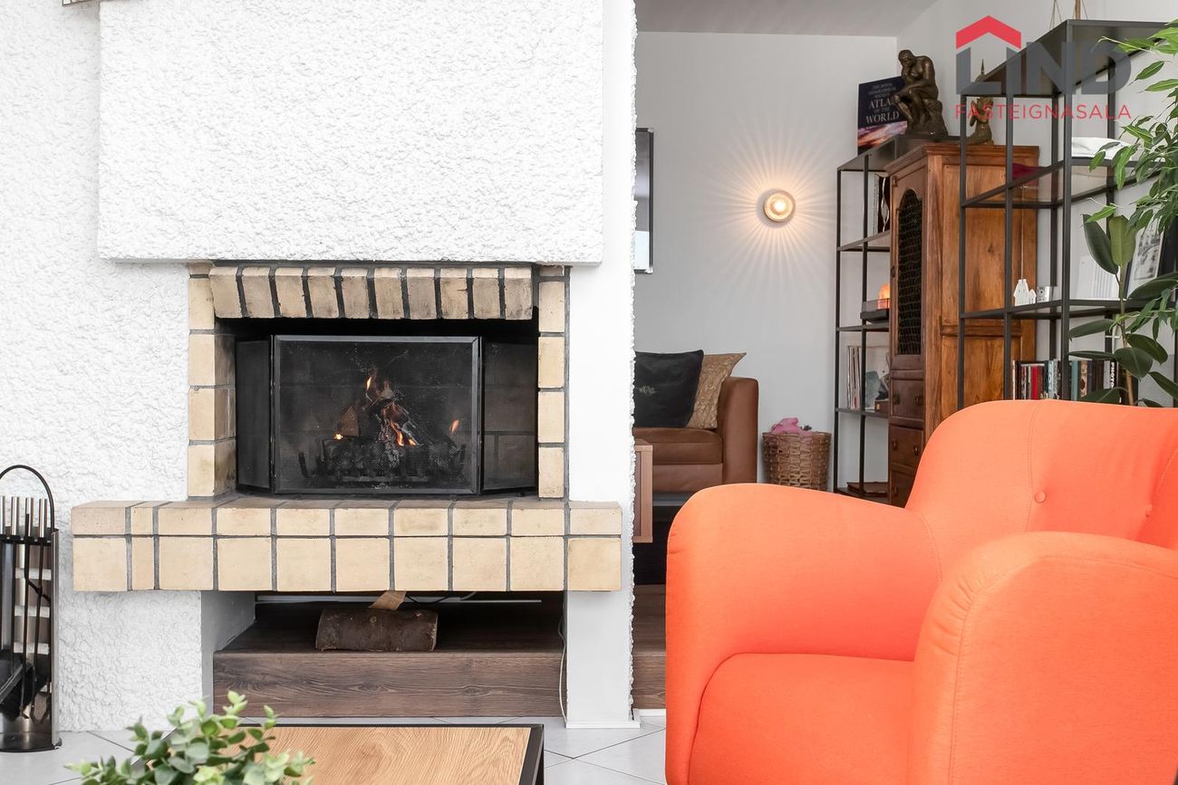 Björt stofa með opnu skipulagi að eldhúsi, stórum gluggum, arni og harðparketi á gólfi.