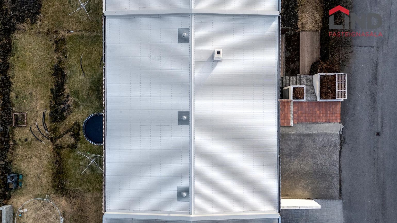Innbyggður bílskúr með heitu/köldu vatni og háaloftsgeymslu.