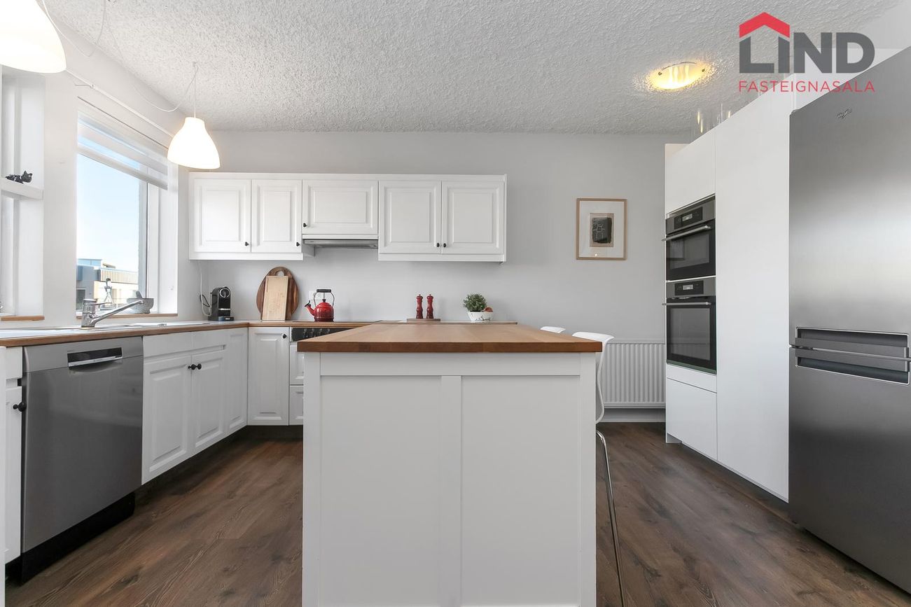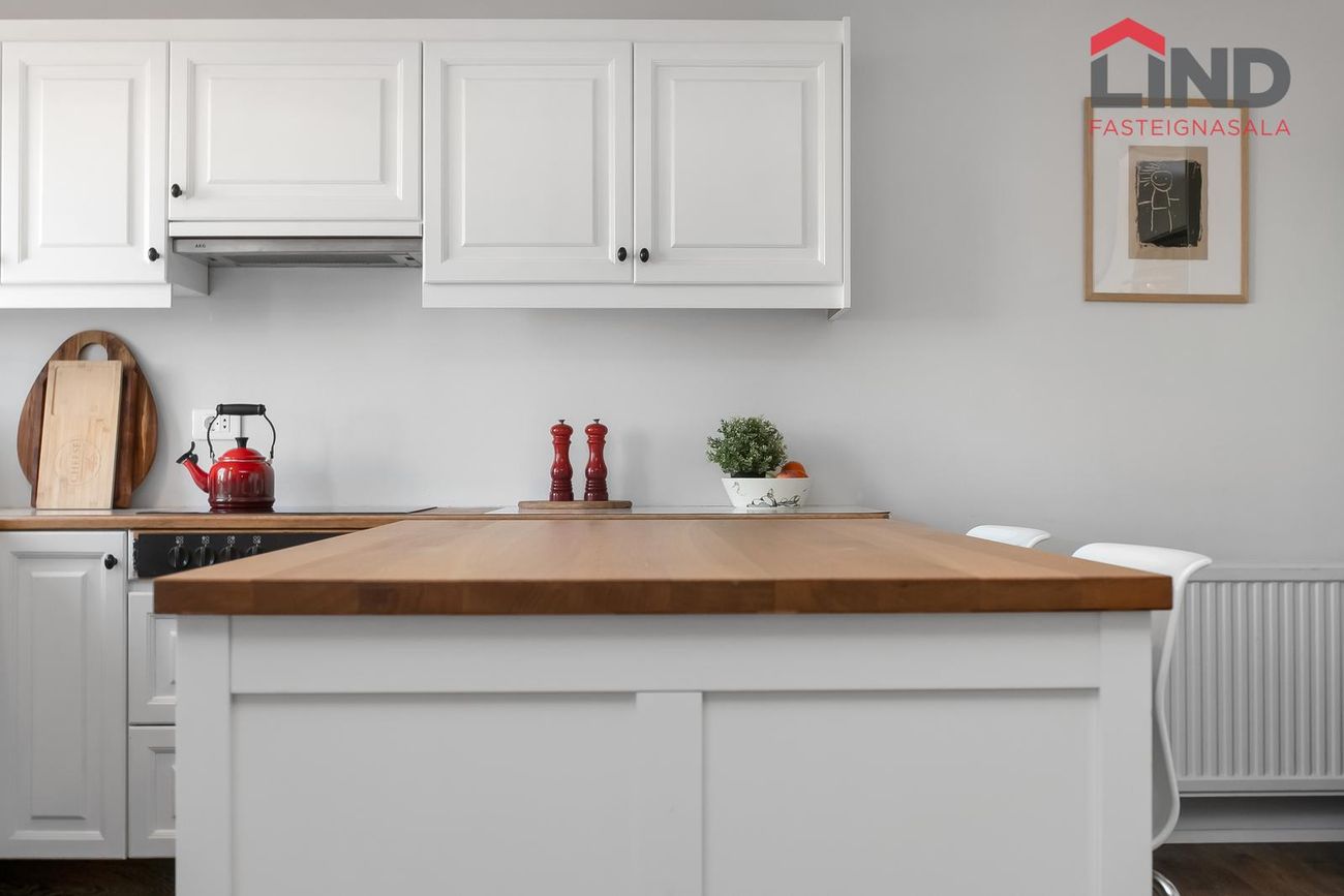 Bjart eldhús með hvítri innréttingu, opnanlegu fagi, bakaraofni, combiofni, frístandandi eyju og harðparketi.