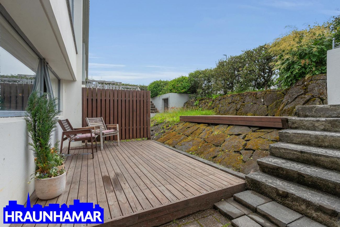 Bakgarður með útigöngu frá neðri hæð. Suðurhallandi pallur framan við hús.
