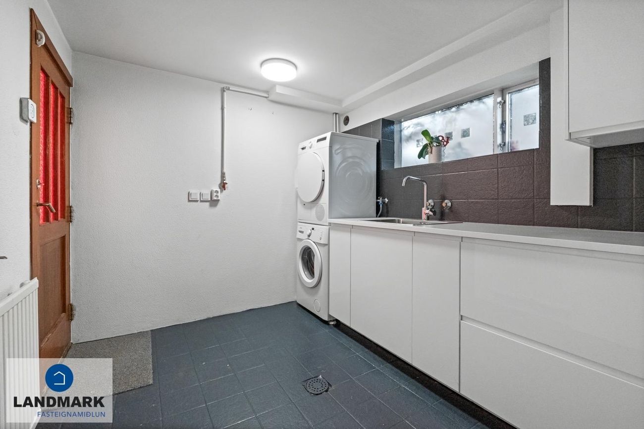 ganga niður í kjallarann sem skiptist í opið rými, baðherbergi með flísum og sturtu, neðri skáp, hiti í gólfi. Innaf opna rýminu er þvottahús með innréttingu og glugga, inngangur er inn í þetta rými. Bílskúrinn er opinn sem væri hægt að nýta sem stórt herbergi, inngangur er einnig inn í þetta rými. Góð geymsla innaf.