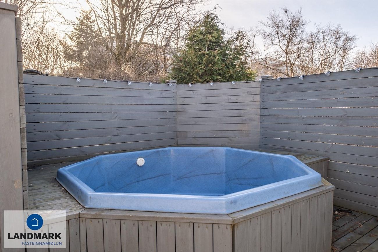 rúmgóð parketlögð stofa með útgangi út á hellulagða verönd og þaðan út í garð þar sem er heitur pottur. Frá gangi / holi er gengið upp á efri pall. Parketlagður