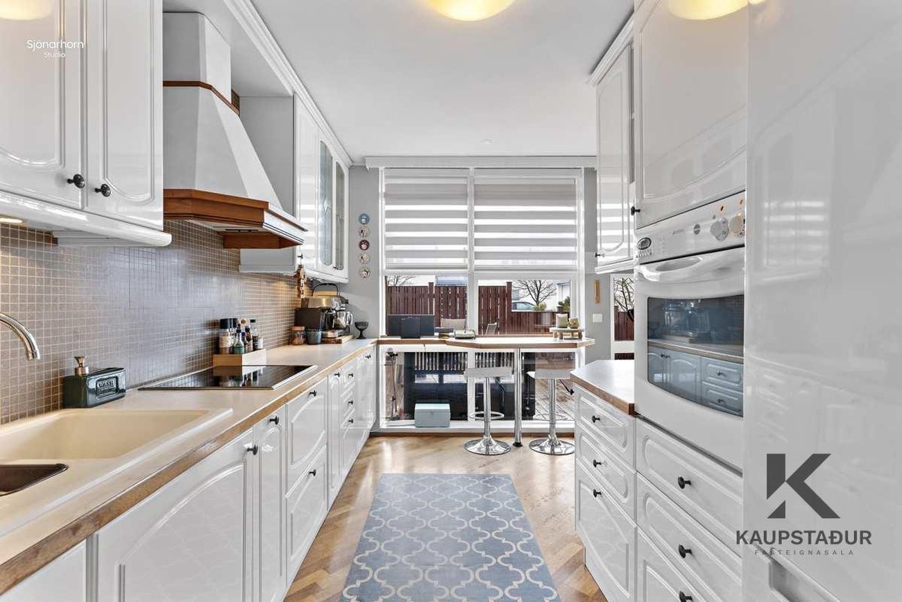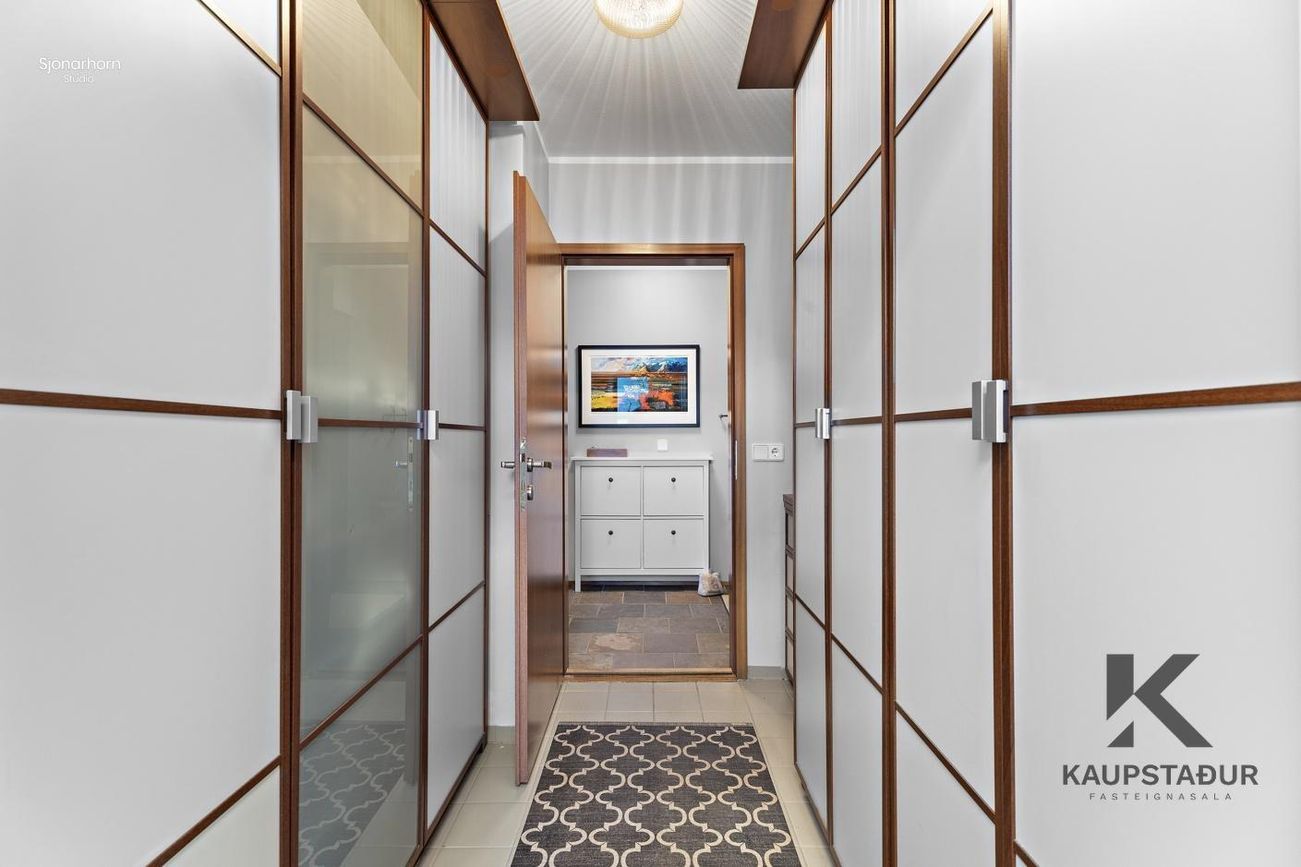 Gólfefni: flæðandi parket er á alrými, eldhúsi, gangi og herbergjum. Flísar á forstofu, baðherbergi, geymslu og þvottahúsi. Steypt gólf í bílskúr og geymslu þar inn af.