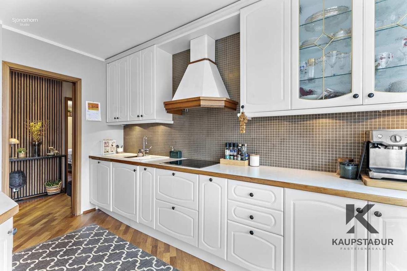 Eldhús, hvít innrétting með fulningum, helluborð og vifta, ofn í vinnuhæð, hvítur keramik vaskur og uppþvottavél. Gert er ráð fyrir ísskáp í innréttingu. Ísskápur og uppþvottavél fylgja.