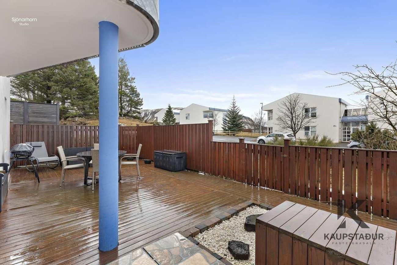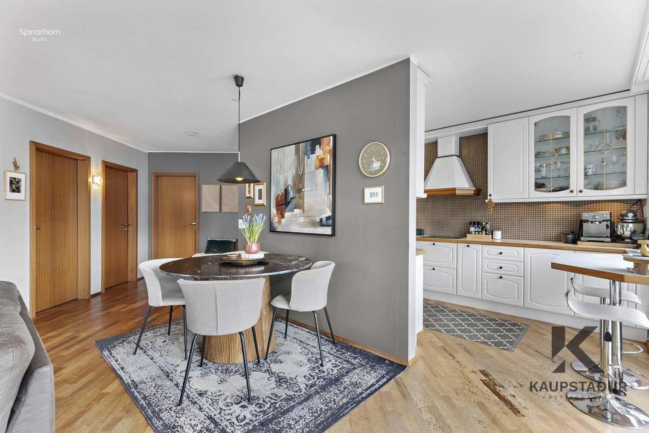 Stofa og borðstofa er saman í einu rými með parket á gólfum og útsýni yfir Esjuna. Útgengt út á rúmgóða timburverönd sem snýr í suðvestur með skjólveggjum.