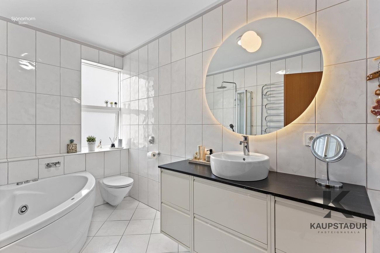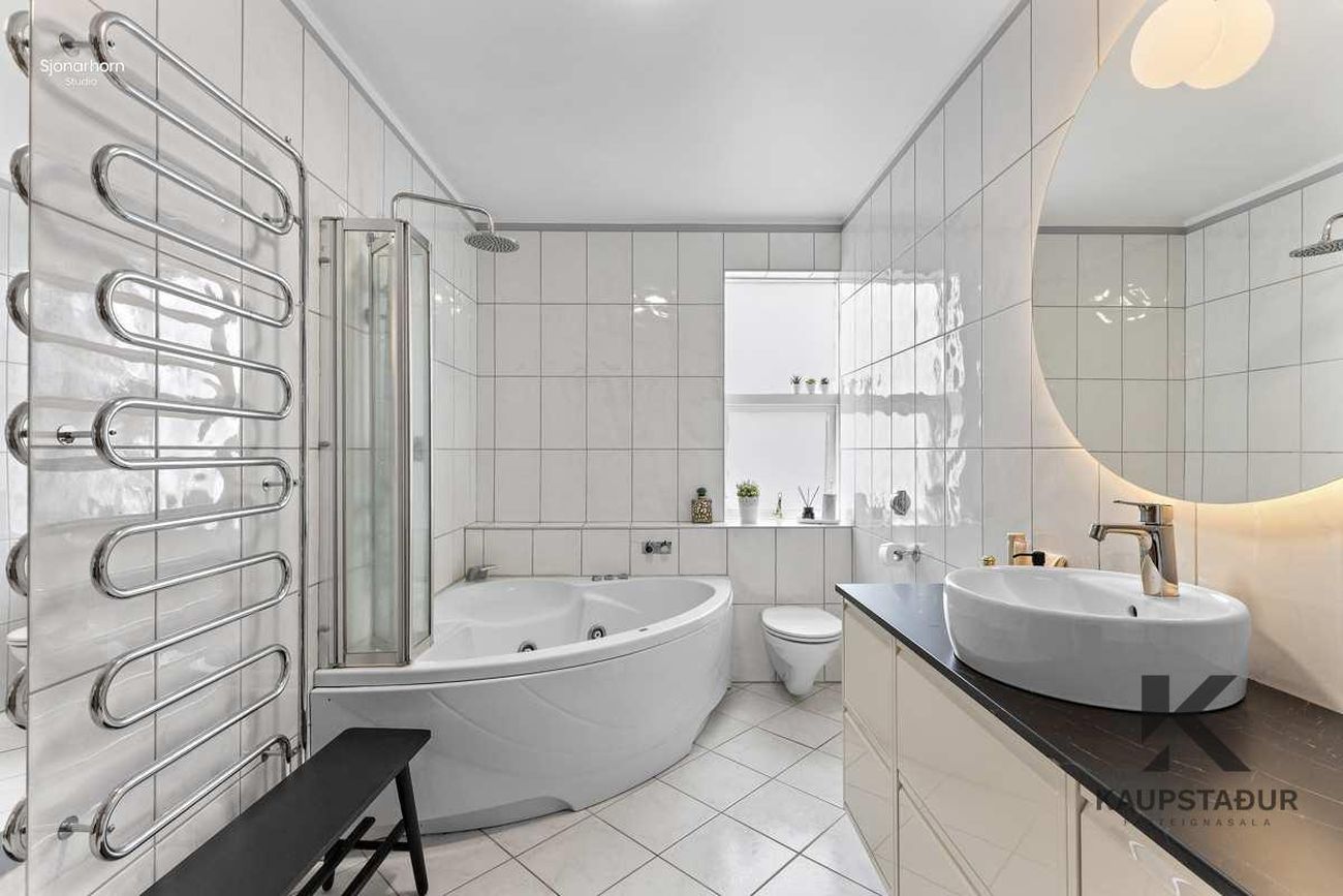 Baðherbergi, flísalagt í hólf og gólf, hiti í gólfi, hvít háglans vaskinnrétting og hár skápur, upphengt salerni, hornbaðkar, handklæðaofn og gluggi.