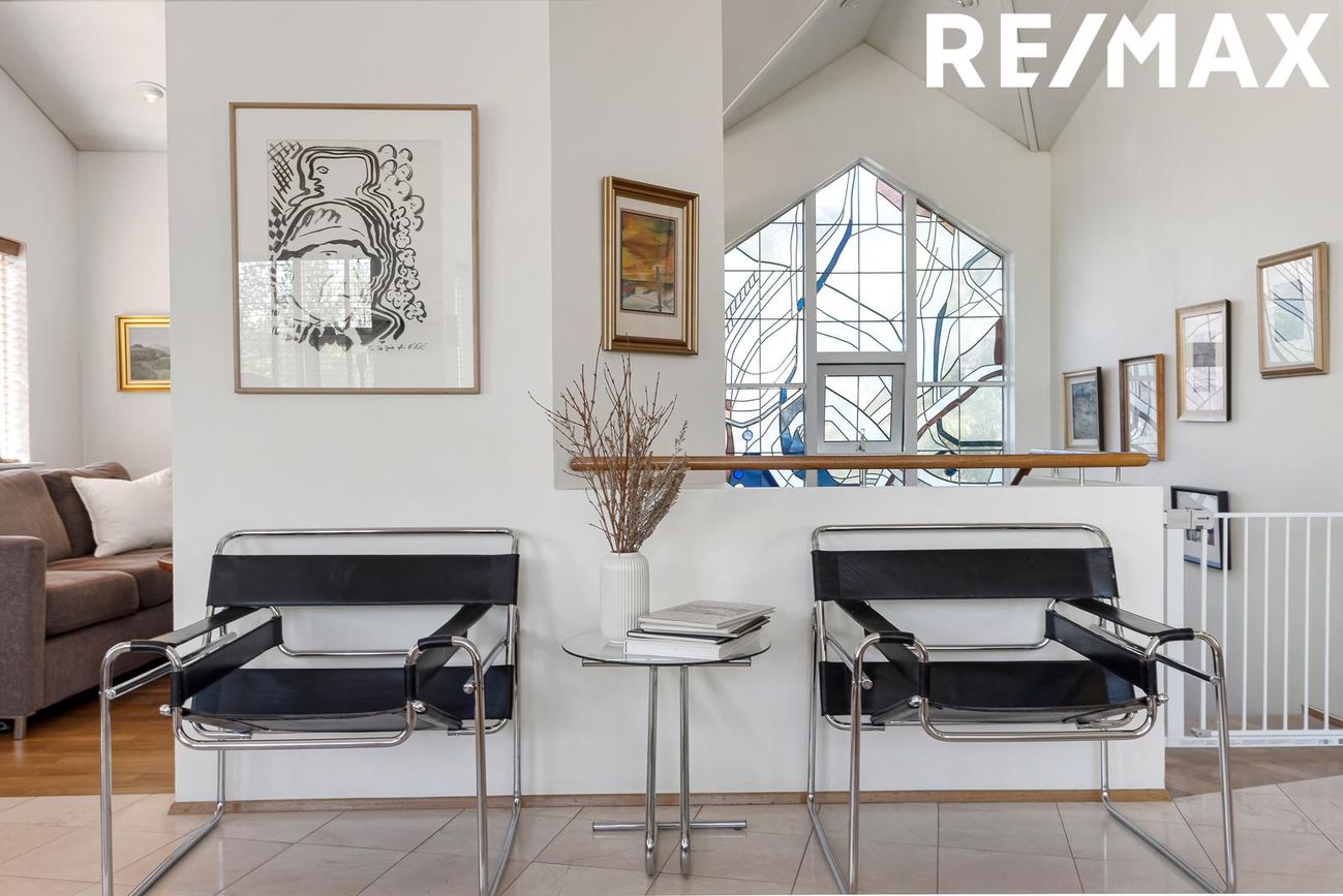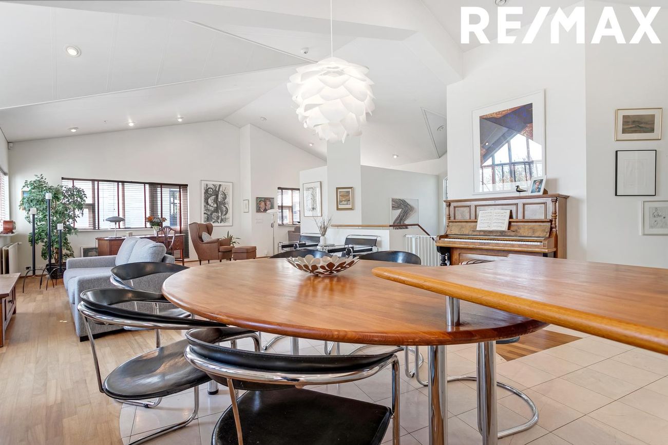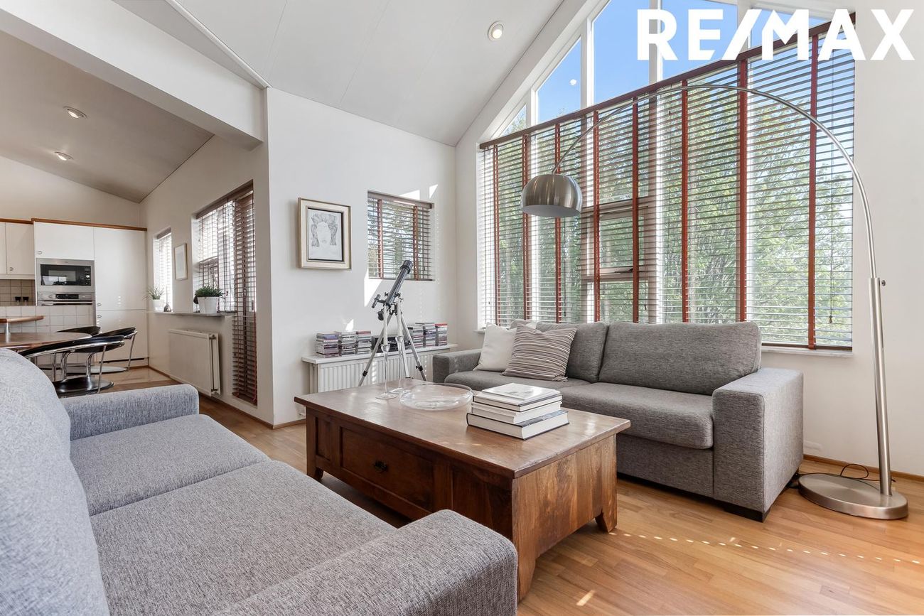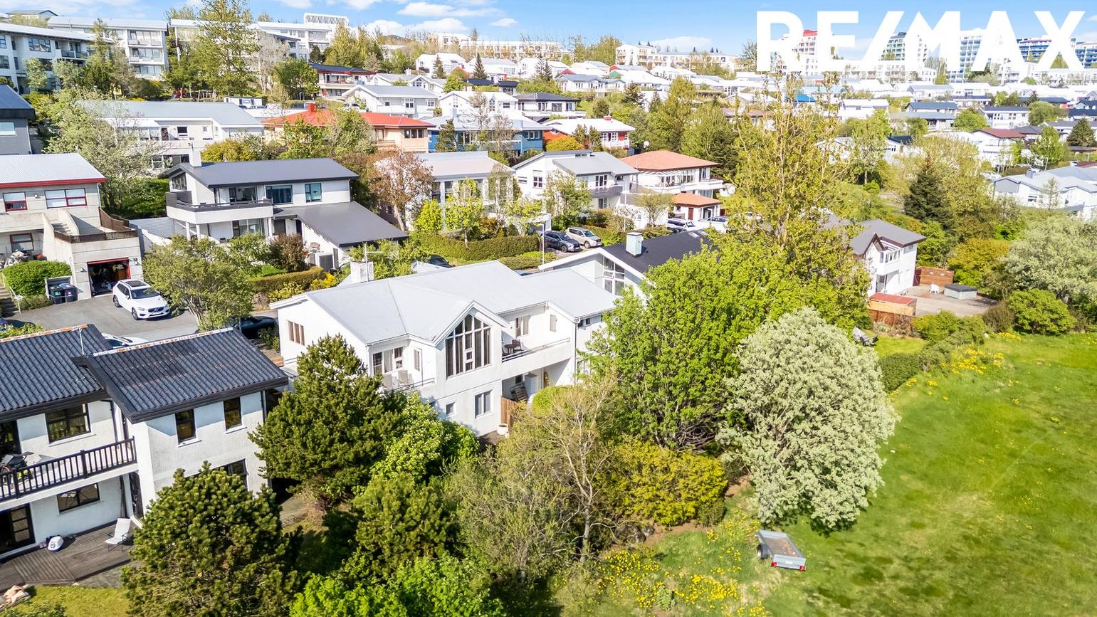 Nánari lýsing Efri hæð: Við inngang er komið inn í anddyri og gang. Á hægri hönd er herbergi, merkt á teikningu sem húsbóndaherbergi. Í forstofu er gestasnyrting og í framhaldi af henni stórt og mikið eldhús með borðstofuborði. Stofan er rúmgóð og í hluta hennar er sjónvarpsrými. Útgengi er á s valir í suður frá borðstofu og á aðrar svalir sem eru bæði í suður og vestur. Bílskúr. Íbúðinni tilheyrir bílskúr sem er áfastur húsinu. Bílskúrnum er skipt í tvö herbergi, ytra og innra. Þar er heitt. og kalt vatn, sjálfvirk opnun og bílahleðslustöð. Gluggar í suður og austur og hurð út á svalir í austur. Auðvelt að breyta aftur í bílskúr.