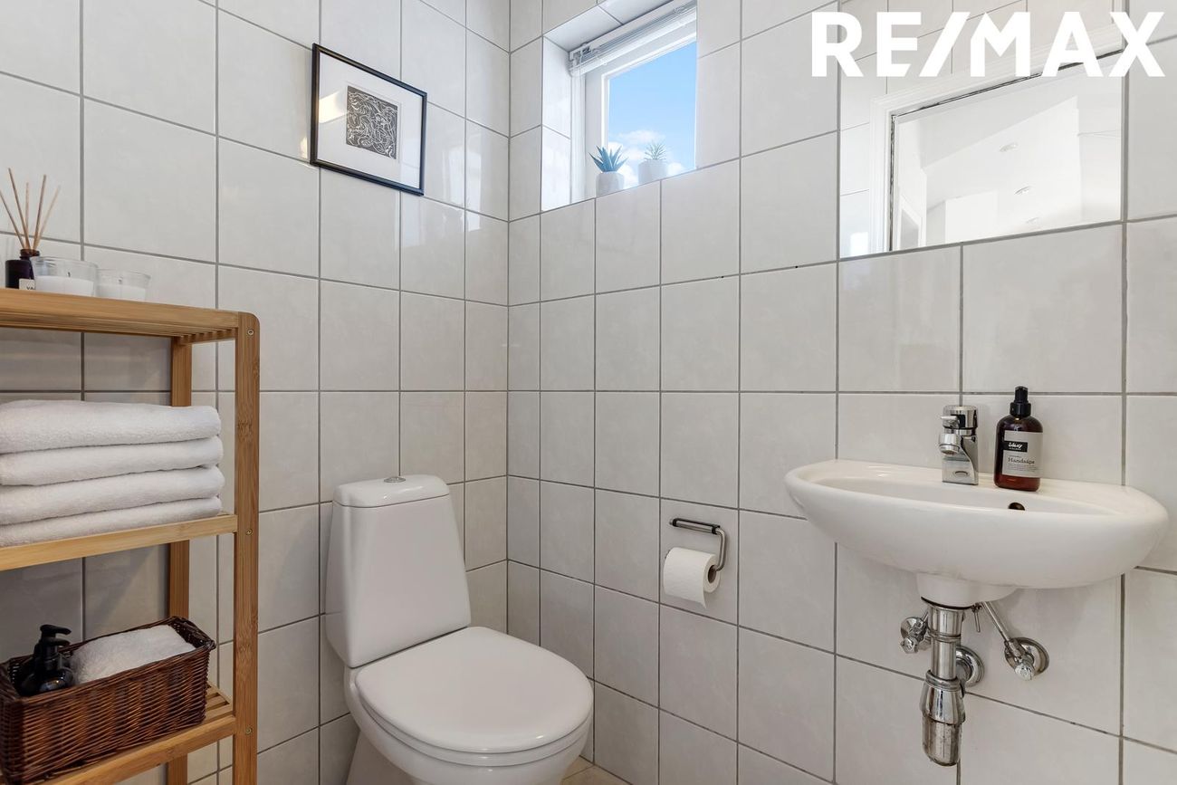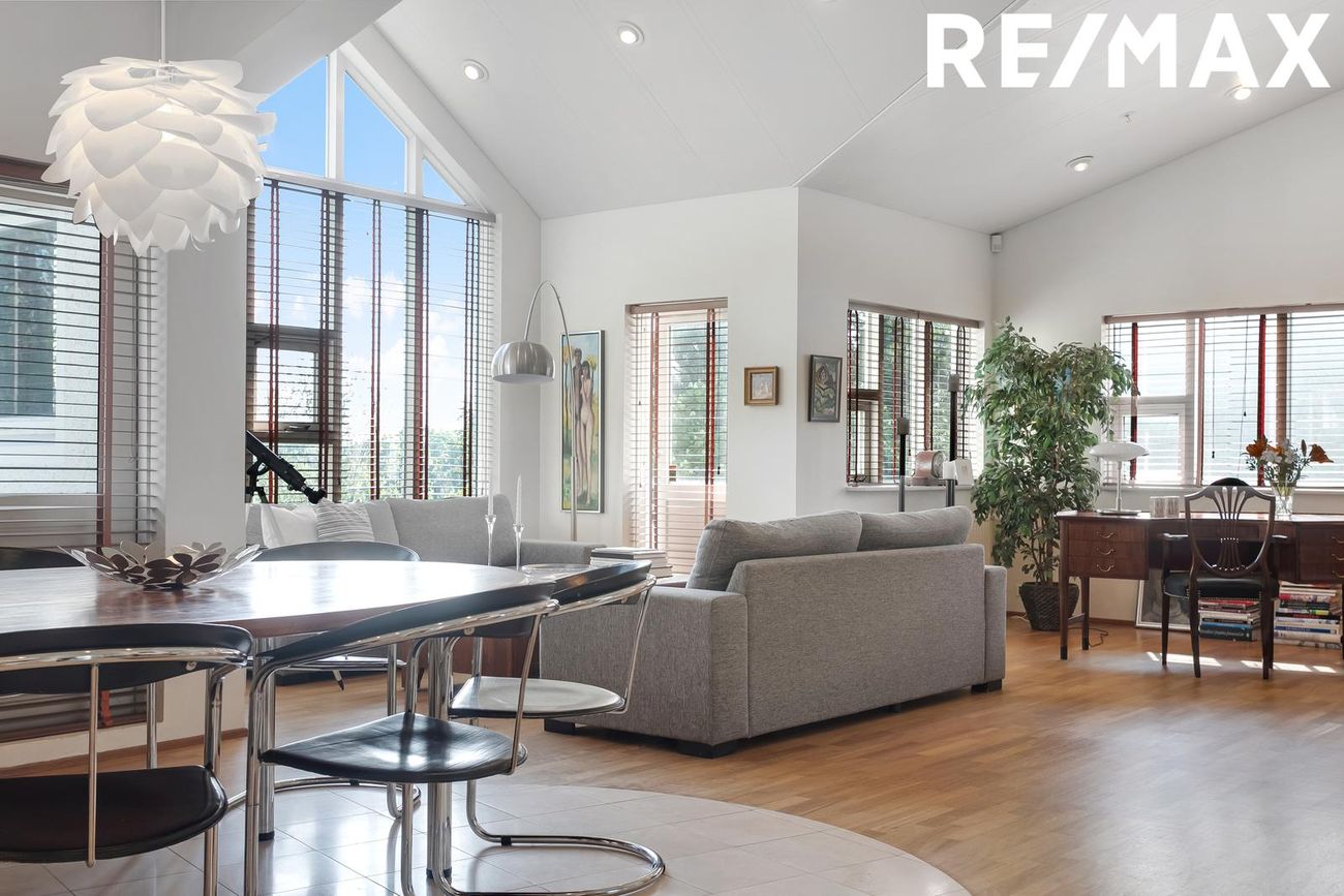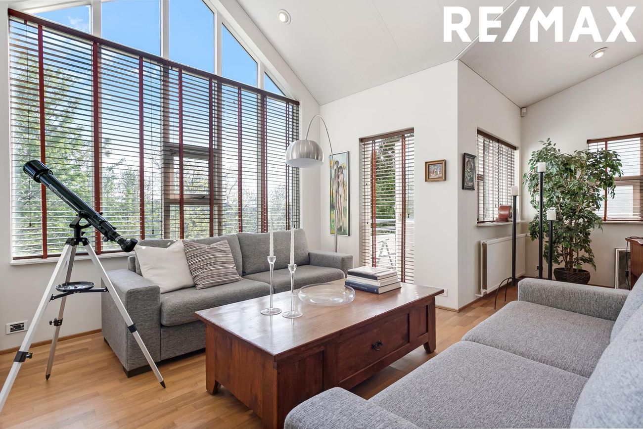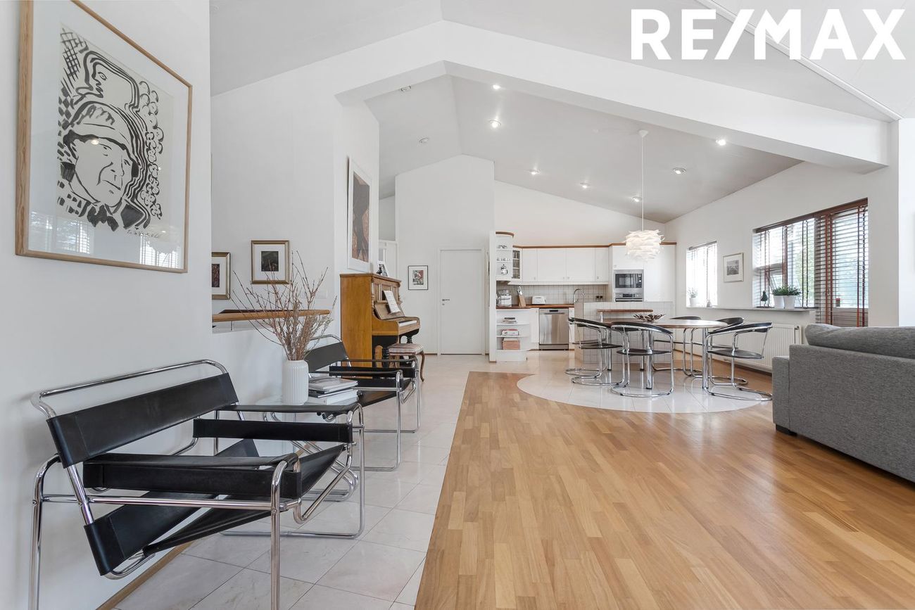 Nánari lýsing Efri hæð: Við inngang er komið inn í anddyri og gang. Á hægri hönd er herbergi, merkt á teikningu sem húsbóndaherbergi. Í forstofu er gestasnyrting og í framhaldi af henni stórt og mikið eldhús með borðstofuborði. Stofan er rúmgóð og í hluta hennar er sjónvarpsrými. Útgengi er á s valir í suður frá borðstofu og á aðrar svalir sem eru bæði í suður og vestur. Bílskúr. Íbúðinni tilheyrir bílskúr sem er áfastur húsinu. Bílskúrnum er skipt í tvö herbergi, ytra og innra. Þar er heitt. og kalt vatn, sjálfvirk opnun og bílahleðslustöð. Gluggar í suður og austur og hurð út á svalir í austur. Auðvelt að breyta aftur í bílskúr.