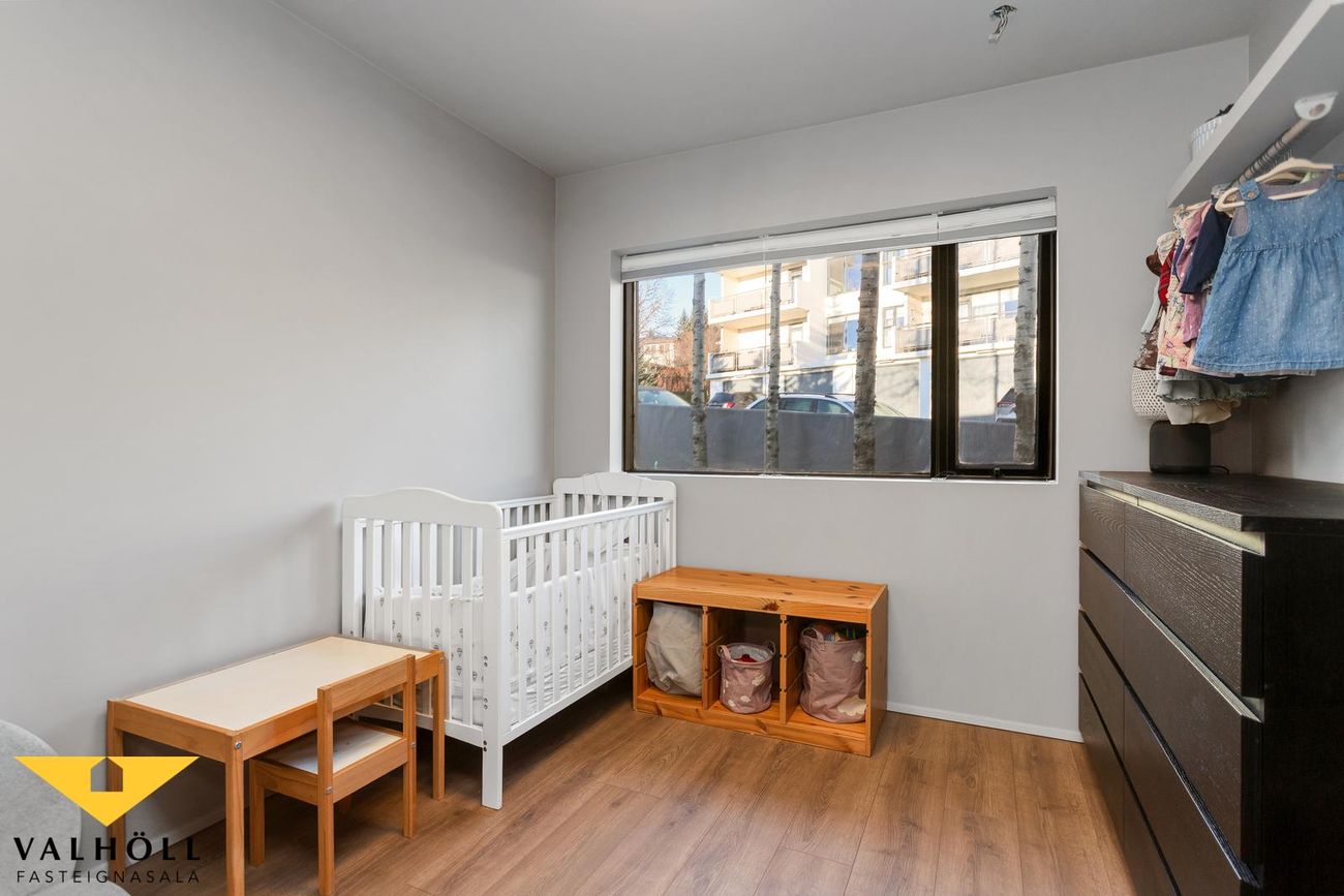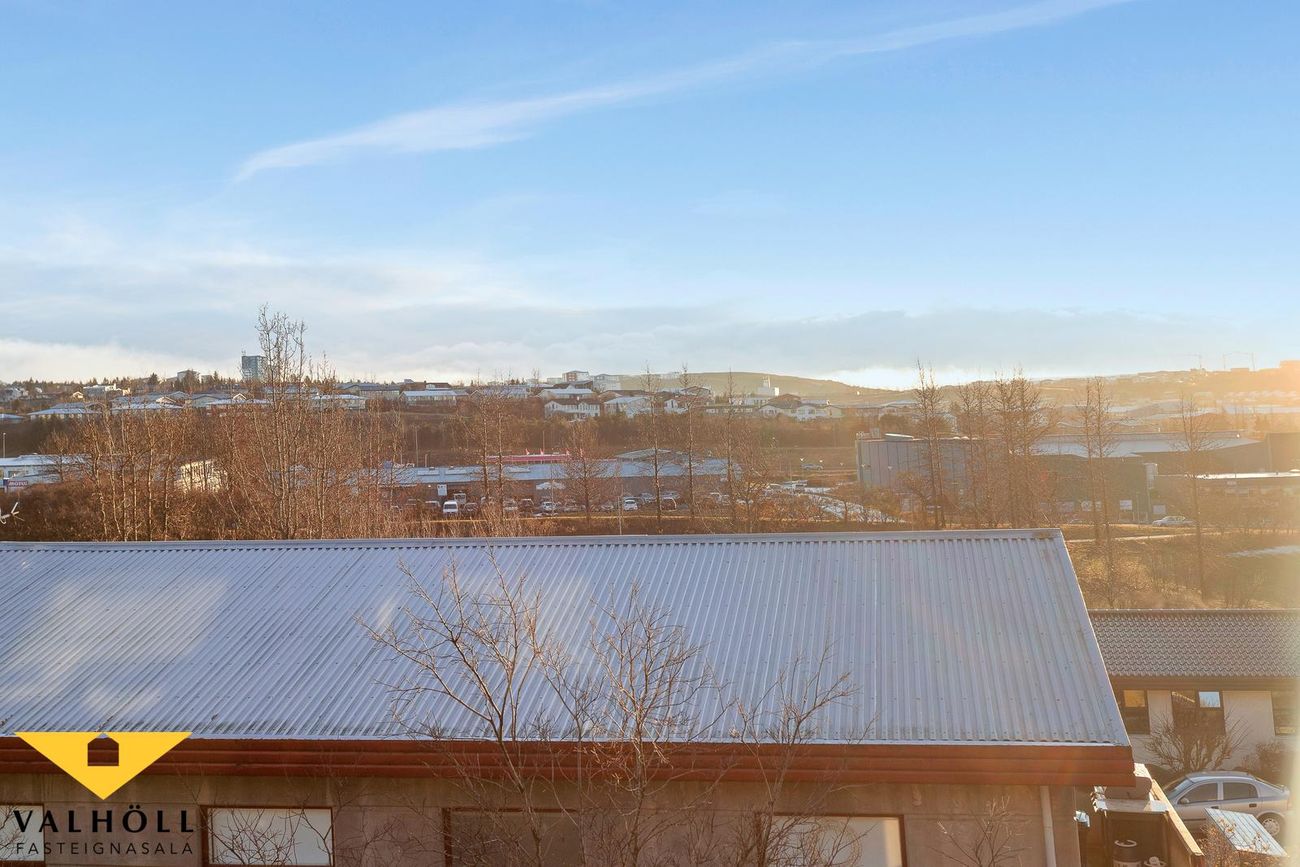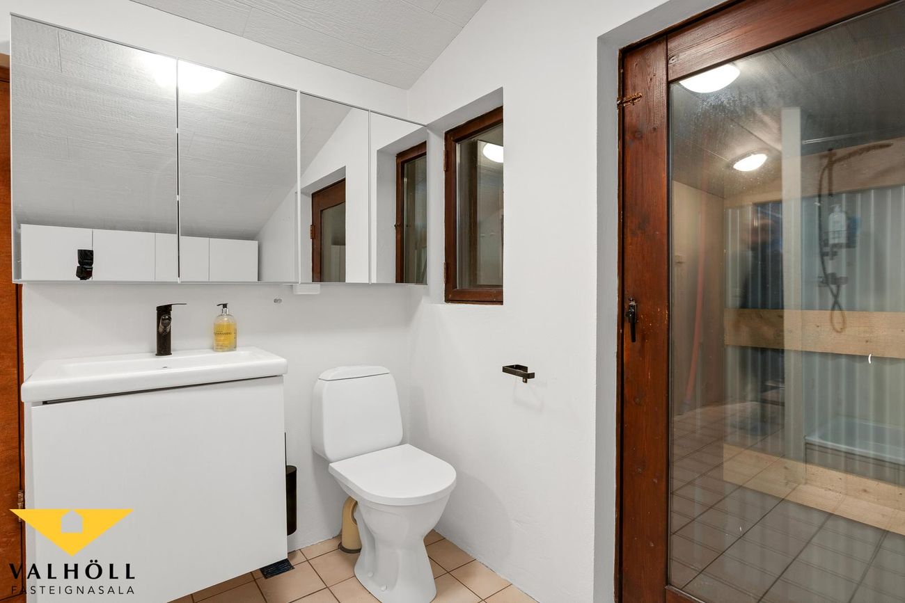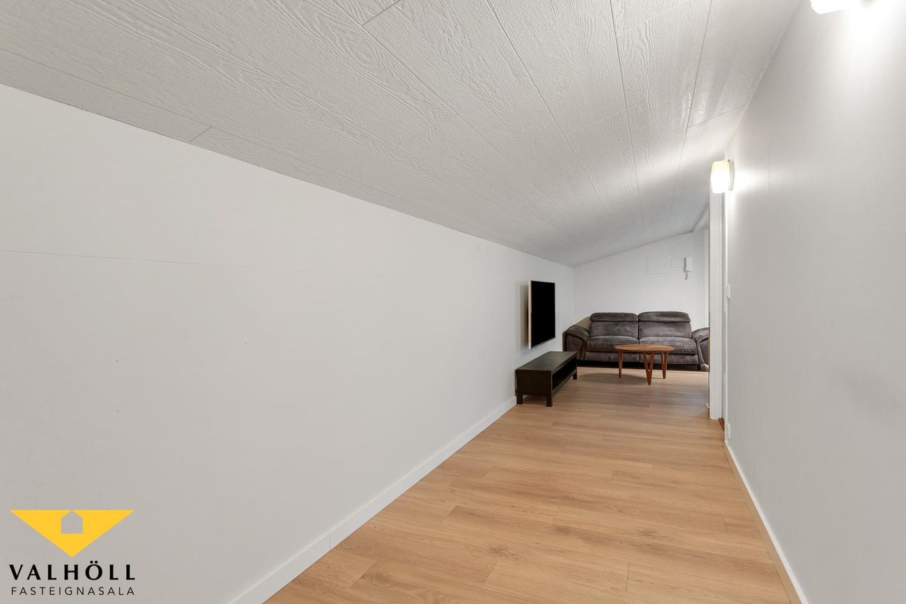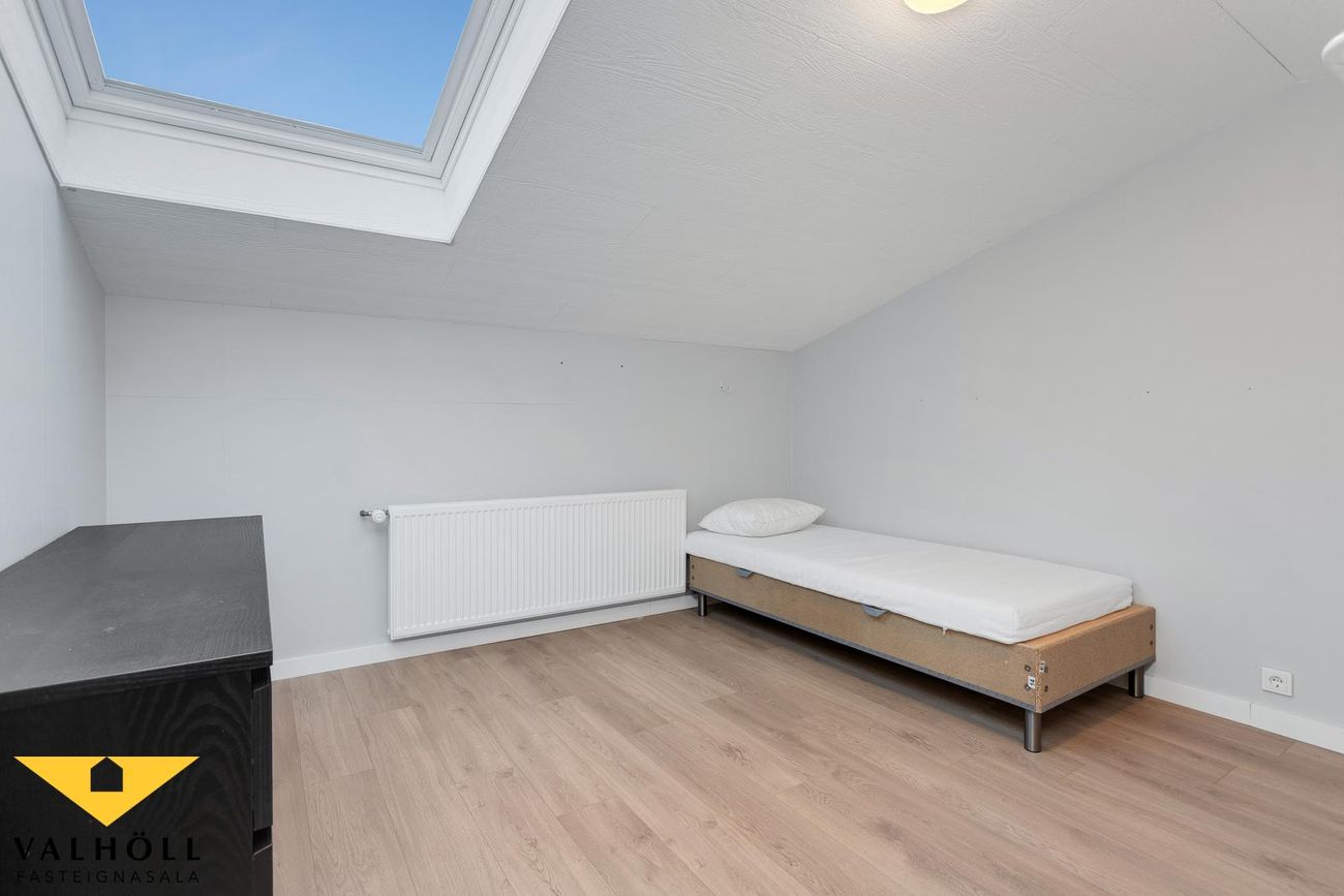 Risíbúð:Úr innangi er gengið inn í stigagang sem leiðir á efri hæð. Á efri hæð eru tvö rúmgóð svefnherbergi, sjónvarpshol, eldhús, baðherbergi með sturtu og tengi fyrir þvottavél og þurrkara ásamt sauna herbergi. Beggja vegna risíbúðar eru stór rými sem nýta má sem geymslur. Þakgluggar eru á svefnherbergjum og eldhúsi. Efri hæð býður upp á talsverða möguleika til nýtingar.