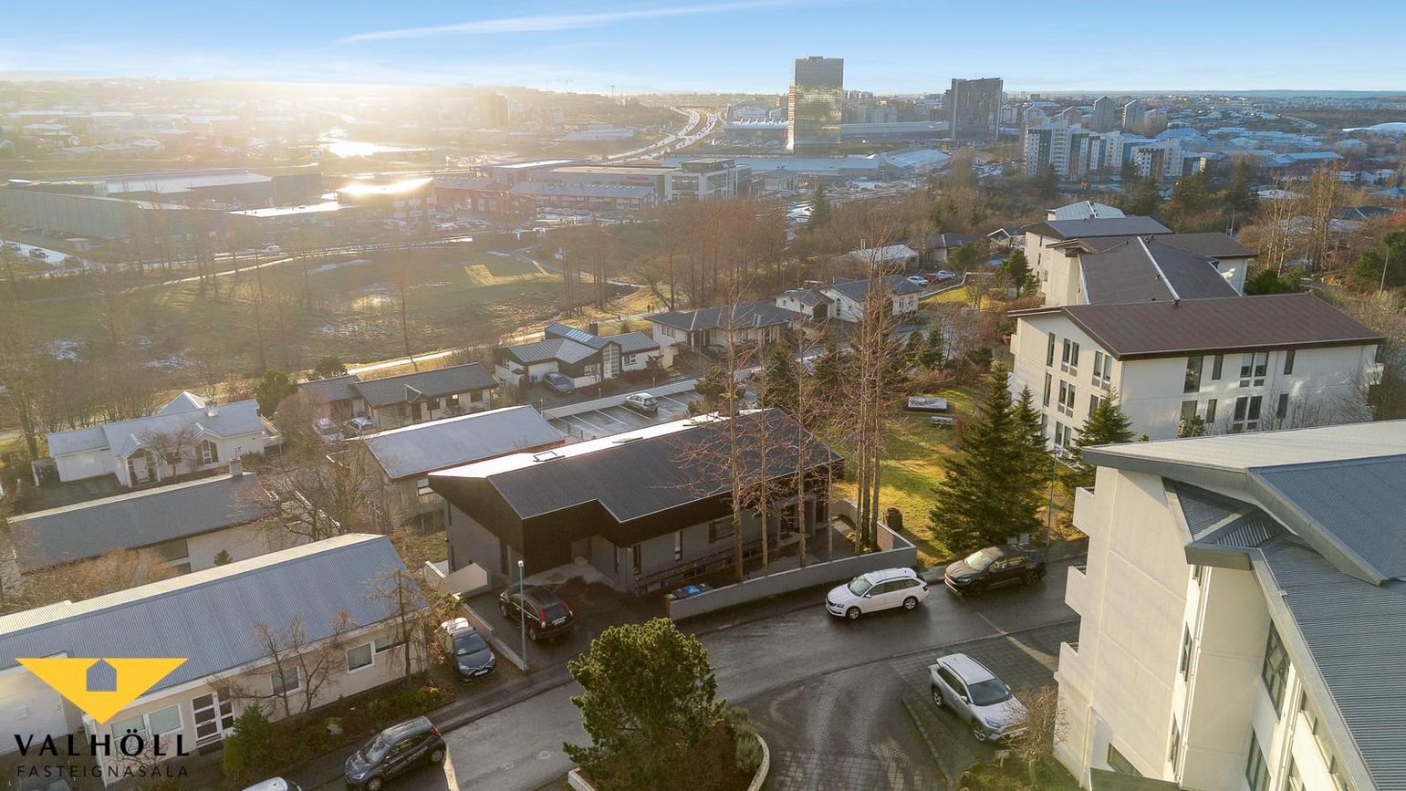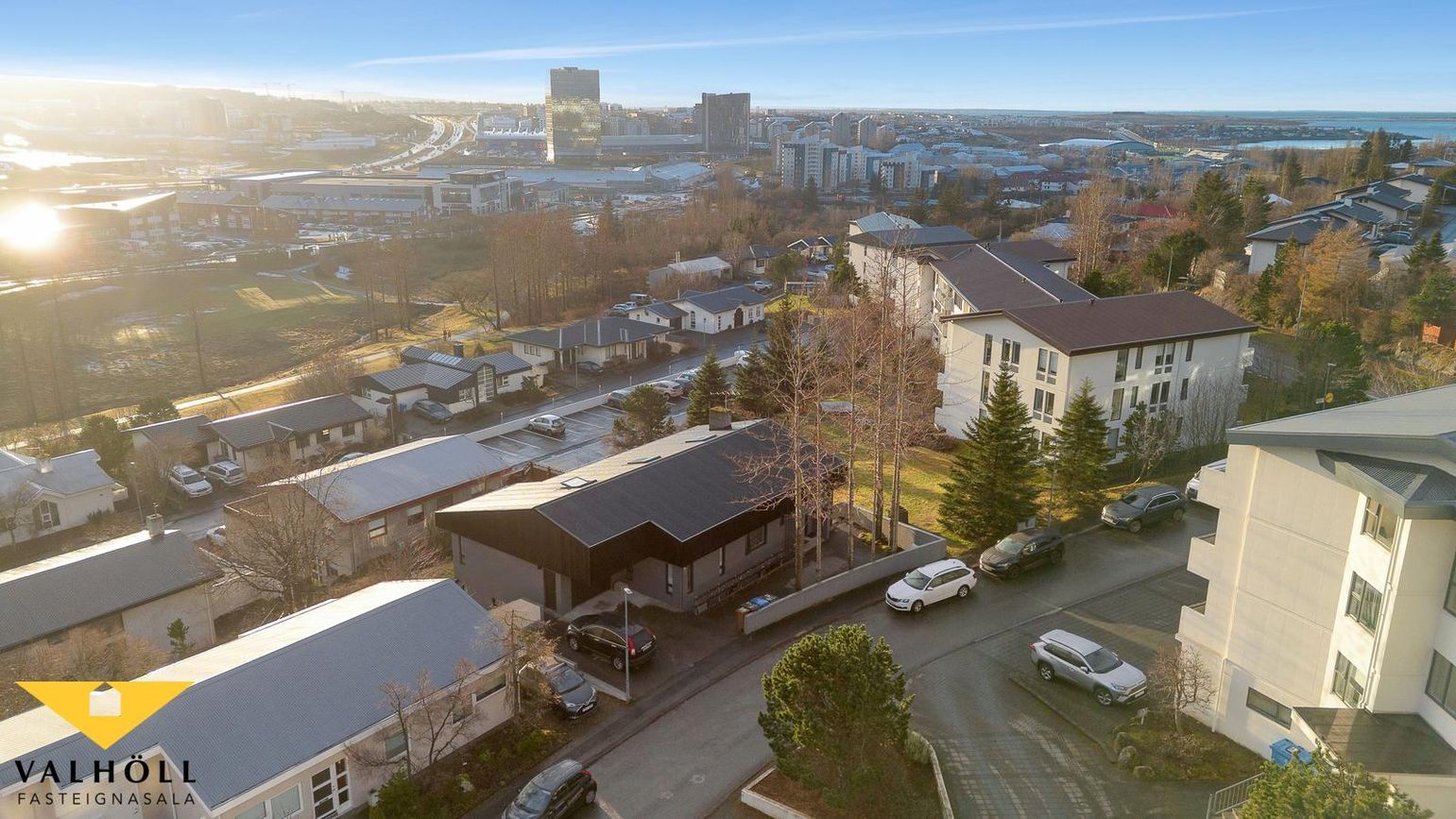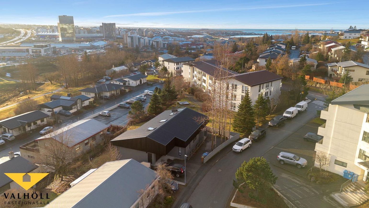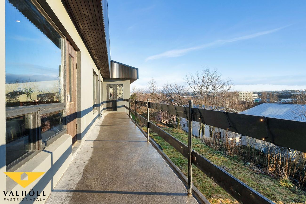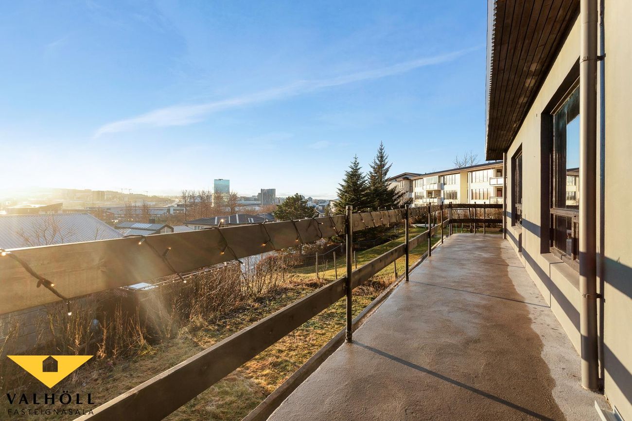 Útgengi er úr alrými á stórar útsýnissvalir til suðurs sem ná í L í kringum húsið. Af svölum er einnig hægt að ganga inn í bílskúr að baka til.