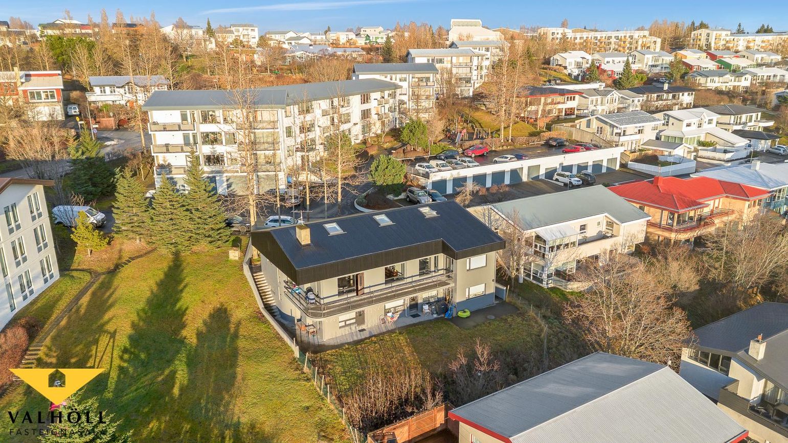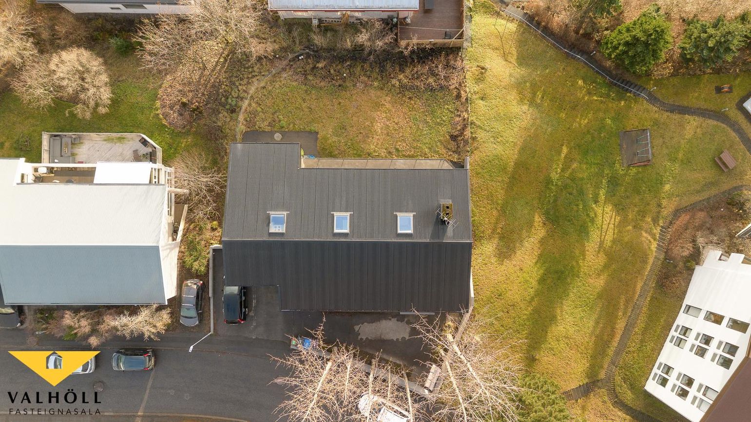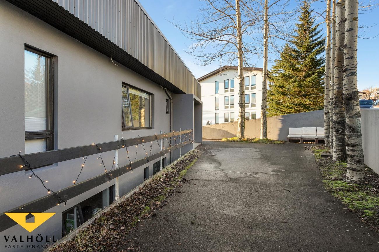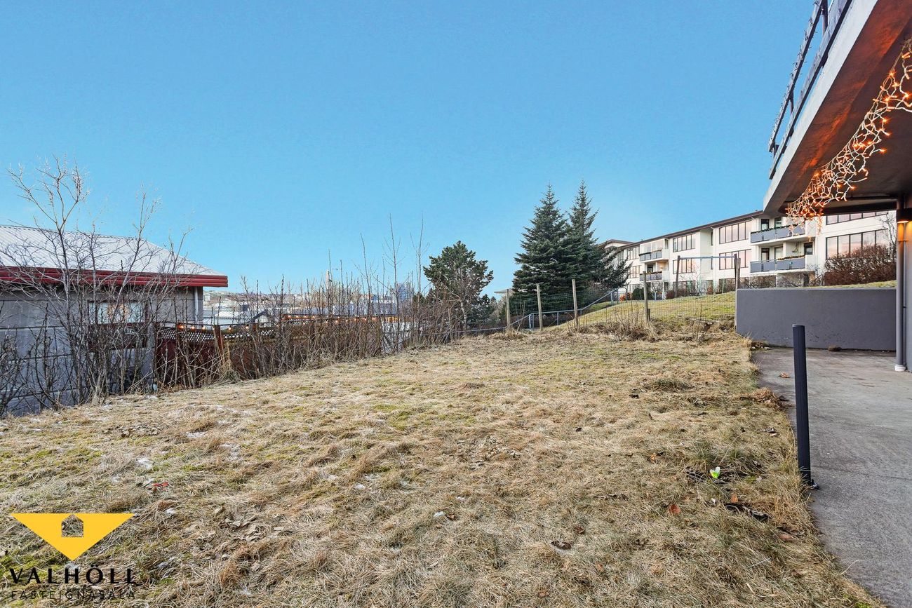 Lóð: Steypt bílaplan og stéttar eru fyrir framan húsið. Steyptir skjólveggir. Lóð hefur verið skipt milli eigenda skv. samkomulagi og er gengið niður á sérafnotarétt um stiga hægra megin við húsið.