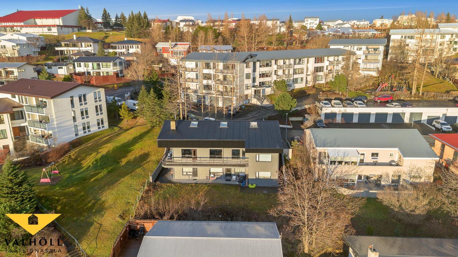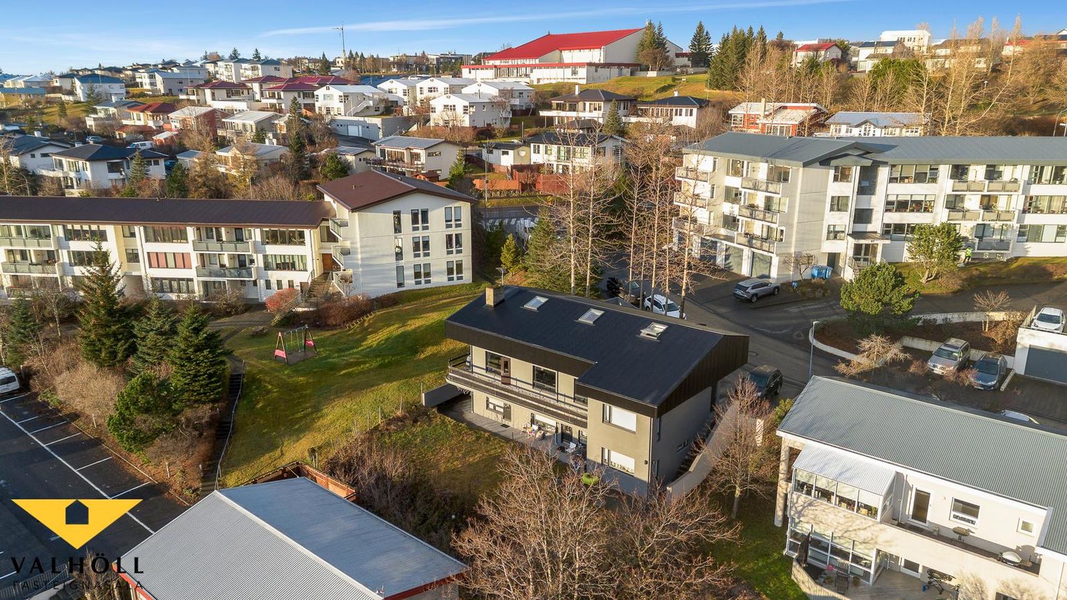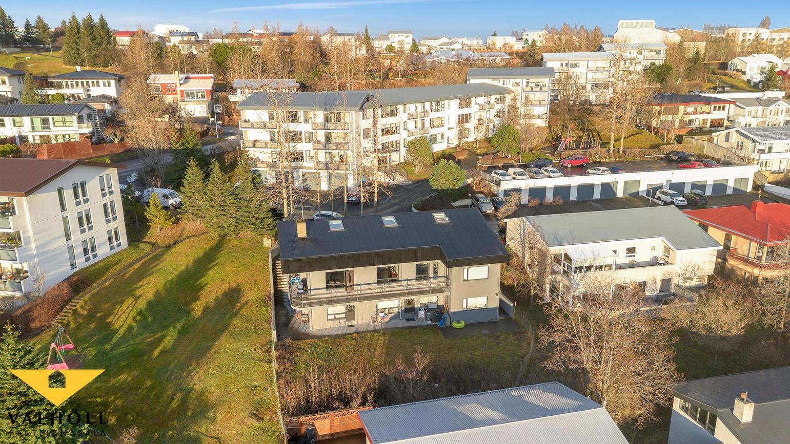 Lóð: Steypt bílaplan og stéttar eru fyrir framan húsið. Steyptir skjólveggir. Lóð hefur verið skipt milli eigenda skv. samkomulagi og er gengið niður á sérafnotarétt um stiga hægra megin við húsið.