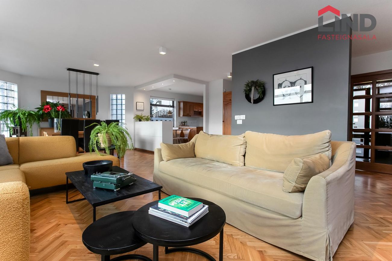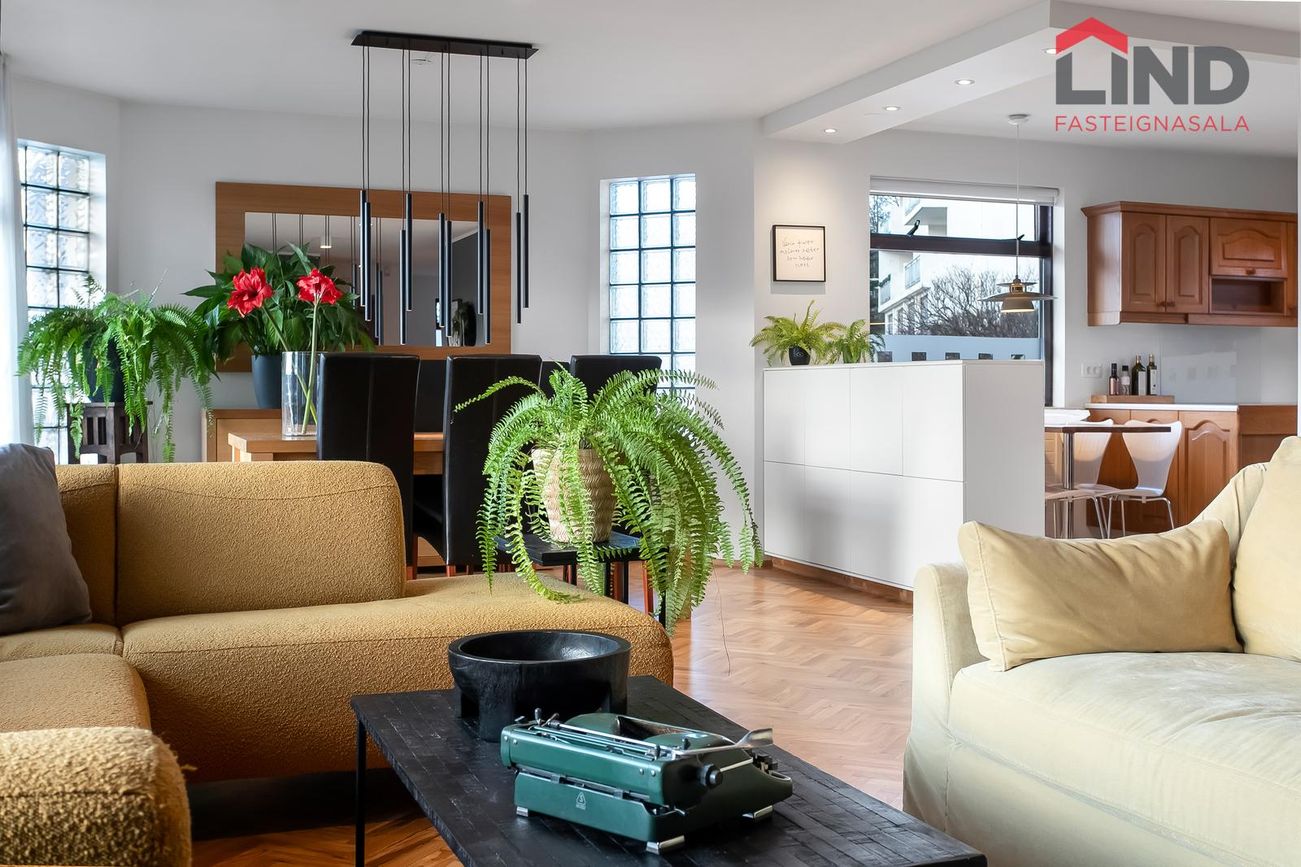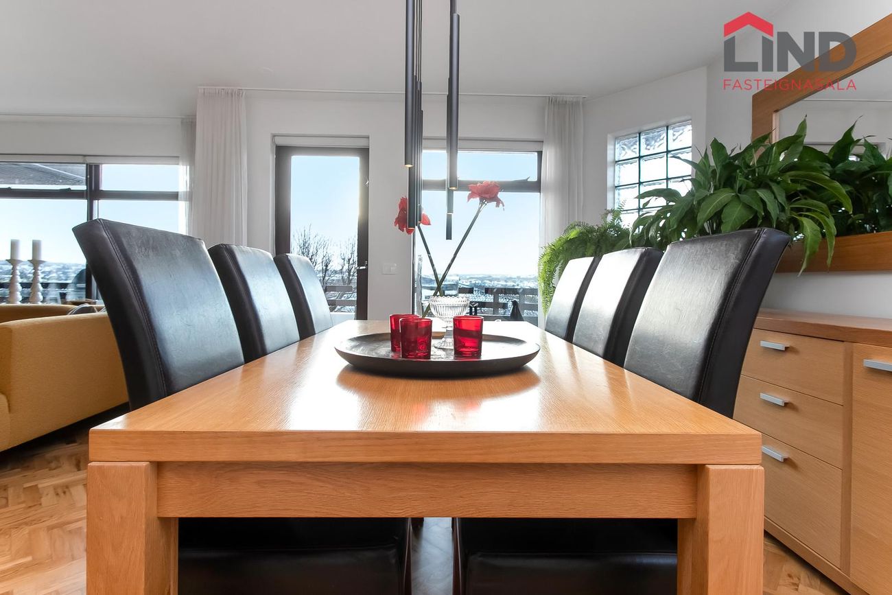 Stofur eru opnar, rúmgóðar og bjartar með stórum gluggum og stórum sólríkum svölum móti suðri. Útsýni úr stofum yfir Kópavoginn, til Bláfjalla í austri og til suðurnesja í suðri, setustofa með arni liggur samhliða borðstofunni en frá henni er gengið út á svalirnar.
