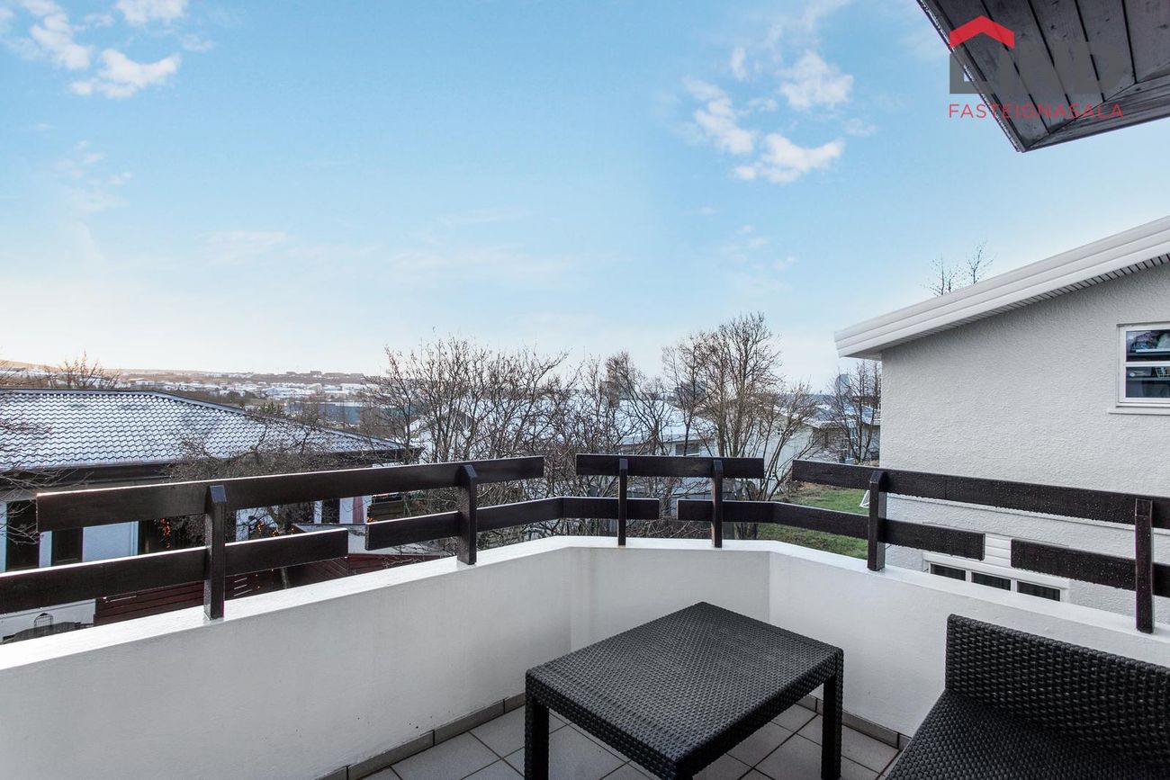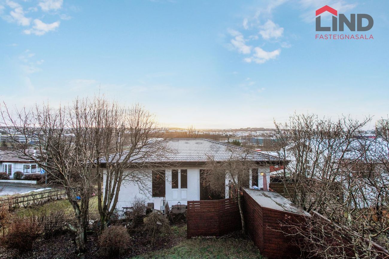 Húsið sem var byggt árið 1987 er skráð 252,6 m2 skv. Fasteignaskrá Þjóðskrár en um er að ræða fjölskylduvæna eign með tvöföldum bílskúr. Íbúðarhluti er 209,4 m2 og tvöfaldan vandaðan bílskúr er 43,4 m2. Íbúðin á neðri hæð sem er með sérinngangi er 62,1 m2. Samtals er eignin 314,7 m2. Snjóbræðsla er á bílaplani framan við bílskúrshurðar, undir hellulögðum stéttum framan við húsið, í tröppum vestan meginvið húsið sem liggja niður í garðinn og að íbúðinni niðri. Nánari lýsing; Húsið er staðsteypt, á tveimur hæðum – aðkoma að efri hæð með miklu útsýni.Forstofan er flisalögð með gólfhita (endurgert 2016).