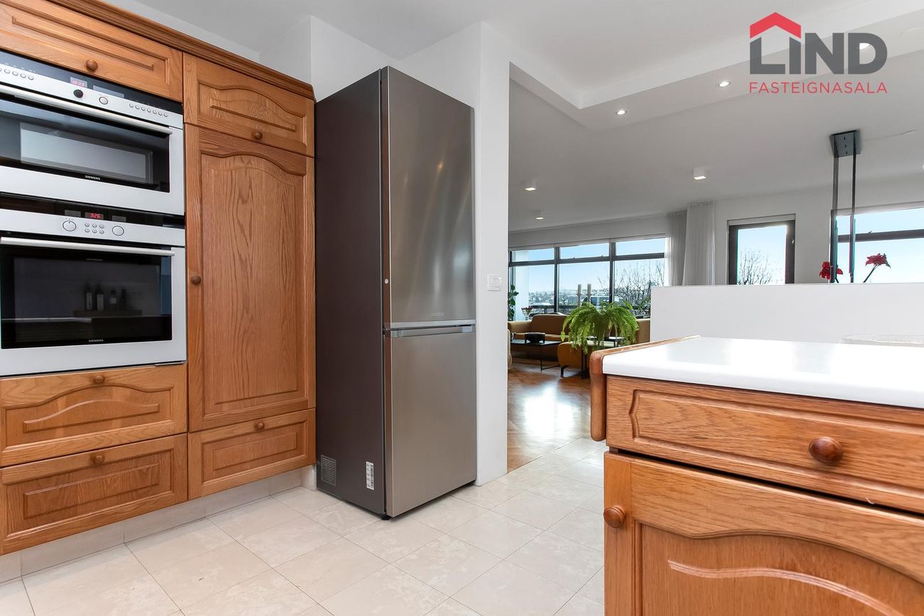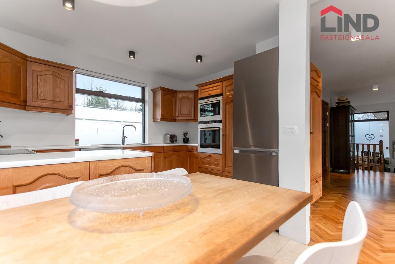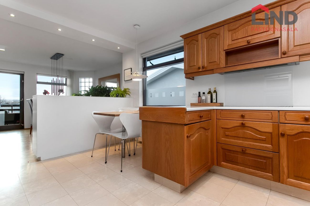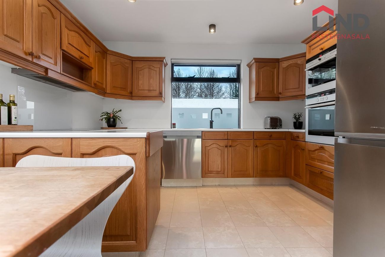 Eldhús með eikarinnréttingu með gott skápa- og borðplássi, þar er tengi fyrir uppþvottavél, tveir ofnar og span-helluborð, gluggar er á tvo vegu og borðkrókur. Innrétting/ skápur í hálfa hæð aðskilur eldhús/borðstofu og skapar opið flæði milli rýmanna.
