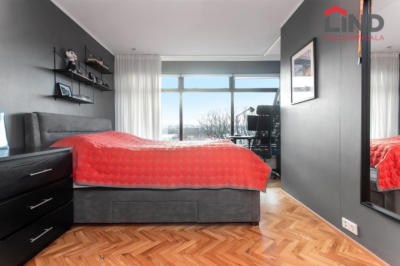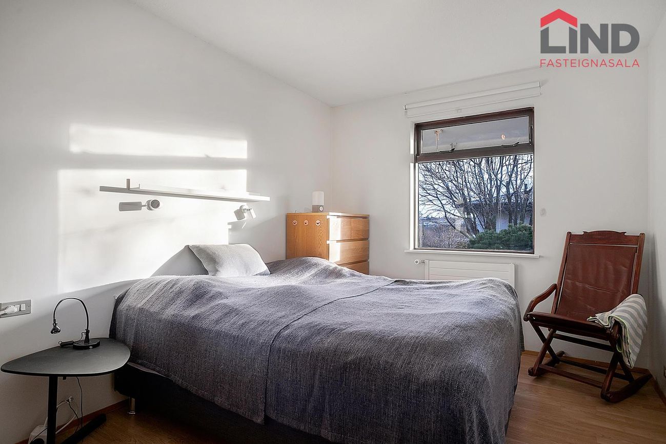 Tvö svefnherbergi eru á hæðinni, stórt herbergi með góðum gluggum mótti suðri annarsvegar og herbergi inn af forstofu hinsvegar.