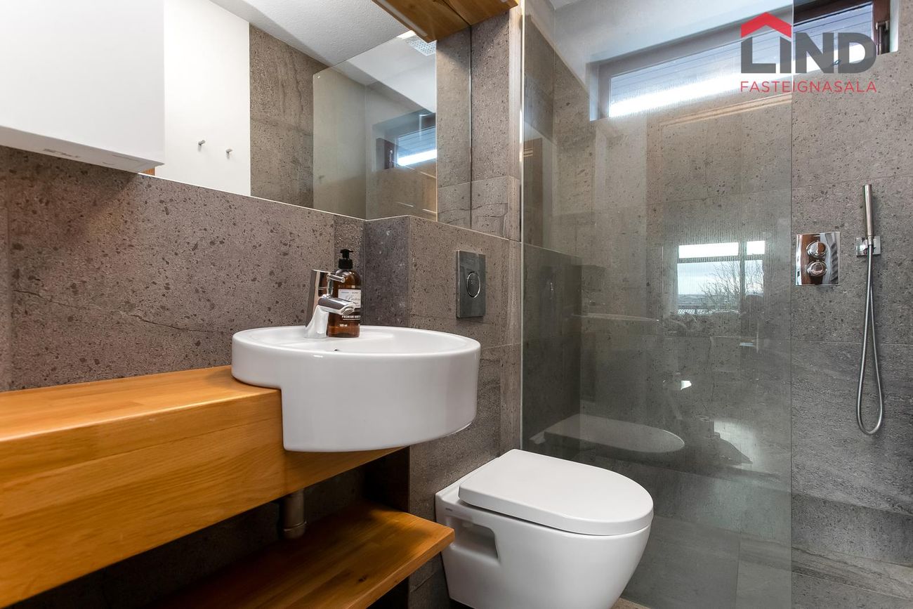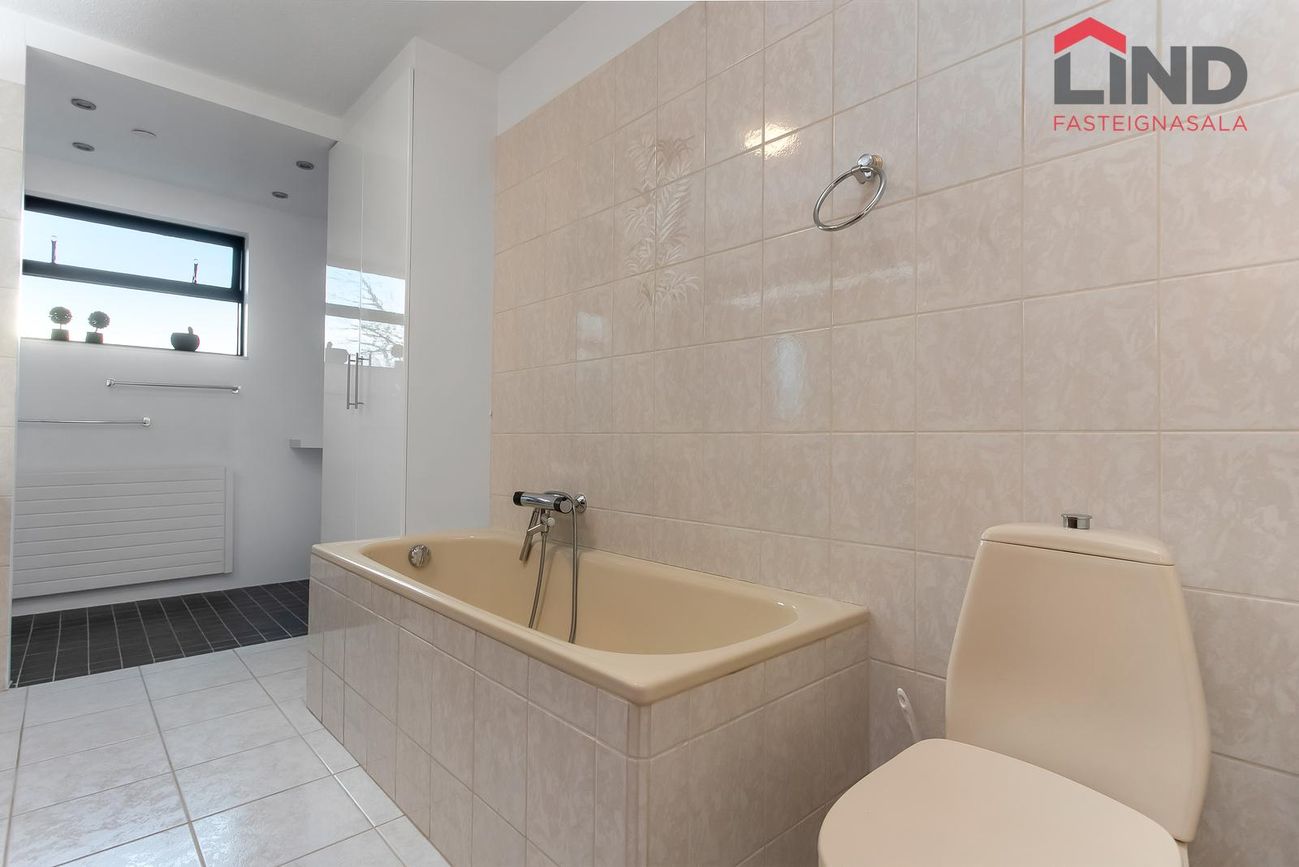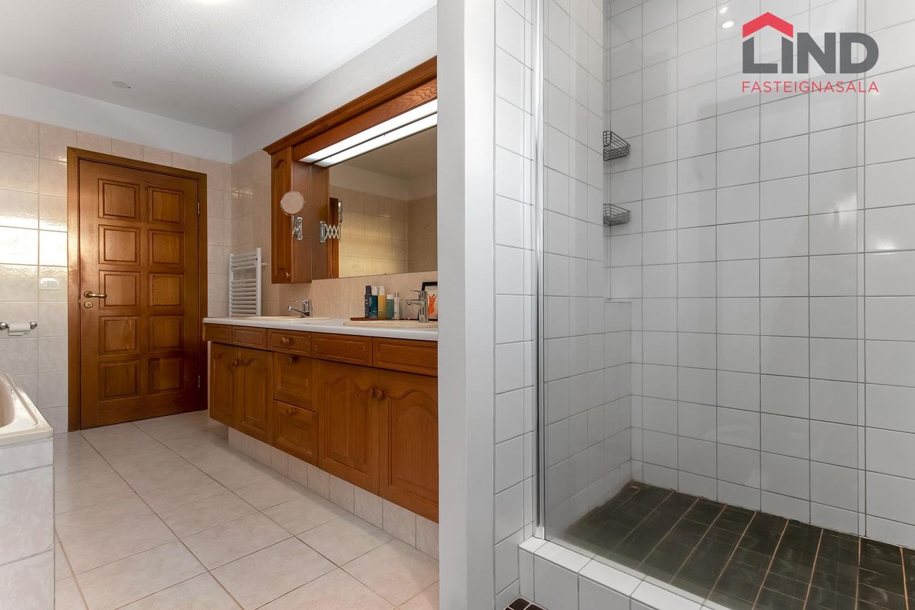 Baðherbergi er rúmgott flísalagt með sturtuklefa, baðkari, innréttingu með tveimur handlaugum og góðum skápum, glugga með opnanlegu fagi og hurð út á pallinn en þar er tilvalið að vera með heitan pott.