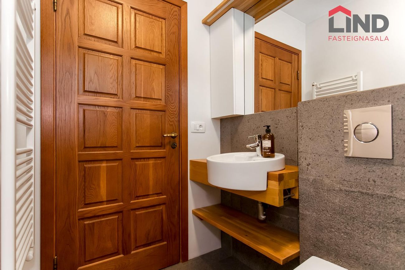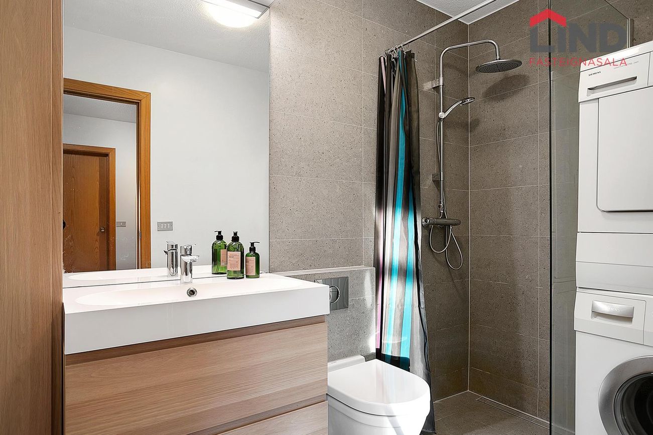 Baðherbergið var endurnýjað 2018. Það er flísalagt, með innréttingu, sturtuklefa, upphengdu salerni og tengi fyrir þvottavél.