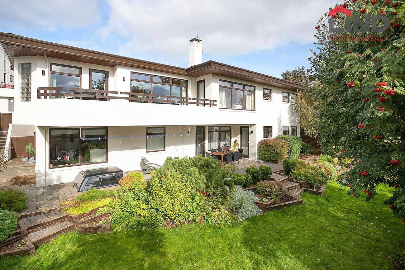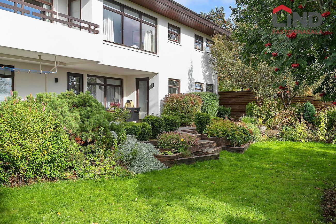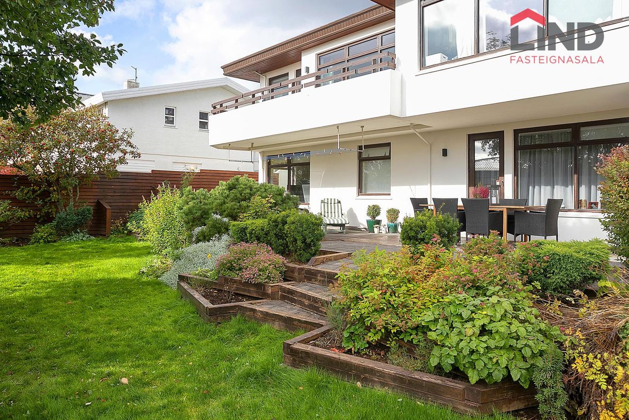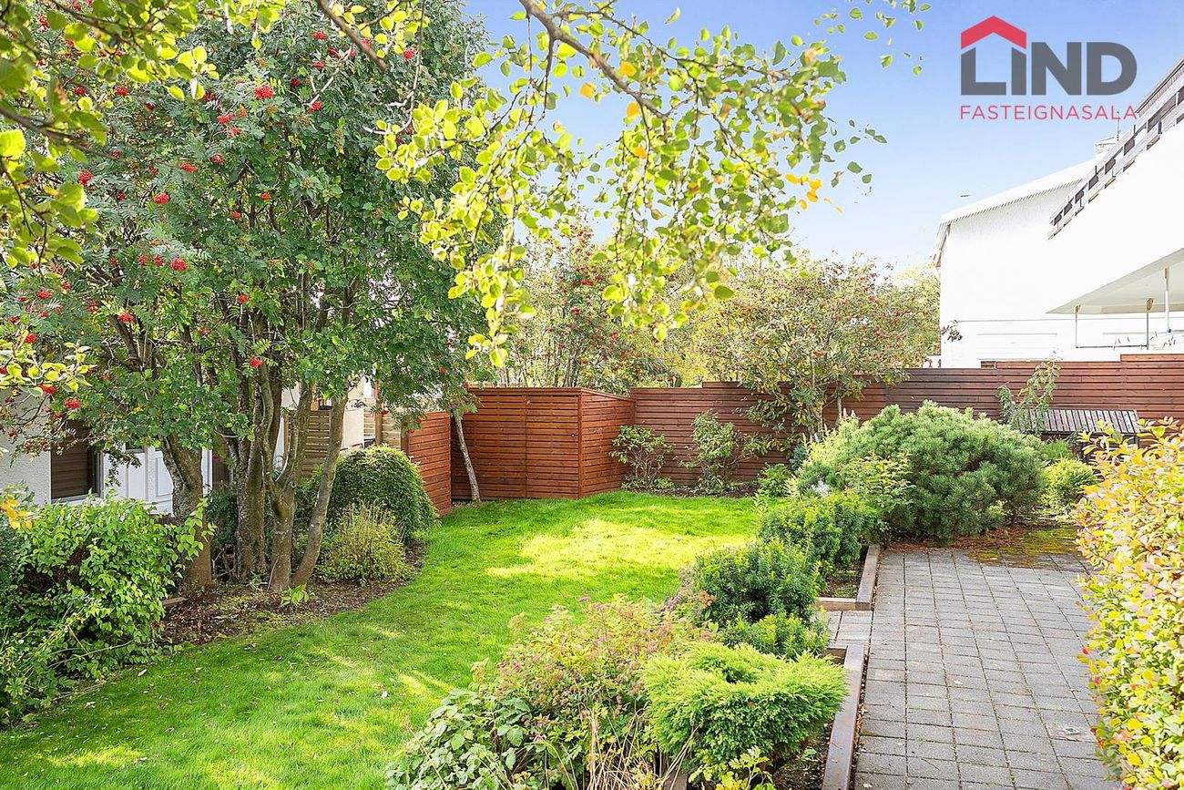 Garðurinn er gróinn og afgirtur bæði austur/vestur hlið og því afar skjólsæll. Verönd meðfram húsinu til suðurs er hellulögð/ timbur en garðurinn er gróinn og fallegur. Stór útigeymsla sem tilheyrir efri íbúðinni er í garðinum en hún rúmar vel garðhúsgögn og hjól yfir veturinn. Húsið hefur alla tíð fengið gott viðhald, verið málað reglulega og virðist í góðu ástandi Viðhald/endurnýjun