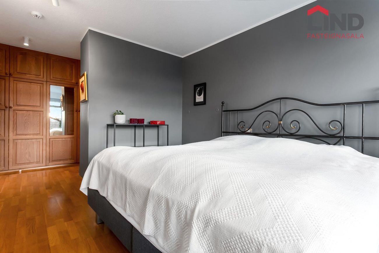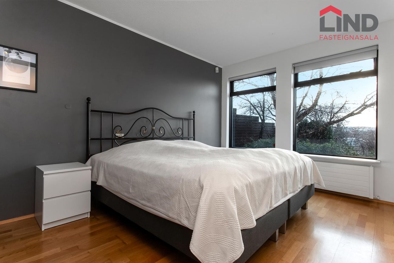 Hjónasvíta er sér rými með gangi með miklu skápaplássi, herbergið er stórt með fataherbergi með lokuðum skápum, góðum gluggum sem snúa út í garðinn.