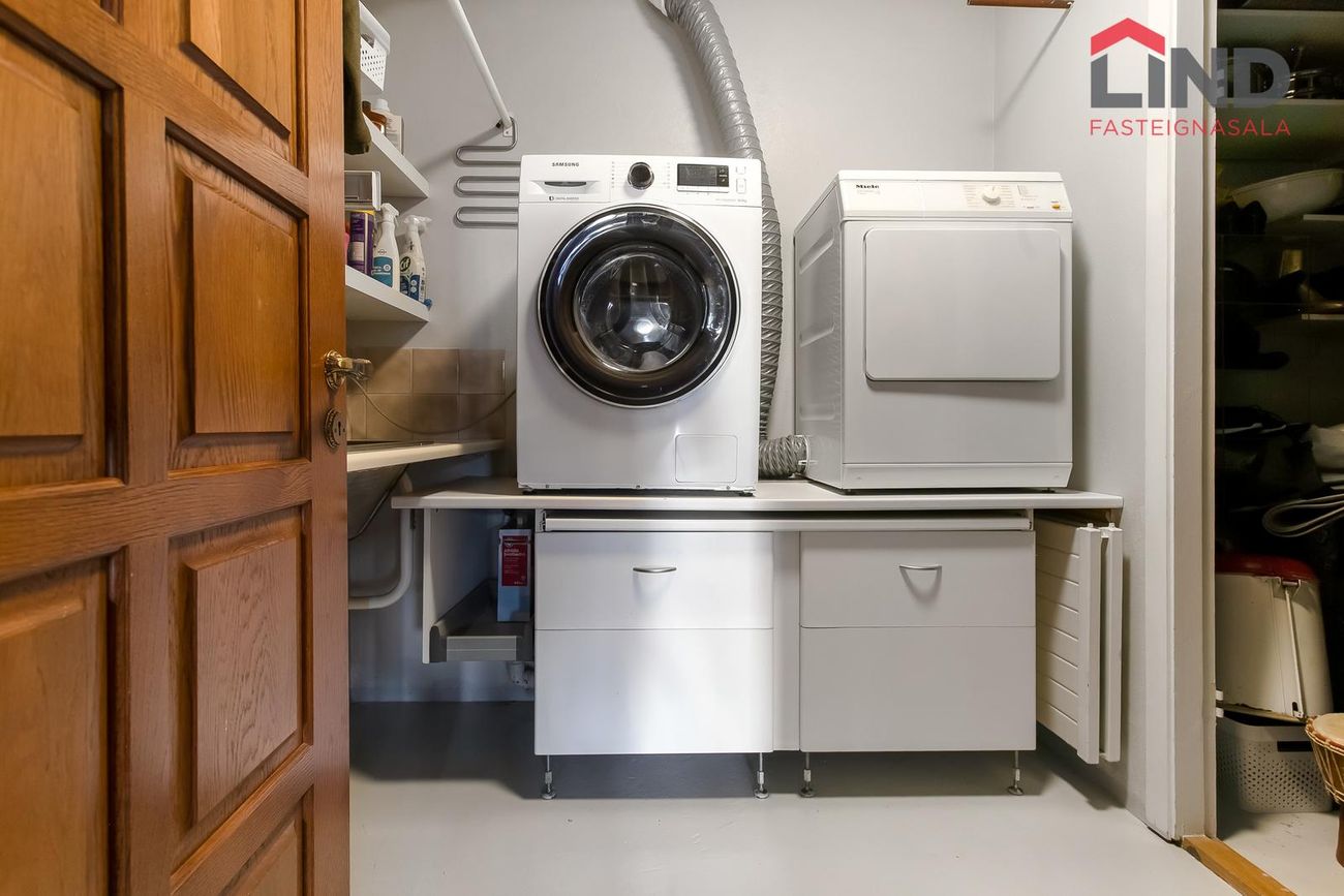 Þvottahús og geymsla eru á neðri hæðinni, þar er innrétting fyrir vélar í vinnuhæð, bekkur með vaski og góðri vinnuaðstöðu.